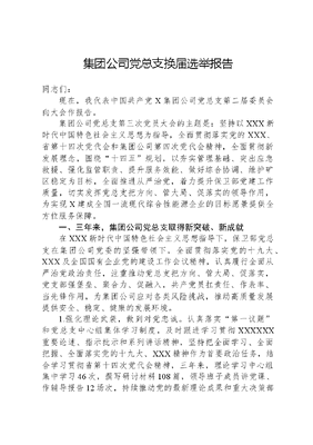 集团公司党总支换届选举报告同志们:现在,我代表中国共产党X集团公司党总支第二届委员会向大会作报告。集团公司党总支第三次党员大会的主题是:坚持以XXX新时代中国特色社会主义思想为指导,全面贯彻落实党的XXX、省第十四次党代会和集团公司第四次党代会精神,全面贯彻新发展理念,围绕十四五规划,以夯实管理基础、突出应急救援、强化监管职责、提升服务效能、做好综合协调、维护矿区稳定为目标,全面推进从严治党,着力提升保卫部党建工作质量,切实发挥党总支把方向、管大局、促落实的领导作用,为实现X建成全国一流现代综合性能源企业的目标愿景提供全方位服务保障。一、三年来,集团公司党总支取得新突破、新成就在XXX新时代中国特色社会主义思想指导下,保卫部党总支在集团公司党委的坚强带领下,全面贯彻落实党的十九大、XXX及全国国有企业党的建设工作会议精神,认真履行全面从严治党政治责任,注重推动党总支把方向、管大局、促落实,党支部强堡垒、聚合力、促融入,共产党员扛责任、作表率、当先锋作用,为集团公司应对各类风险挑战,推动高质量发展提供安全、稳定、健康的发展环境。1.强化理论武装,做到对党忠诚。认真落实第一议题和党总支中心组集体学习制度,及时跟进学习贯彻XXXXXX重要论述、指示批示和系列讲话精神,坚持把全面学习、全面把握、全面落实党的十九大、XXX精神作为首要政治任务,结合学习贯彻省第十四次党代会精神,三年来,理论学习中心组集中学习46次,撰写研讨材料108篇,领导班子成员讲党课、作辅导报告12场次,持续推动党的最新理论成果和重大决策部署、重要会议精神落地生根,不断引领广大党员干部和职工群众从党的百年奋斗历程、伟大建党精神中汲取团结奋斗的智慧力量。2.强化政治担当,优化职能定位。牢固树立抓好党建是本职、不抓党建是失职、抓不好党建是不称职的工作理念,强力推进十化工作要求和五到工作法,推动传统保卫、护卫职能向应急救援转变。三年来组织开展5场348人次的应急演练活动,深刻掌握了应急救援知识与提升应急处置专业素养。强化三讲一守的压舱石作用,在主动融入规范管理、维稳处突、安全保卫等重大任务中,切实将矿区重点上访人员稳控在当地,制定了专项维稳安保工作实施方案,实施24小时稳控,实现了近10年来首次将重点人员稳控在当地的目标,为党的XXX胜利召开铺垫了稳定的政治环境;安保执勤任务30场,491人次,确保了大型会议活动顺利开展,切实担负起集团公司建成全国一流现代综合性能源企业保驾护航的安全保卫力量。3.强化作风建设,夯实发展根基。部党总支以坐不住的紧迫感、慢不得的危机感、等不起的责任感意识,把工作往前做、把进度往前赶。全力将党的十九大、XXX和省第十四次党代会精神体现在发挥安全监管、提质增效主力军、排头兵作用的举措上,聚焦深入开展强党性、转作风、勇担当、抓落实活动和严格落实党建工作责任制,充分发挥考核指挥棒风向标作用。三年来,月度党建考核25次,整改落实156项问题,形成了月度点评、季度考核、年度述职的党建工作新体系,确保责任贯通、双向落实反馈。同时,部党总支认真整改落实集团公司党委巡察组指出的34项问题,并以100%的整改率高质量通过了集团公司党委第三轮巡察督改评估组考核验收;坚持述职评议考核,通过双向评价、一票否决,将考核结果作为绩效考核、评优评先、培养使用的重要依据,坚定用发展成果检验管党治党成效。三年来,党支部书记述职考核3次,第一党支部连续三年取得了优秀党支部的荣誉;坚持民主集中制,在执行三重一大决策和涉及职工群众切身利益的问题上,尊重班子成员的意见建议,充分发挥了班子整体合力。三年来,部党总支累计公示公开94项内容,其中,对涉及政治建设5个方面的事项、队伍建设15个方面的事项进行了公示,对涉及组织建设26个方面事项、经营管理6个方面事项、职工利益2个方面事项、党费收缴情况等内容进行了公示。坚持作风建设,以干部在工作作风上存在的11个方面主要问题研讨为契机,深入开展检视批评,18名党员干部,忆苦思甜,对标检视、深刻转变工作作风。二、持续推动党的领导融入规范管理各环节引领发展一是科学民主决策防风险。全面规范落实党总支前置研究讨论重大事项程序,推动党的主张和重大决策转化为规范管理的具体行动。三年来,聚焦国企改革三年行动要求和对标世界一流企业目标,坚持以加强党的建设为统领,推进党的领导融入治理制度化规范化程序化。细化完善党总支前置研究讨论和研究决定重大事项46项,推动前置研究事项清单接地气见实效,有效提升前置研究事项清单的针对性、操作性。完成优化健全制度23项,有力推动党总支议事清单和《X集团公司保卫部首问负责制》等一批制度机制落实落地,让党的领导更好地融入决策、执行、监督各环节全过程。二是全面深化稳定激活力。部党总支坚持以夯