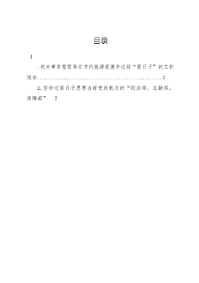 目录1.机关事务管理局在节约能源资源中过好紧日子的工作报告.22.坚持过紧日子思想当好党政机关的经济部、后勤部、保障部7机关事务管理局在节约能源资源中过好紧日子的工作报告节约能源资源是生态文明建设的重要组成部分,是推进碳达峰碳中和、促进高质量发展的重要支撑,更是落实坚持勤俭办一切事业要求的重要举措。市机关事务管理局始终坚持绿色发展、勤俭节约的理念,把厉行节约、反对浪费、提高资金使用效益作为一项重要的政治任务,在教育宣传引导、建筑节能改造、示范单位创建、督查检查整改等方面持续深挖潜力、降本增效,着力降低机关运行成本,把经费集中安排在保基本、保运转、保稳定上,切实发挥好党政机关表率作用。一、宣传引导打头阵,不断提升节约能源资源意识一是明确宣传任务。制定印发了《xx市深入开展公共机构绿色低碳引领行动任务分解表》,完善各成员单位职能职责,形成了纵向联动、横向协调、执行有力、高效顺畅的运行体系,特别将节能宣传列为重点任务之一。二是加强日常宣传。利用单位电子屏循环播放、单位微信群提醒、重点场所摆放展板、发放宣传资料等不同方式,广泛宣传过紧日子、厉行节约反对浪费等相关政策,在食堂张贴反食品浪费相关政策和标语,引导单位人员树立节约意识。三是突出宣传重点。利用全国节能宣传周、垃圾分类宣传周、世界水日、中国水周、世界粮食日、六五环境日、生态日等契机,通过各种形式广泛开展相对应的主题宣传活动。联合相关单位组织开展节能进机关、进学校、进社区等集中宣传活动,确保宣传工作横向到边、纵向到底、不留死角,在基层取得实实在在的效果。市行政中心优化专线班车xx条,践行xxx出行方式。各县区、各部门积极响应,通过发放倡议书等形式开展宣传,并积极开展各类能源紧缺体验和绿色低碳出行活动,动员广大干部职工以低碳的办公模式和出行方式体验能源紧缺。二、勤俭节约见行动,不断提升能源资源利用效率一是垃圾分类创效益。印发《关于深入推进全市公共机构生活垃圾分类和资源循环利用示范工作的通知》,开展市级垃圾分类示范点建设,促进低价值可回收物、废旧电器电子产品等物品循环利用。xxxx年,全市各级公共机构垃圾分类回收累计xxxx次,共回收各类废弃电器电子类产品xxxxx台,废旧桌椅xxxxx套,废铁xx吨,废旧纸张xx吨及其他可回收物若干,取得了较好的经济效益和社会效益。二是餐饮浪费抓源头。把制止餐饮浪费作为首要原则,会同市发改等部门制定《xx市推进粮食节约减损意见》,将制止餐饮浪费列入《xx市深入开展公共机构绿色低碳引领行动任务分解表》,线上线下推进光盘行动宣传,及时取缔餐饮浪费严重的社会化午餐点。市行政中心食堂与外包服务单位签订《食品节约责任书》,深化机关食堂小份餐模式改革,日均餐余垃圾下降xx%,新模式得到市财政局、市场监督局等院外机关食堂争相效仿。三是示范创建树榜样。充分发动各级各类公共机构积极参加国家级、省级各项节能示范创建,发挥示范典型作用。全市创成国家公共机构能效领跑者x个,国家节约型公共机构示范单位x个,xx省公共机构能效领跑者x个,xx省公共机构节能低碳示范单位xx个,全市建成节约型机关xxx家,节约型机关创建率达xx%。xx市经济技术开发区管理委员会通过能源管理体系认证,未来还将推动xx市中级人民法院、xx区行政中心等单位进行能源管理体系认证工作,不断优化能源资源的使用管理,提升使用效能。三、技术改造促提升,应用科学手段节约能源资源一是全面系统分析制方案。充分利用全省公共机构节能管理一张网平台,全面夯实公共机构基本情况、能耗数据等基础信息,掌握单位实际用能情况,对xxxx年度单位建筑面积能耗超约束值单位xxx家,进行全面梳理,分析原因,按所属县区、所属系统进行分类,加强指导、抓好整改。通过节能改造,xxxx年度单位建筑面积能耗超约束值公共机构数量下降到xx个,下降率达到xx%,全市公共机构人均综合能耗同比下降xx%、单位建筑面积能耗下降xx%、单位建筑面积碳排放量下降xx%。二是推动分布式光伏项目。印发《xxxxxx市深入开展公共机构绿色低碳引领行动任务分解表》,明确各县区、各部门加快推动分布式光伏项目。xx区、xx区、xx县以整县(区)推动分布式光伏项目,目前,利用社会资本投资约xxxx万元,建成装机容量xxxxKW的光伏屋顶,年发电量xxx万度,年节约xxx吨标准煤,减排二氧化碳约xxx吨。三是推广可再生能源替代。市行政中心食堂后勤热水系统,将电加热系统改造成空气能加热系统,设备维护费用节省约xw/年,用电量由之前每年xx万度降低为现在x万度,能耗下降x%;市第一人民医院将冷凝水回收利用,既节约大量能源,又节约水资源;市第二人民医院使用高效发