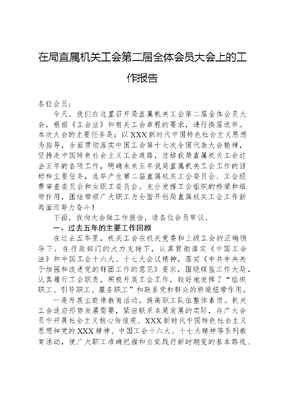 在局直属机关工会第二届全体会员大会上的工作报告各位会员:今天,我们在这里召开局直属机关工会第二届全体会员大会,根据《工会法》和有关工会章程的要求,进行换届选举。本次大会的主要任务是:以XXX新时代中国特色社会主义思想为指导,全面贯彻落实中国工会第十七次全国代表大会精神,坚持走中国特色社会主义工会道路,总结我局直属机关工会过去五年的各项工作,明确未来五年我局直属机关工会工作的目标和主要任务,选举产生第二届直属机关工会委员会、工会经费审查委员会和女职工委员会。充分发挥工会组织的桥梁和纽带作用,团结带领广大职工为全面开创局直属机关工会工作新局面而努力奋斗!下面,我向大会做工作报告,请各位会员审议。一、过去五年的主要工作回顾在过去五年里,机关工会在机关党委和上级工会的正确领导下,在行政部门的大力支持下,认真贯彻落实《中国工会法》和中国工会十六大、十七大会议精神,落实《中共中央关于加强和改进党的群团工作的意见》要求,围绕煤监工作大局,认真履行工会职责,积极开展工会工作,较好地发挥了组织职工、引导职工、服务职工和联系党和群众的桥梁纽带作用。一是开展主旋律教育活动,提高职工队伍整体素质。机关工会适应形势发展需要,紧密联系本局发展的实际,在广大会员中开展社会主义核心价值观、XXX新时代中国特色社会主义思想和党的XXX精神、中国工会十六大、十七大精神等系列教育活动,使广大职工准确把握和自觉践行新时期党的基本路线、方针政策,牢固树立四个意识,增强四个自信,做到两个维护,始终在思想上政治上行动上与以XXX同志为核心的党中央保持高度一致,听党话、跟党走。配合机关党委加强职工思想教育,倡导爱岗敬业、无私奉献的职业精神,帮助职工树立正确的世界观、人生观、价值观。如组织干部职工观看《焦裕禄》、《厉害了,我的国》、《邹碧华》、《黄大年》等影片,成为宣传和弘扬劳模精神的新阵地,达到了预期效果。二是贯彻《全民健身计划纲要》精神,以丰富多彩的文体活动推动和谐机关建设。体育强则中国强,开展全民健身工作是工会工作的重要组成部分,也是我局精神文明建设和创新文化建设的重要内容。五年来,在职工参与文体活动方面,机关工会认真贯彻《全民健身计划纲要》精神,贯彻执行业余自愿、形式多样、健康有益、勤俭节约的原则,把开展有益于职工身心健康的文体活动作为大事来抓,举办了乒乓球培训班,成立了吉林煤监长马悦跑队,开展了篮球、乒乓球、徒步比赛,组队参加了2023年省直机关职工乒乓球赛,获得省直工会工委颁发的精神文明奖,为我局争得了荣誉。为丰富干部职工业余生活,缓解工作压力,在局领导大力支持下,我们组织职工到净月潭春游,春游不仅让大家从繁忙的工作中抽出身来投入大自然的怀抱,放松心情,锻炼身体,更为大家的相互交流,增进感情搭建了很好的平台。每年的元旦春节期间,我们都组织棋牌比赛,猜谜语活动,每年的棋牌比赛、猜谜语活动已经成为机关工会的一项传统节目,丰富职工业余生活的同时,增进职工之间的交流与合作,促进了大家相互间的友谊,深受职工的喜爱。三八节组织女职工看电影、参观长影旧址博物馆、送节日蛋糕等活动。通过开展有益于职工身心健康的文体活动,把有不同爱好的干部职工都吸引进来,形成了积极参与、促进交流、活跃氛围、展示风采的良好氛围,尽最大努力满足职工精神文化需求,促进了和谐机关建设。三是关爱困难职工,持续开展送温暖活动。局机关工会认真履行对困难职工的帮扶工作,积极为困难职工排忧解难,制定了五必访制度,工会开展五必访活动,即是工会维护职工合法权益的主要组成部分,也是关心和维护职工合法权益的具体体现。五年多来,工会看望慰问职工本人因病住院、父母去逝和生活困难职工64人次,发放慰问金5.03万元,职工结婚生子,工会都会慰问,送去组织的关心和祝福。局工会还积极开展金秋助学、困难职工生活大检查活动,五年来,为本人或家属生大病造成家庭生活困难的职工36人次向省直工会工委争取到金秋助学补助金3.7万元,为本人或家属生大病造成家庭生活困难的职工99人次向省直工会工委争取到两节期间困难职工补助金9.9万元。送温暖活动已经成为局工会的一项常态工作,受到了职工的好评。四是关心职工生活,积极为职工搞福利。在局领导的大力支持下,局机关工会深入研究上级工会有关文件精神,主动协调沟通,积极落实职工福利,每到端午、中秋、春节传统节日为职工发福利物品。局工会还十分关心单身青年职工的生活问题,组织单身职工参加省直青年职工联谊活动。使职工切实感受到集体的关心和温暖,增强了工会的凝聚力。二、存在的问题和几点体会全面总结多年来机关工会工作,在充分肯定工作成绩的同时,我们还应当看到存在的一些问题和不足,一是工会任期届满没有及时换届;二是未按规定向会员收取会费;三是职工没有活动场所;四是开展集体