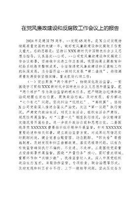 在党风廉政建设和反腐败工作会议上的报告2024年是建国75周年、××发现65周年,是X公司实现持续高质量发展的关键一年,做好党风廉政建设和反腐败工作意义重大。总的思路是:坚持以XXX新时代中国特色社会主义思想为指导,认真落实××公司、××公司党风廉政建设和反腐败工作会议部署,坚持稳中求进工作总基调,巩固拓展主题教育和纪检系统教育整顿成果,全面推进党风廉政建设和反腐败工作向纵深发展,为全面开启××新时代发展第二曲线,持续高质量发展提供坚强保障。重点抓好六项工作:(一)突出聚焦两个维护,持续深化政治监督。一要围绕学习贯彻XXX新时代中国特色社会主义思想开展监督,把两个维护作为政治监督的根本任务,把严明政治纪律和政治规矩摆在突出位置,聚焦政治忠诚,及时发现、着力解决七个有之问题,坚决纠治低级红、高级黑。协助X公司党委深入推进全面从严治党,关注第一议题执行情况,严肃党内政治生活,对民主生活会、组织生活会严肃性、规范性开展监督;对三重一大制度执行情况,会议精神落实情况等开展检查,进一步提升政治自觉和思想自觉。二要围绕落实XXXXXX重要指示批示精神开展监督,针对XXXXXX重要论述和相关部署,建立政治监督方案,对成果运用情况实时跟踪问效,健全完善台账管理、动态跟踪、回头看等措施制度,及时发现和纠正曲解政策、落实迟缓等问题,以有力有效监督确保执行不偏向、不变通、不走样。三是围绕党委重点安排部署开展监督,围绕产量任务核心,紧盯重点领域、重要环节和关键少数,找准监督切入点,深入开展党组织政治生态X析,采取协作监督、专项检查、联合治理等形式,及时发现和纠正有令不行、上下一般粗等问题,坚决压实各方责任,检验任务落实效果,确保政令畅通、步调一致。四是围绕各级一把手和领导班子开展监督,深化领导干部政治家访,推动内容更具体、载体更多样,督促既严以律己、严格用权,更严负其责、严管所辖。指导各单位纪检委员发挥职能,综合利用列席会议、日常监督等方式,加强对领导干部党章党规党纪执行情况的监督检查,严格督促各项制度落实见效。(二)加快提升各类监督质效,深入推进全面从严治党向纵深发展。一是推动全面从严治党主体责任落实到位,牢牢把握关于党的自我革命的重要思想,不断深化对九个以实践要求的认识把握,结合X公司实际,协助X公司党委梳理全面从严治党主体责任清单,细化各级党组织责任任务,发挥专职监督职能,利用党建责任制检查等形式,推动主体责任落实。坚持问题导向,加大约谈和责任追究力度,对发生系统性风险以及违法违纪行为的,要倒查追究党组织责任,以严肃问责促履责担责。二是筑牢常态化监督防线,充X发挥反腐败领导小组、协调小组作用,健全重点监督事项向党委常态化报告、系统问题向业务部门横向推送、具体问题向所属单位及时通报的工作机制,推动各级党组织知责明责更清晰;通过责任联动,压力传导,推动各级党员干部履职尽责更有力;通过监督考评,责任追究,推动考责问责更有效。三是深化纪委监督与业务监管融合共促,以问题为导向,将工会业务、招投标管理、物资采购、后勤管理等业务纳入重点关注范围,特别是对问题相对突出、群众关注度较高的环节,协同机关职能部门同步聚焦、同向发力,实现纪委监督和业务部门监管的有效叠加和贯通。四是积极融入红色网格治理模式,将监督执纪教育纳入红色网格治理,推动清廉责任、纪法教育、监督检查、提示提醒四个到网格。各级网格长、网格员要主动担责履责,深入研究16+12、AB班工作制特点,关注员工休息期间生活状态和思想动态,持续加大《X公司员工八小时以外行为规范监督管理办法》的执行力度,常态化开展黄赌毒和酒醉驾等涉法问题的专项教育,保障每名员工行稳致远。五是扎实做好整改后半篇文章,对××党委巡察、专项审计、新时代岗检发现的问题,对已经完成整改的督促提醒责任单位举一反三,常抓常讲,防止问题反弹;对长期整改和持续坚持的重点问题跟踪督办,确保回头看高质量推进;对回头看中发现的敷衍了事、消极整改的单位和个人严肃追究责任,确保整改落实到位。(三)突出铲除腐败土壤条件,深化正风肃纪反腐。一是坚持正风肃纪反腐永远在路上,注重惩治结合,严管厚爱结合,紧盯权力集中、资金密集领域,关注关键岗位,严肃查处靠企吃企、围猎受贿、失职渎职、侵害群众利益以及新型隐性腐败等行为。联合业务部门加大对违反劳动纪律、违规使用薪酬奖金等影响面大、容易造成不稳定因素问题的检查力度,畅通群众反映渠道,延伸业务监督检查触角,对出现的单位及个人,坚决追究相关责任,从严处理。二是拓展反腐败工作深度广度,强化以案促改、以案促治,深入开展个案剖析和类案X析,结合查处的典型案件,针对行业、系统内共性问题提出纪律检查建议,完善闭环监督管理机制。规范运用四种形态,