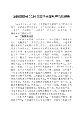 发改局局长2024年履行全面从严治党报告2024年以来,在市委、市政府的正确领导下和市纪委的指导下,我严格按照党要管党、从严治党的要求,牢固树立四个意识,严格落实一岗双责,严于律己、以身作则,现将有关情况报告如下:一、工作开展情况(一)从严抓管党、抓思想情况。始终坚持抓住领导干部这个关键少数,层层压实责任、级级传导压力。一是认真履行全面从严治党第一责任人责任。上半年组织召开全面从严治党工作会议X次,坚持对全面从严治党负总责,做到重要工作亲自部署、重大问题亲自过问、重点环节亲自协调,按照制度之内不缺位、制度之外不越位的原则,扎实推进业务工作,制定了《2024年全面从严治党任务清单》和《2024年全面从严治党责任清单》,压实一岗双责责任。二是强化理论武装,打牢思想根基。坚持对重大决策部署必传达、必研究、必贯彻、必落实,上半年以来重点学习了《……》等内容。同时,抓牢抓实党员教育,用活用足本地红色资源。组织党员干部前往红色教育基地开展党史现场教学,进一步增强党员干部的责任感和使命感。三是抓好党风廉政建设。上半年组织召开党风廉政建设专题部署会议X次,研究局党风廉政建设形势,以负首责、负主责、负全责的政治自觉发挥表率引领作用,坚持思想教育经常化、制度化,广泛开展谈心谈话,积极引导党员干部树立正确的政绩观、价值观、权利观,重点聚焦审批、项目等重点岗位人员开展谈话警示教育X人次,对新提拔干部等开展任职谈话,切实提高了局党员干部廉洁自律意识。(二)从严抓执纪、抓治吏情况。一是加强纪律教育。重视源头预防,严格落实中央八项规定精神,实施党风廉政分级防控机制,紧盯重要节点,加强逢年过节、婚丧嫁娶、子女升学、职务调整等重要节点的廉洁自律监督检查。今年以来,累计对岗位廉政风险点进行了X次梳理,确保无遗漏、无死角。二是强化执纪问责。一方面积极运用监督执纪四种形态特别是第一种形态,让红脸出汗成为常态;另一方面积极配合上级巡察、监督等工作,支持纪委监督执纪。三是严明选人用人纪律。严格执行《党政领导干部选拔任用工作条例》,在干部选任工作中,坚持公开、公平、公正,接受全局干部职工的监督,增强人事工作的透明度和公信力。四是认真贯彻执行民主集中制。严格落实三重一大议事规则,上半年以来,召开涉及三重一大事项党组会X次,涉及X个事项。(三)从严抓作风、抓反腐情况。一是推动作风持续转变。重点针对形式主义、官僚主义突出问题开展专项查摆,制定《形式主义官僚主义问题及措施清单》并认真整改到位。二是坚持警钟长鸣。开展多种形式的警示教育,组织全局机关干部观看了警示教育片,深入学习了,并组织学习《中国共产党纪律处分条例》,增强警示教育实效,严防七个有之,做到五个必须、五个决不允许。三是持续加强意识形态工作。上半年召开X次意识形态工作分析研判会议,确保了意识形态领域可稳可控。加强网评员、通讯员队伍建设,坚持以团结稳定鼓劲、正面宣传为主为原则,创新宣传工作方式方法,在门户网站和微信公众号推送宣传稿件X篇,进一步唱响了主旋律、弘扬了正能量。(四)从严抓项目、抓进展情况。坚持以党建统领凝心铸魂,提升攻坚克难精气神,为投资持续增长提供行动保证,助力全市实现突破发展。一是常态化三述提高工作质效。结合三会一课、主题党日等,广泛开展理论政策学习。树立问题导向,改变以往台上述,台下听传统模式,在项目建设现场开展抓项目、促投资专题三述,将述政策和述典型相结合,学习借鉴先进做法,现场研究破题之策,起到文可居文库——海量学习资料,手机电脑均可下载www.wenkeju.com解决一个,带动一片的效应,为项目投资按下快进键。二是做好调研,助推项目发展。今年4月份组织开展进项目现场、促项目建设活动,开展实地调研工作,X余名党员干部深入X个项目建设现场,具体分析当前投资结构、项目立项等方面的问题,全面梳理我市产业链发展情况,详细了解企业所处产业的发展情况、产业的上下游分布和企业发展需求,助力项目纳统和建设落地。三是立足工作实际为群众办好实事。解放党员干部思想,扩展抓项目、促投资的方法和思路,充分发挥党员的先锋模范作用,同时畅通为民服务热线,2024年上半年,我局通过12345为民热线、市长信箱、电话咨询等渠道共受理为民服务热线投诉和咨询多少件,办结率100%,满意率100%。增加热线办理人员,做好受理案件专人运转、专人盯办、专人报送,明确任务目标和时间节点,以最高效率解决民生难题。二、存在的问题在学习和工作中,我也发现了自身的一些不足。一是开展党风廉政建设常规动作多,创新内容少。在平时工作中,大部分精力用在了抓经济指标等工作上,对党风廉政建设工作深入研究较少,缺乏深入系统的思考和谋划,仍然满足于抓学习、搞宣传、建阵地等常规工作,