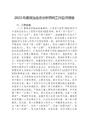 2023年度政治生态分析研判工作自评报告一、工作总结(一)聚焦恪守政治忠诚情况。认真学习宣贯XXX新时代中国特色社会主义思想和党的XXX精神,树牢四个意识,坚定四个自信,做到两个维护,持续教育引导党员干部在政治立场、政治方向、政治原则、政治道路上自觉同以XXX同志为核心的党中央保持高度一致,始终做到对党忠诚。严格落实《党委第一议题制度》,制定《2023年理论学习安排意见》,通过第一议题、党委理论学习中心组学习等抓实政治理论学习。认真组织开展学习贯彻XXX新时代中国特色社会主义思想主题教育,严格将理论学习、调查研究、推动发展、检视整改、组织领导贯穿始终,做到抓思想认识到位、抓检视问题到位、抓整改落实到位、抓组织领导到位,以五个先行一步的经验做法保证了主题教育扎实有序开展。按规定程序召开专题民主生活会、组织生活会,将党的新思想新理论转化为推动工作的强大动力。分批级举办12期学习贯彻XXX精神培训班,830余名党员管理人员参加培训。坚持民主集中制,公司领导班子成员坚持讲大局、讲团结、讲担当,工作中做到了大事讲原则、小事讲风格,相互补台不拆台,密切协作促发展,建立了党委书记与分管领导定期沟通交流机制,加强班子之间的协调配合,增强了班子的凝聚力。严明党的政治纪律和政治规矩,严格执行重大事项请示报告制度,牢牢把握两个一以贯之要求,修订党委会议事规则,完善三张清单,明确研究决策、前置研究讨论等126项内容,确保党的领导融入公司治理各环节。扎实抓好各级巡察、审计等问题整改,把巡察、审计问题整改工作作为一项重要政治任务,突出四个导向,抓实三张清单,实施挂图作战,做到五个明确,有力有序推进,各类巡察、审计问题已全部整改完毕。(二)聚焦突出政治标准选人用人情况。树牢正确选人用人导向,严格四个注重选拔、四个坚决不用,严把党员干部政治关、廉洁关,杜绝出现任人唯亲、带病提拔、领导干部违规兼职等现象。严守组织纪律规矩,在干部事前报告、事后报备等方面均按程序落实,做到了严格按照干部任用标准和规定程序开展选拔任用工作。扎实推进年轻干部培养工程,紧盯年轻干部做好任前教育,将党规党纪教育纳入必修课,讲好履职第一课。实施13510培养储备计划,不断优化管理技术人员队伍年龄结构层次,在井下生产一线区队设置了5名主管工程师岗位,同区队正职人员同职级管理,进一步激发了青年人才、年轻干部干事创业的热情。明确年轻干部培养专项措施,实施基层墩苗式历练,安排X名高校毕业生、技术人员进入基层区队班组岗位实习锻炼,进一步夯实业务工作基础;实行机关、基层双向交流、综合培养管理,采取适宜岗位调整、挂职锻炼、岗位轮换等方式,对缺少基层工作经验或岗位经历单一的年轻干部,选派到基层一线不同的岗位挂职锻炼,进一步丰富工作经历,提高处事办事水平,对X名90后年轻干部进行了岗位调整;推行大学生进班组,安排X名大学生深入班组一线,每月不少于X天参与X生产一线等现场施工,在实践岗位上学标准、打基础、积经验、增才干,大学生业务水平得到明显提升,其中X人走向副科级及以上岗位,X人走向技术员岗位。深化双培养工程。推进党务、经营专业与安全生产双向交流,调整岗位轮换锻炼X人,打造复合型管理人员,逐步实现管理干部队伍结构与公司发展所需的人才支持相匹配。坚持实干实绩,把敢不敢扛事、愿不愿做事、能不能干事作为评判干部优劣的标尺,畅通干部能下的机制,完善管理人员年度考核办法,明确末等不胜任标准条件,完成对X个管理干部的年度考核,强化考核结果运用,平级调整岗位X人、免职X人。文可居文库——海量学习资料,手机电脑均可下载www.wenkeju.com(三)聚焦保持清正廉洁政治本色情况。认真贯彻执行党风廉政建设责任制和廉洁自律相关规定,深入落实中央八项规定及其实施细则精神。开展纪律作风整治行动,领导班子带头学习摆查,提认识、强纪律,班子成员及副科级以上干部X人进行了集中学习和摆查交流,开展大讨论X场次,形成查摆问题清单X份,摆查问题X条。以抓党风﹑强作风﹑促行风建设为抓手,开展了党风政风行风满意度测评,促进各级管理人员提神、提标、提质、提速、提效。全面开展岗位廉洁风险排查,建立廉洁防控台账X项,构建了日常监督、专项监督、联动监督三位一体的监督格局。集中开展靠企吃企问题专项整治,从工程建设、物资采购等X个方面整治重点出发,排查廉洁风险点X条,制定整改措施X项。深入开展基层治理不良现象及不担当不作为假作为乱作为问题专项整治,聚焦X方面X条整治重点,全体党员干部开展了自查自纠,制定了整改落实措施。深入推进反腐败斗争,惩治腐败高压态势持续保持,召开反腐倡廉联席会4次,开展工资分配领域、安全事故责任追究落实情况、公务和