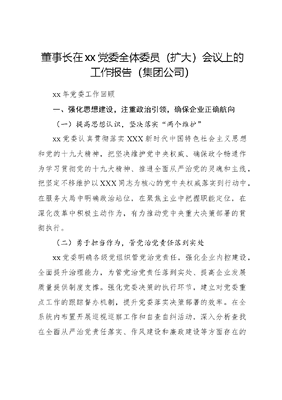 董事长在xx党委全体委员(扩大)会议上的工作报告(集团公司)xx年党委工作回顾一、强化思想建设,注重政治引领,确保企业正确航向(一)提高思想认识,坚决落实两个维护xx党委认真贯彻落实XXX新时代中国特色社会主义思想和党的十九大精神,把坚决维护党中央权威、确保政令畅通作为学习贯彻党的十九大精神、推进全面从严治党的灵魂和主线,把坚定不移维护以XXX同志为核心的党中央权威落实到行动中,在服务大局中明确政治站位,在聚焦主业中把握职能定位,在深化改革中积极主动作为,有力推动党中央重大决策部署的贯彻执行。(二)勇于担当作为,管党治党责任落到实处xx党委明确各级党组织管党治党责任,强化企业内控建设,全面提升治理能力,为管党治党责任落到实处、提高企业发展质量提供制度支撑。强化党委决策的执行环节,建立对党委重点工作的跟踪督办机制,提升党委落实决策部署的效率。在全系统内布置开展巡视巡察工作和自查自纠活动,深入分析查找在全面从严治党责任落实、作风建设和廉政建设等方面存在的问题,提升企业治理效能。(三)采取多种方式,推进党的领导与公司治理体系有机融合xx党委采取党委常委会、党委理论学习中心组学习、专题研讨会等多种方式,及时传达全国组织工作会议、全国宣传思想工作会议冲央企业党的建设工作会议等系列会议精神,把中央精神结合企业实际进行细化实化,贯穿于企业改革发展的全过程。组织梳理公司党委前置研究决策事项清单和三重一大决策事项清单,细化决策流程,理顺沟通衔接流程,将党建工作融入公司治理体系。二、广泛深入学习,积极担当作为,发挥党委领导作用(一)强化党委理论学习中心组学习,注重用理论武装头脑把党委理论学习中心组学习作为龙头工程,坚持在第一时间学习中央和上级精神,坚持用XXX新时代中国特色社会主义思想武装头脑,提高领导干部的理论水平。加强党委理论学习的过程管理和结果运用,坚持围绕中心、学以致用,坚持从严治学、督查通报,力求学懂、弄通、做实。(二)认真贯彻民主集中制,发挥党委集体领导作用xx党委以高度的政治责任感和历史使命感,贯彻落实民主文可居文库——海量学习资料,手机电脑均可下载www.wenkeju.com集中制,xx年召开党委常委会议xx次,研究议题xxx项,真正确保党委领导作用的发挥。(三)落实党管干部原则,全面加强干部管理坚持业绩导向和能力标准,配齐配强各级领导干部。xx年召开xx次书记碰头会专题研究班子建设和领导配备事项,召开xx次党委常委会审议相关议题。深化领导班子和领导人员履职尽责管理,促进各级领导班子和领导人员坚持勤勉务实、清正廉洁。组织开展xx年领导干部个人有关事项集中填报、审核、录入工作。开展xx年度综合考核评价和选人用人一报告两评议工作。三、优化选用机制,着力培养队伍,全面提升员工素质(一)坚持党管人才原则,选人用人更加规范一是严把动议关。坚持党委书记碰头会机制,规范动议提名酝酿环节,从源头上把住干部选任的初始关口。二是严把推荐考察关。考察中坚持做到凡提五必(凡提必审、凡提必核、凡提必听、凡提必查、凡提必背)。三是严把讨论决定关。在讨论干部任免过程中,坚持四不上会,使干部使用决定更加合理、公平、公正。(二)坚持制度管人,夯实人才管理基础制定下发《表彰奖励管理办法(试行)》等制度,起草文可居文库——海量学习资料,手机电脑均可下载www.wenkeju.com《项目经理管理办法》等管人用人制度,规范人力资源管理工作。(三)坚持政策引导,加强人才队伍建设一是不断加强对人才工作的领导和信息化管理。成立人才工作领导小组和院士培养申报工作领导小组。二是持续强化核心人才职业化发展。起草《项目经理管理办法》,推进项目经理职业化建设。三是着力推进海外引智、聚才、育人工程。加大国际化人才引进、培养力度,继续举办外语、国际工程项目经理培训班,组建xx国际工程人才班。四是持续加强高技能人才队伍建设。制定下发《职业技能竞赛技术规程》,建立职业技能竞赛长效机制。(四)坚持业绩导向,建立人才激励机制一是不断改进工资总额管控机制。二是加大对优秀科技骨干人才的激励力度。(五)构建全员培训体系,全面提高员工素质按照统筹规划、突出重点、分层管理、分级负责的要求组织实施员工教育培训工作。四、落实党建责任,夯实组织建设,管党治党成效突出(一)抓好''三基建设,全面激活基层党组织活力按照四同步原则及时成立党组织,确保党的组织全覆文可居文库——海量学习资料,手机电脑均可下载www.wenkeju.com盖。注重基层党建工作检查指导。严格执行关于三会一课、组织生活会、民主评议党员、主题党日等方面的"规定动作。着力抓好基层党务干部队伍建设,加强对党员的教育培训。(二)落实党建工作责任制,党建工作体系更加完善认真履行党建
