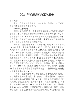 2024年胡乐镇政府工作报告各位代表:现在,我代表镇人民政府,向大会作工作报告,请予审议并请列席会议的同志提出意见。2023年工作回顾刚刚过去的2023年,是全面贯彻落实党的XXX精神的开局之年,是三年新冠疫情防控转段后经济恢复发展的一年。全镇上下坚持以XXX新时代中国特色社会主义思想为指导,严格执行市委、市政府及镇党委决策部署,较好地完成了全年目标任务,经济社会发展迈出了坚实步伐。一年来,我们迎难而上、实干奋进,经济建设扎实推进。2023年完成一般公共预算收入1865.29万元,实现税收收入967.27万元,规模以上工业产值8623万元,固定资产投资2.04亿元。始终坚持走出去、请进来双向发力,聚焦产业基础和农旅康养发展,开展精准招商,宁国市品之香食品有限公司顺利建成投产。完成安旌高速325.28亩土地征收和21户房屋征迁、兰花岭森林防火巡护道路项目征收和路基建设、方胡路一万岭段征收征迁工作。完成3座危桥(浪荡坞一桥、浪荡坞二桥、鸿门643一桥)重建及G233胡乐段大中修。方胡路葛霞段5.9公里项目征收及路基路面建设顺利完工。持续推进宣绩高铁炮损房屋鉴定补偿128户。 一年来,我们建管并举、综合施策,乡村振兴取得成效。启动吴村省级中心村建设,打造完成2个村庄整治点,建成自然村通硬化路和联网路工程1.1公里。胡乐新水厂顺利完工投入运行,并完成老水厂资产移交手续。完成撂荒田整治102.5亩,流失耕地整改497.34亩,补充耕地项目46.13亩,增减挂复垦10.3亩。加强国土空间规划管控,编制完成全镇五个村的村庄规划。出台2023年度农业产业奖补政策,中药材产业不断扩大,宁前胡种植面积达1650亩,黄精种植面积达5830亩。持续推进山核桃产业振兴工作,新增山核桃托管经营160亩、挂网111户465亩,黄泥坦山核桃科技示范基地建设完成,签订山核桃林禁用除草剂承诺书600份。村集体经济不断壮大,村集体经营性收入达378.7万元,抱团成立宁国市胡乐司乐投置业有限公司并在当年产生收益8万元。持续巩固拓展脱贫攻坚成果同乡村振兴有效衔接,完成四类人群危房改造5户,困难群众房屋修缮加固5户,超额完成改厕任务123户。完成关上大道、葛霞路路灯亮化工程,集镇基础设施逐步完善,文明村镇提档升级行动稳步实施。一年来,我们传承非遗、持续推介,文旅融合更加出彩。非遗文化不断出圈,胡乐水馅包竹篾编制被列入宣城市非物质文化遗产。胡乐司徽香豆腐坊项目落地实施并正式对外营业,胡乐村水上乐园户外休闲项目落地运营,美丽狮子山建设Ⅰ期工程、霞乡旅游驿站提升等项目稳步实施。安徽艺术学院实践基地成功挂牌,并与安徽艺术学院圆满举办校地合作文艺汇演和皖南花鼓戏《寂静的山林》首场演出,完成《古镇说》《古村里》拍摄工作,举办年味·胡乐暨首届鱼文化节、非遗展演拍摄宣传推介活动。情系小三线·感恩过大年系列活动将胡乐与原古田医院职工联系得更加紧密,组织参加宣城市第二届春节民俗文化季并得到广泛赞誉。吸引中央电视台、人民网、新华网、上海电视台、安徽电视台等各级主流媒体持续关注,胡乐的知名度、美誉度和品牌影响力大幅提升。一年来,我们兜牢底线、增进福祉,民生实事成效明显。发放奖扶、特扶及扩面资金125万元,发放特困资金126.1万元,低保资金138.4万元,残疾人补贴27万元,新申请临时救助8户,慰问帮扶特扶家庭31户。国家免费孕前优生检查39对。完成40户特殊困难老人家庭适老化改造工作,完成7户残疾人家庭无障碍改造。成功举办2023年家政服务员技能培训班、2023年网络创业培训班,高质量完成城乡居民基本医疗保险、文可居文库——海量学习资料,手机电脑均可下载www.wenkeju.com养老保险及职工医疗保险参保工作。多举措维护农民工合法权益,累计调解劳动人事争议52起,追回被拖欠工资400余万元。持续推进暖民心行动,新建老年助餐点1处,老年学校开展教学10余次。成功举办首届乡村振兴篮球赛,组织参加宁国市第十七届职工乒乓球赛、第七届端午龙舟赛。扎实开展困境、留守、事实无人抚养儿童季度走访、慰问工作。开展退役军人、烈士遗属慰问65人次,发放慰问金额3万余元。统一战线、民族宗教、老干部、工青妇等群团工作稳步推进,卫生健康、食品安全等各项事业取得新进步。一年来,我们同心协力、科学防范,社会环境持续稳定。创新建立胡乐镇矛盾纠纷及信访事项六步走工作机制,建成三灯特色握手言和调解室,调整充实胡乐司义警队并成功参与完成多场安保任务,贴合实际打造全市首个反诈长廊、童话普法等品牌,提升基层管理和服务效能。持续推进平安胡乐建设,推深做实新时代枫桥经验,全年排查受理各类矛盾纠纷144件。完成镇综治中心、公共法律服务工作站大厅及功能室改造。持续开展XXX法治思想、民法