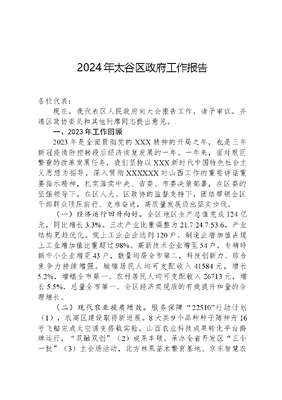 2024年太谷区政府工作报告各位代表:现在,我代表区人民政府向大会报告工作,请予审议,并请区政协委员和其他列席同志提出意见。一、2023年工作回顾2023年是全面贯彻党的XXX精神的开局之年,也是三年新冠疫情防控转段后经济恢复发展的一年。一年来,面对艰巨繁重的改革发展任务,我们坚持以XXX新时代中国特色社会主义思想为指导,深入贯彻XXXXXX对山西工作的重要讲话重要指示精神,扎实落实中央、省委、市委决策部署,在区委的坚强领导下,在区人大、区政协的监督支持下,团结带领全区干部群众顶压前行、克难奋进,高质量发展迈出坚实步伐。(一)经济运行回升向好。全区地区生产总值完成124亿元,同比增长3.3%。三次产业比重调整为21.7:24.7:53.6,产业结构更趋优化。规上工业企业达到120户,制造业增加值占规上工业增加值比重超过98%。高新技术企业增至54户,专精特新中小企业增至43户,数量均居全市第二,科技创新力、综合竞争力持续增强。城镇居民人均可支配收入41584元,增长5.2%,增幅全市第一。农村居民人均可支配收入26713元,增长5.5%,总量全市第一。全区经济实现质的有效提升和量的合理增长。(二)现代农业提质增效。服务保障22510行动计划(1),农高区建设取得新进展。8大类9个品种种子随神舟16号飞船完成太空诱变搭载实验,山西农业科技成果转化平台揭牌运行,双融双创(2)成果丰硕。承办全省开发区三个一批(3)主会场活动,北方林果苗木繁育基地、京东智慧农场、南方黑芝麻饮品、海玉食品园等标杆项目竣工投产。晋中国农农高优选两大公共区域品牌注册发布,千吨黄小米签约泰国、走出国门。2023乡村振兴(太谷)论坛成功举办,为加快农业农村现代化汇聚智慧和力量。(三)工业转型步履铿锵。太谷经开区完成调区,工业投资增长17.8%。玛钢铸造产业投资交易博览会精彩纷呈。太谷铸造公用品牌全球亮相。5+3+N产品矩阵(4)不断壮大。龙成玛钢智能铸造生产流程被工信部评定为智能制造协同作业优秀场景,卡耐夫集团成为省级智能制造示范企业。斩获中国(太谷)玛钢铸造产业高质量发展示范区省级中小企业特色产业集群等称号。中国玛钢之都、省级玛钢专业镇影响力持续提升。广誉远成为省级产业链链核企业、获评我市科技领军企业,中医药文化产业园被评为国家中医药健康旅游示范基地。黄河中药荣获中国医药行业成长50强,中医药博物馆被评为华北地区科普教育基地。安宫牛黄丸等5个产品入选山西精品,数量位居全省前列。市级中药康养专业镇强势起步。(四)文旅产业活力迸发。太谷全域旅游发展总体规划通过省级全域旅游示范区初审验收。古城保护利用工程有序实施,范村麻雀战红色教育基地重修开放。太谷万里茶道砖雕长卷获吉尼斯世界纪录,鑫炳记非遗文化园成为3A级旅游景区。文化产业园·孟母养生健康城、美宝山庄、润月山庄成功创建市级文旅康养示范区。漫步金谷文化城,畅游农旅十八景文旅品牌深入人心。(五)城乡面貌更加靓丽。融入太原晋中一体化发展大格局,打造太原榆次太谷城市核南引擎。开通太原太谷跨城公交,规划北部新城,谋划太太路南延工程,城市框架不断拉大。科谷大道全线贯通,胡村产业园区路完成提质改造,4条四好农村路全面完工,路网架构不断完善。散煤清零集中供热工程扎实推进,改造升级34个老旧小区、10条小街巷,启文可居文库——海量学习资料,手机电脑均可下载www.wenkeju.com动西苑公园扩容提质工程,修建4座口袋公园(5)小游园,基础支撑不断夯实。(六)生态环境不断改善。蓝天、碧水、净土三大保卫战成效显著。关停淘汰恒达4.3米焦炉,开展炭素、供热等重点行业深度治理,SO2、PM10、PM2.5年均浓度明显下降。一泓清水入黄河重点任务有序推进,考核断面水质稳定达标。深入实施河湖长制、林长制,完成营造林建设任务0.4万亩、义务植树143万株,绘就金谷大地绿水青山新画卷。(七)乡村振兴扎实推进。学习践行千万工程(6)经验,加快建设宜居宜业和美乡村。开展耕地保护整治提升行动,扛牢稳粮保供政治责任。粮食产量3.48亿斤,蔬菜产量8.11亿斤,双双喜获丰收。金铭农牧、佳博农牧被评为省级畜禽良种扩繁推广基地,裕丰天成肉牛养殖项目建成投运,畜产品综合产量达12.5万吨、再创新高。持续巩固拓展脱贫攻坚成果,脱贫人口人均纯收入达到14475元,增长15.7%,圆满完成省定目标。(八)营商环境持续优化。开展市场主体提升年行动,新登记各类市场主体8149户,累计存量43635户,全市第四。支持民营经济发展,打好惠企优商组合拳,新增减税降费及退税缓税缓费2.3亿元,市场经济活力进一步激发。开展一件事一次办试点,推行三减一优(7)