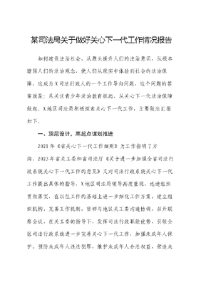 某司法局关于做好关心下一代工作情况报告如何建设法治社会,从源头提升人们的法治意识,从根本增强人们的法治观念,使人们从现实中体验到社会的法治保障,这成为X司法行政人的一个工作导向问题,这个问题的答案就是:从关注青少年法治教育抓起,从关心下一代法治保障做起。X地区司法局积极探索关心下一代工作,主要做法汇报如下。一、顶层设计,高起点谋划推进2021年《省关心下一代工作细则》为工作指明了方向,2023年省关工委和省司法厅《关于进一步加强全省司法行政系统关心下一代工作的意见》又对司法行政系统关心下一代工作提出具体的指导,X地区司法局领导高度重视,迅速组织贯彻落实,在以往工作的基础上进一步细化工作方案、建立组织机构、完善工作机制,密切与地区关工委沟通协调,召开联席会议,在关工委的指导下,发挥司法行政职能优势,引领全区司法行政系统进一步完善关心下一代工作,加强未成年人保护、预防未成年人违法犯罪,维护未成年人合法权益,营造未成年人健康成长的良好社会环境,推动全区关心下一代工作高质量发展。二、巩固基础,精细化具体落实一是成立关工组织机构。全区司法行政部门建立了8个关心下一代工作委员会。分别由各单位主要负责同志担任主任,分管领导担任副主任,由原单位退休的班子成员担任常务副主任,为工作的顺利开展提供强有力的组织保障。全区各地司法局依托全部43个司法所建立了司法行政关心下一代委员会工作站,上下联动,按照地区关工委的建议,以加北乡司法所关爱工作站为示范引领,实施网格化管理运行,打通社区关爱下一代工作最后一公里,为工作开展奠定了物质基础。二是纳入指标考核体系。制定了包含19项具体措施的《加强全区司法行政系统关心下一代工作的方案》,把具体工作任务细化分解,将预防青少年犯罪作为平安建设的一项考核内容(1.3分),确保未成年人保护工作有序开展。三是加强联动凝聚力量。地区司法局积极联合教育局、团委、妇联等部门,共同构文可居文库——海量学习资料,手机电脑均可下载www.wenkeju.com建未成年人保护工作联动机制。各单位按照职责分工,互通有无,共享资源,形成关心下一代的工作合力。三、成效突出,多部门作用彰显一是法治普及宣传培育下一代。建立为家长与孩子普及法律知识的平台,强化家校共育,促进家庭和谐,减少青少年问题的发生,地区司法局联合地区教育局主办的家长法治课堂开学普法第一课线上系列公益讲座,参学人员达到一万余人,学生与家庭成员分享法治意识,收到了良好的效果。巩固完善法治副校长工作机制。将法治副校长工作开展情况纳入八五普法考核内容,组织法官、检察官、律师等专业人员91人担任法治副校长,举办学生学宪法讲宪法宪法晨读送法进校园与法同行护成长等普法活动108次,有针对性地开展防范校园欺凌、性侵害等法律宣传。利用多媒体资源创新普法方式。如X县司法局和团县委联合摄制的《三顾茅庐》《阿斗上学记》《楚汉之争》3部普法视频短片,成为青少年喜闻乐见的普法节目。文可居文库——海量学习资料,手机电脑均可下载www.wenkeju.com二是优化社会环境影响下一代。在全地区建立87家普法守法示范户,家庭成员发挥示范引领作用,树立和巩固未成年人保护法守法意识。全区建成青少年法治教育基地1个,法治教室(课堂)25个、法律图书角253个、法治文化广场6个。利用省级青少年法治教育实践基地全国青少年维权岗开展法治教育,受教育人数达3800余人次。地区司法局投资建设的综合实践学校模拟法庭,被评为省级法治文化教育基地。各县(市、区)司法行政部门和各有关单位专题开展与法同行护成长未成年人法治宣传教育专项活动,通过发放宣传资料8千余份、举办法律讲座20余次、向未成年人普及法律知识,提高了青少年的法律意识和自我保护能力。三是法治文化建设涵养下一代。组织本地区中小学生尊崇宪法学习宪法硬笔书法比赛,使全区9万余人,近四分之一的人口参加到活动当中。组织和鼓励青少年积极参加全省书画情法治梦书画比赛中,全区有20名青少年获奖。在全省我与宪法的故事演讲比赛中有2名中小学生获奖。组织了全区青少年开展12.4国家宪法日和宪法宣传周主题宣文可居文库——海量学习资料,手机电脑均可下载www.wenkeju.com传活动,推选了22名青少年普法志愿者,通过亲身参与,弘扬了宪法精神,牢固了宪法意识,增强青少年的法治观念和社会责任感。四是司法行政职能保障下一代。社区矫正精准帮扶进一步加强。建立社区矫正对象个人档案,对青少年制定个性化矫正方案。通过心理咨询、技能培训、就业指导等方式,加强与社区、家庭的沟通合作,形成全方位帮扶体系,帮助有过违法犯罪记录的青少年顺利回归社会,尽管我区目前尚无青少年社教对象,但未雨绸缪防患未然。法律