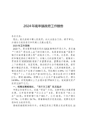 2024年南丰镇政府工作报告各位代表:现在,我代表南丰镇人民政府,向大会报告工作,请予审议,并请各位政协委员和列席人员提出意见。2023年工作回顾2023年,是全面贯彻落实党的XXX精神的开局之年,是实施十四五规划承上启下的关键之年,也是省委实施百县千镇万村高质量发展工程的起步之年。一年来,在县委、县政府和镇党委的正确领导下,在镇人大的监督支持下,我镇深入贯彻落实XXXXXX视察广东重要讲话、重要指示精神,全镇上下拼搏奋进、攻坚克难,推动经济社会平稳健康发展,谱写南丰镇经济发展、环境改善、社会和谐、人民幸福新篇章。全镇完成地区生产总值17.0188亿元,同比增长6.39%(以下简称增长);工农业总产值16.52亿元,排名全县15个乡镇第2位,增速10.44%;规模以上工业总产值1.6376亿元、增长14.98%;实现规模以上工业增加值3706.9万元,完成固定资产投资2.2077亿元。一、统筹发展城镇化,百千万工程扎实起步市场主体培育壮大。实施育苗行动,支持市场主体高质量发展,全年培育新增四上企业4家、累计培育四上企业10家;培育新增个体户801户、公司42家,个体户增长37.7%、公司增长26.7%,厚植镇域经济发展动能,发挥有效市场和有为政府作用。基础设施短板加快补齐。老城区改造工程重点完成硬底化11公里,沥青改造7公里,外立面改造954栋,安装路灯565盏,铺设污水支管42公里,铺设自来水主管12公里等工程。南丰防洪工程已完成总工程量的56.9%,民华灌区续建配套与节水改造工程已完成总工程量的71%,贺江二桥新建工程拟纳入省级交通建设发展十四五规划,并初步计划按出省通道(重点经济网络公路)标准进行补助;推进老城区分片分区改造,通过进行道路硬化、照明亮化、景观绿化、污水净化和环境美化等五化项目,提升圩镇的韧性。美丽圩镇建设高位推动。美丽圩镇百千万工程建设项目(南丰圩镇一期)于2023年11月21日已通过县政府投资工程项目事前审批工作会议。一个美丽乡镇入口通道建设完成,沿线道路已黑化亮化,配备绿化景观;一条美丽示范主街已完成升级改造,即全长400米的骑楼街正街;一处房屋外立面提升样板已完成,建筑立面组合改造共完成534栋1.4公里;一个美丽圩镇客厅占地45m2建设完成,具有历史沿革、特色展示、休闲会客等功能;一个干净整洁农贸市场正在建设,已划分各类摊位约122个;一条美丽河道全长1.53公里,已修建河岸堤防1公里、16个观景台、1个亲水公园;一个绿美生态小公园占地2800㎡,人行绿道1997㎡、河堤护栏845米已全部建设完成。扎实推进七个一建设,绘就南丰美丽圩镇实景图。人居环境整治持续开展。开展五清一改清洁行动,根据《2023年度封开县农村人居环境整治工作考核方案》,以清理村内塘沟,清理畜禽养殖粪污等农业生产废弃物,清理乱搭乱建、乱堆乱放,清理废旧广告牌,清理无功能建筑,改变影响人居环境的不良习惯为重点,对32个村(社区)开展环境整治专项行动。全年圩镇范围共治理乱拉挂251处、乱搭建201处、乱堆放1100处、乱摆卖4056处、乱停放76处、乱贴画82处;各村共摸排应清拆类泥砖房647栋(间),已清拆313栋(间)。二、经济增收,治理创新,乡村振兴稳步推进。文可居文库——海量学习资料,手机电脑均可下载www.wenkeju.com现代特色农业做大做优。推动土地流转,引导产业集群。出台《土地流转以奖代补方案》,推动小田并大田,由龙头企业带动、规模经营驱动,壮大水稻、蔬菜等主导产业集群。全镇累计流转土地超3900亩,由丰悦公司、润香纯农民合作社等20余家农业经营主体统一运营,规模种植水稻、蔬菜、砂糖桔等特色农业。其中,丰悦蔬菜基地规模已扩大至近1000亩,为农户创造超155个家门口就业机会,每年为农户增收超400万元。统筹培育农民专业合作社,发展特色养殖业。开明村农民专业合作社统筹合作社自有资金、群众自筹资金、银行贷款资金、易方达公益基金、驻镇帮扶奖补资金等共300多万元,建设杏花鸡和肉牛养殖村级农业产业园。开发开明土味小程序助力销售,获肇庆市农民合作社市级示范社荣誉称号。立足优势布局农产品加工业,延长产业链。引进广东盛加农牧食品有限公司,在金塘村建设杏花鸡省级现代农业产业园,建有畜禽屠宰加工生产线1条、水禽临时加工线1条,年屠宰加工杏花鸡等畜禽达2.2万吨,年产值约9624万元,已取得香港准入认证,为封开杏花鸡打开了香港市场。充分发挥农业龙头企业的示范带动作用,引领农村电商产业。农村电商产业园已建成投入使用,已与辖区15家农村电商相关企业达成入驻办公的合作意向,推动农业小生产与电商大市场有效对接,助力农产品上行。此外,探索推动农产品加工增值。乡村旅游