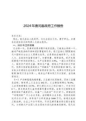 2024年唐河县政府工作报告各位代表:现在,我代表县人民政府,向大会报告工作,请予审议,并请各位政协委员和列席人员提出意见。一、2023年工作回顾过去的一年,是唐河发展进程中极具挑战,又极其出彩的一年。面对严峻复杂的形势和艰巨繁重的任务,我们坚持以XXX新时代中国特色社会主义思想为指导,在县委的正确领导下,在县人大、县政协的监督支持下,知重负重、砥砺奋进,经济发展保持稳中有进的好势头。生产总值增长4.9%,一般公共预算收入、固定资产投资总量、粮食总产量、建筑业产值均居全市前列。获得全国首批县域商业领跑县等国家级荣誉18项,省首批乡村建设示范创建县等省级荣誉23项,政策性项目资金争取等26项工作全市第一,粮食生产等9项工作在国家、省作典型发言。(一)产业转型迈向高质量。工业振兴纵深推进。坚持工业强县战略,培育规上工业企业192家,工业增值税增长78.4%,工业用电量增长12.3%。新引进亿元以上项目90个、外资项目6个,基本建成艾礼富传感器等重点项目,省委书记楼阳生莅唐视察给予高度评价。实施三化改造项目37个,新增省级专精特新中小企业5家、省级瞪羚企业3家、国家级高新技术企业17家。争取省产业研发基金3000万元,格瑞光电新三板挂牌,企业上市全市领先。开发区高质量发展位居全省前列,乡村振兴产业园入选全国地方深化改革典型案例。现代农业巩固增强。粮食产量27亿斤以上,全省第二。新建高标准农田17万亩,总面积达到180万亩,居全国前列。引进北大荒农服集团,流转土地2.6万亩,规模化种植实现破题。建成投用红薯产业园,发展花生良种繁育基地5万亩,种质资源发展迈上新台阶。商贸服务加速崛起。建成综合物流园、智慧农商城等专业市场,新增服务业、贸易业四上企业37家,商业体系建设日益完善。新增A级物流企业6家,全市第一。(二)项目建设延续好态势。争取到位政策性项目资金、政府债券资金、融资类项目资金110亿元以上,连续四年全市第一。抢抓特别国债机遇,到位资金5.1亿元。深入实施重点项目攻坚,95个省市重点项目均超额完成投资计划。唐河复航一期、方枣高速建设进展迅速,南信合高铁初定线路,区位交通优势日益凸显。渔光互补、屋顶光伏等项目加快实施,风电、光伏装机规模达到79.6万千瓦、45.7万千瓦,创成国家农村能源革命试点县。(三)城乡面貌实现大提升。行政文化区实现突破,老城区全面提质,宜居宜业的现代化新城初具规模。打通断头路8条,改造提升道路13条,建成雨污管网15.7千米,改造老旧小区29个,建成棚改项目5个,投用广场、游园14个,一河两岸景观绿化亮化全面提升。全国文明城市创建深入推进,国家卫生县顺利通过初验。实施农村人居环境三治理一提升行动,改造户厕1.3万户,完成一宅变多园7516个,创成省级乡村建设示范村16个,郭滩镇李庄村荣获全国乡村治理示范村。生态环境持续改善,国、省控断面水质年均值达标率100%,空气质量优良天数300天,获得生态补偿金4500万元。(四)发展活力迸发强动能。营商环境不断优化,建成投用新政务服务中心,工程项目审批打造极简模式,实现一天办四证拿地即开工,唐易办荣获全国政务服务改革实践创新案例。深化万人助万企活动,帮助企业拓展市场32.5亿元,政银企对接融资22.6亿元,市场主体突破10万户,居全文可居文库——海量学习资料,手机电脑均可下载www.wenkeju.com市前列。年度营商环境考核居全省前十,创历史最好成绩。深化国资国企改革,持续推动国企拓展业务、做大做强,超额完成年度任务。加快商贸流通领域改革,盘活供销社等闲置国有资产近亿元。推动自然资源改革,创成全国集体经营性建设用地入市试点县。(五)民生改善交出暖心卷。全年民生领域投入64亿元,占公共预算支出80%,高质量完成省定、市定和县人大代表票决的民生实事。巩固脱贫攻坚成果,脱贫人口人均纯收入增长13.2%,实现一持续两提升。深入实施城镇困难职工居民解困脱困,省长王凯批示肯定。持续推动教育振兴,第一完全学校顺利组建,文峰九年一贯制学校建成投用,升级改造乡镇学校75所,新增学位2万个,高招一本上线2017人,增长40.2%,增幅全市第一。建成投用县医院新院,县域医疗服务水平持续提升,中医药发展走在全市前列。健全完善县乡村三级养老服务体系,推动医养结合,典型做法获省委改革简报专期刊发。新增技能人才3.3万人、城镇就业1.4万人。全面排查整治重大隐患119个,安全生产形势保持稳定。突出党建引领全科网格化治理,46个信访积案全部化解到位,29个问题楼盘得到有效处置,平安唐河创建扎实推进。(六)政府建设取得新成效。扎实开展XXX新时代中国特色社会主义思想主题教育,全面推进观念能力作风提升年活动。牢固树立过紧日子思想,