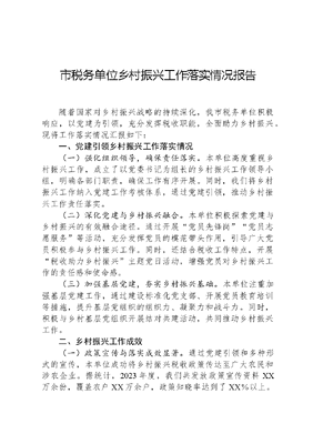市税务单位乡村振兴工作落实情况报告随着国家对乡村振兴战略的持续深化,我市税务单位积极响应,以党建为引领,充分发挥税收职能,全面助力乡村振兴。现将工作落实情况汇报如下:一、党建引领乡村振兴工作落实情况(一)强化组织领导,确保责任落实。本单位高度重视乡村振兴工作,成立了以党委书记为组长的乡村振兴工作领导小组,明确各部门职责,确保工作有序开展。同时,我们将乡村振兴工作纳入党建工作考核体系,通过党建引领,推动乡村振兴工作责任落实。(二)深化党建与乡村振兴融合。本单位积极探索党建与乡村振兴的有效融合途径。通过开展党员先锋岗党员志愿服务等活动,充分发挥党员的模范带头作用,引导广大党员积极参与乡村振兴工作。同时,还结合税收工作特点,开展税收助力乡村振兴主题党日活动,增强党员对乡村振兴工作的责任感和使命感。(三)加强基层党建,夯实乡村振兴基础。本单位注重加强基层党建工作,通过建设标准化党支部、开展党员教育培训等措施,提升基层党组织的组织力、凝聚力和战斗力。同时,积极与乡村基层党组织开展结对共建活动,共同推动乡村振兴工作。二、乡村振兴工作成效(一)政策宣传与落实成效显著。通过党建引领和多种形式的宣传,本单位成功将乡村振兴税收政策传达至广大农民和涉农企业。据统计,2023年度,我们共发放政策宣传资料XX万余份,覆盖农户XX万余户,政策知晓率达到了XX%以上。同时,我们严格落实税收优惠政策,全年为农民和涉农企业减免税收XX亿元,有效减轻了他们的负担。(二)税收服务优化提升农民满意度。本单位通过优化税收服务流程、推广电子税务局等措施,大幅提升了办税效率和服务质量。数据显示,2023年度,我市税务单位电子税务局注册用户数量增长了XX%,网上办税业务占比达到了XX%以上。同时,我们设立了乡村振兴税收服务专窗,为农民提供个性化、专业化的服务,农民满意度达到了XX%以上。(三)税源培育与管理助力农业发展。在党建引领下,本单位加强与农业部门的合作,深入挖掘农业产业税收增长点。通过加强对农业产业链的税收分析和管理,我们成功培育了一批具有竞争力的农业企业和产业集群。XXXX年度,我市农业产业税收同比增长了XX%,为农业发展提供了有力支持。三、存在问题及改进措施(一)存在的问题。政策宣传覆盖面仍需扩大,部分偏远地区和特殊群体农民对税收优惠政策了解不足。税收服务在某些环节仍存在不够便捷、高效的问题,农民办税体验有待提升。税源培育与管理工作尚需加强,对农业产业的税收潜力挖掘不够深入。(二)改进措施。一是政策宣传方面,深入开展税收知识下乡活动,组织税务干部深入偏远地区,面对面为农民讲解税收优惠政策。利用移动媒体平台,如抖音、快手等,制作税收优惠政策宣传短视频,提高政策宣传的覆盖面和趣味性。建立税收政策宣传志愿者队伍,发动社会力量参与政策宣传,形成全方位、多层次的宣传格局。二是税收服务优化方面进一步优化办税流程,简化办税手续,减少农民办税时间和成本。推广智能办税设备,如自助办税终端、移动办税APP等,方便农民随时随地办理涉税业务。设立乡村振兴税收服务热线,提供24小时在线咨询服务,解答农民涉税问题。三是税源培育与管理方面。加强与农业部门的沟通协作,共同研究农业产业税文可居文库——海量学习资料,手机电脑均可下载www.wenkeju.com收政策和税源增长点。定期开展农业产业税收调研分析,深入挖掘农业产业税收潜力,为政策制定提供科学依据。建立农业企业税收辅导机制,为企业提供税收咨询、规划等个性化服务,帮助企业降低税收风险,提高经济效益。我市税务单位在乡村振兴工作中坚持以党建为引领,充分发挥税收职能作用,取得了显著成效。未来,我们将继续深化党建与乡村振兴的融合,不断优化税收服务,加强税源培育和管理,为乡村振兴贡献更多税务力量。我们也希望与相关部门和社会各界加强合作,共同推动我市乡村振兴工作取得更大成就。文可居文库——海量学习资料,手机电脑均可下载www.wenkeju.com