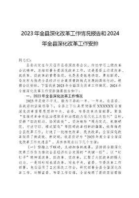 2023年全县深化改革工作情况报告和2024年全县深化改革工作安排同志们:县委决定在今天召开县委深改委会议,传达学习上级改革会议精神,总结部署全县深化改革工作,这是县委主动谋改革、抓改革、促改革的重要体现,也是县委锐意进取、勇拓新局,奋发有为推进全县经济社会高质量跨越式发展的具体行动。根据会议安排,下面我就2023年全面深化改革工作情况、2024年全面深化改革工作安排简要报告如下:一、2023年全县深化改革工作情况2023年是极不平凡、极为不易的一年。一年来,在县委、县政府的坚强领导下,全县上下认真贯彻落实XXXXXX全面深化改革重要思想和中央、省委、市委改革决策部署,聚焦在推进革命老区治理体系和治理能力现代化上走前列目标,坚持四改联动、协同高效,坚决破除观念定式、机制梗阻、方法守旧、模式固化等阻碍改革创新的藩篱,统筹推进全县改革工作,打造了一批特色改革、亮点改革,全面深化改革取得了新成效、新突破,我县获评为2023年度全省全面深化改革工作先进县。具体体现在以下几个方面:(一)坚持上下联动,主动担当抓改革。坚持将全面深化改革工作作为推动全县经济社会发展的关键一招,以钉钉子精神谋改革、抓改革、促改革,汇聚了大抓改革的强大动力。一是对标对表谋改革。对表中央、省委、市委改革工作部署,先后召开了2次深改工作会,研究部署全县全面深化改革工作。对照省委、市委工作安排,全面梳理了县级层面需推进的改革任务,全部纳入我县改革工作盘子,确保全年改革工作方向不偏、节奏不乱,全县163项改革均按进度有序推进。二是高位推动抓改革。县委深改委成员坚持以上率下,带头领衔推进重大改革项目,做到亲自调度、亲自推进;其他县领导主动担当,对各自领衔的重大改革项目做到主动研究、积极推进,19名县级领衔推进36项重大改革项目均取得较好成效。将全面深化改革工作列入全县高质量发展考评内容,对成效突出的直接加分,将路长制、绿色殡葬改革、养老服务体系建设、四好农村路示范县创建等工作列入了重点工作考核通报项目或全县重点项目,定期调度、高位推动。三是多方联动促改革。八个改革专项领导小组、改革牵头单位和责任单位在各自改革领域、牵头改革事项中,切实履职尽责,有效发挥了对改革工作的谋划、推动、落实的重要作用;县委改革办充分发挥协调各方、统筹全面的作用,建立健全了改革工作定期调度、调研督察、信息报送等制度,切实抓好工作推进落实,全年共开展了改革工作调度6次、调研督察10余次,形成了纵向贯通、横向协同、一体联动的工作落实机制。(二)坚持精准发力,四改联动求实效。坚持四改联动、协同高效,聚焦当下急需改、用得着的改革事项,精准发力,切实提升改革实效。一是健全高质量发展机制。持续深化放管服改革,积极推行政务服务好差评、错时延时服务制度,推进赣服通xx分厅建设,获评全市xx建设示范县。创新招商体制机制,健全企业精准帮扶机制,全面落实减税降费政策,全县固定资产投资增速位居全市第一;深入推进消费升级三年行动,健全全域旅游推进机制,全市促进商贸流通业发展经验交流会在我县召开,xx景区被评为国家4A级旅游景区。深入实施创新驱动5511工程倍增计划,新增高新技术企业12家,位居全市第一。深入推进河长制、林长制,积极推进生态环境公益诉讼和生态环境损害赔偿制度改革,城乡环境质量持续改善。二是织密民生保障体系。围绕群文可居文库——海量学习资料,手机电脑均可下载www.wenkeju.com众关心的教育、医疗、养老等需求,持续深化民生领域改革。深入推进教育体制改革,城区大班额和公办幼儿园入园难问题得到缓解;健全公共卫生服务体系,积极推进基本公共卫生服务均等化,荣获全市深化医药卫生体制改革先进县。健全重大疾病医疗保险和救助制度,实现基本医疗保险、大病保险同步结算。完成了县第二福利院公建民营改革,新建党建+颐养之家43个,党建+颐养之家工作在全市养老服务工作推进会上作作典型发言。紧盯长效脱贫,大力实施遇困即扶机制和美德积分行动,有效防止规模性返贫,农村和城镇困难群众全部脱贫。三是创新社会治理体系。大力推进天网、雪亮工程建设,全面推进村级综治中心视联网建设,构建起覆盖城乡的防护网络。深化警务辅助人员管理体制改革,建立了辅警招聘、使用、管理、权力义务保障等机制;积极整合警务资源,推进交治合一交巡合一勤务模式,全面提升社会治安和交通安全治理水平;全面完成了森林公安机关管理体制改革。认真落实法律顾问制度,深入实施法律明白人培养工程,创建省级民主法治示范村1个,省级法治文化示范基地1个,群众学法遵法用法意识不断提升。四是健全党建引领机制。坚持把党的政治建设摆在首位,出台了《关于开展政治谈话加强对一把手