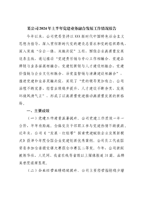 某公司2024年上半年党建业务融合发展工作情况报告今年以来,公司党委坚持以XXX新时代中国特色社会主义思想为指导,深入贯彻新时代党的建设总要求和党的组织路线,深入实施全企一体、双融共促工程,围绕企业高质量发展这条主线,通过推动党建责任链与中心工作相融合、党建品牌链与业务拓展相融合、党建创新链与人才建设相融合,党建价值链与企业文化相融合、治党监督链与清廉建设相融合,推进党建和业务双融共促,实现了党的领导更加有力、公司治理不断完善、经营业绩稳步提升、人才建设不断夯实、发展环境风清气正,形成了以高质量党建推动高质量发展的新格局。一、主要成效(一)党建工作质量显著提升。公司党建工作质效一年一台阶,年年有跨越。全体党员干部职工参与党建热情不断提高。近年来,公司《发展·红纽带探索党建赋能企业发展新模式》获评今年度全国企业党建创新优秀案例。公司员工代表国资委参加全省微党课大赛获全市赛区二等奖。今年,公司新闻被新华社、人民网、我省在线等省级以上媒体报道31篇。品牌美誉度逐渐显现。(二)企业经营业绩稳健提升。公司主要经营指标稳步增长,截至目前,公司资产总额近28亿元,同比增长26.31%。公司聚焦产业生态圈优化,不断增强市场化资本运作能力,扎实提升基金管理效能,强化战略性新兴产业领域的投资,推进了一批强基础、增效益、利长远的项目落地见效。(三)公司政治生态不断优化。近年来,公司以六