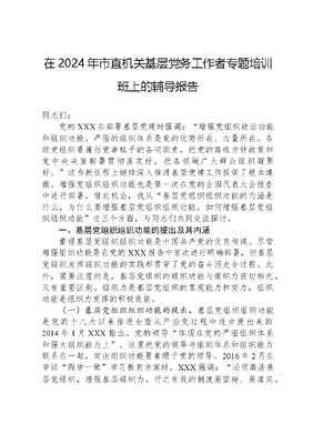 在2024年市直机关基层党务工作者专题培训班上的辅导报告同志们:党的XXX在部署基层党建时强调:增强党组织政治功能和组织功能。严密的组织体系是党的优势所在、力量所在。各级党组织要履行党章赋予的各项职责,把党的路线方针政策和党中央决策部署贯彻落实好,把各领域广大群众组织凝聚好。这为新征程上继续深入推进基层党建工作提供了根本遵循。增强党组织组织功能也是第一次在党的全国代表大会报告中进行部署。借此机会,我从基层党组织组织功能的内涵是什么,为什么要增强基层党组织组织功能,如何增强基层党组织组织功能这三个方面,与同志们共同交流探讨。一、基层党组织组织功能的提出及其内涵重视基层党组织组织功能是中国共产党的优良传统。尽管增强组织功能是在党的XXX报告中首次进行明确部署,但基层党组织发挥组织功能的实践却贯穿了党的奋斗历史全过程。此外,需要注意的是,基层党组织的组织功能与组织力密切相关,又有重要区别。组织力是基层党组织的客观能力和实力,组织功能是组织力发挥的积极效能。(一)基层党组织组织功能的提出。基层党组织组织功能是党的十八大以来推进全面从严治党过程中逐步提出来的2014年1月XXX指出,党的领导体现在党的严密组织体系和强大组织能力上。这里把党的领导与组织体系和组织能力联系在一起,突出组织功能要着眼于党的领导。2016年2月在审议两学一做学习教育方案时,XXX强调:必须激活基层党组织,增强基层组织力。行之有效的制度要坚持、要落实,同时要针对新情况新问题以改革创新精神补齐制度短板,健全制度,有力执行,真正使党的组织生活和党员教育管理严起来、实起来。这里的组织力突出党内生活和党员教育管理,侧重于内部组织功能。2017年10月,XXX在党的十九大报告中强调加强基层党组织建设要以提升组织力为重点,突出政治功能。2018年1月,XXX把政治功能与组织功能并列提了出来。他强调:我们要积极适应形势发展变化、党员结构深刻变化,强化党组织的政治功能和组织功能,在严肃的党内生活中锤打,提高适应新时代新要求的新本领新能力。这是XXX第一次提出组织功能。从这段论述的前后语境看,XXX针对党员队伍发生了重大而深刻变化,提出要增强基层党组织的组织功能,从而提高党的新本领新能力。党的十九届六中全会在总结新时代全面从严治党成就时指出:党不断健全组织体系,以提升组织力为重点,增强党组织政治功能和组织功能,树立大抓基层的鲜明导向。党的XXX报告正式把增强党组织政治功能和组织功能纳入推进新时代党的建设新的伟大工程的重点任务,作为当前和今后一个时期基层党建工作的重要遵循。(二)基层党组织组织功能的内涵。组织功能是基层党组织整体功能的一个组成部分。概括而言,基层党组织组织功能是指基层党组织为巩固党的领导地位、履行自身职责而把党员和群众组织起来发挥的积极效能,主要包括吸纳党员、教育管理党员、促进党员发挥先锋模范作用而实现的组织团结,进而把群众组织起来。具体来说,基层党组织组织功能的内涵包括三个方面:其一,基层党组织组织功能的目的是巩固党的领导地位,贯彻党的路线方针政策和决策部署,切实履行党组织的自身职责。其二,把党员组织起来充分发挥先锋模范作用。党的性质宗旨和党员先进性决定了组织党员是组织群众的前提,如果一个基层党组织连党员都组织不起来,就不可能有效发挥组织功能。这就要求基层党组织做好党员接收、教育管理等工作,激励党员发挥先锋模范作用,巩固党的组织。其三,把群众组织起来自觉实现党的主张。列宁指出:在人民群众中,我们毕竟是沧海一粟,只有我们正确地表达人民的想法,我们才能管理。否则共产党就不能率领无产阶级,而无产阶级就不能率领群众,整个机器就要散架。中国共产党确定的奋斗目标,最终还是要靠广大党员带领人民群众努力奋斗才能实现。这就需要充分发挥基层党组织的组织功能,把各领域基层群众组织好,共同实现党的奋斗目标。(三)基层党组织组织功能与组织力的关系。党的十九大报告提出基层党组织建设以提升组织力为重点。党的XXX报告提出要增强基层党组织的组织功能。从组织力到组织功能,既是对近年来基层党建成就的肯定,也是在新征程上对基层党建提出的更高要求。从组织力到组织功能的转化是由二者之间的关系决定的。首先,组织力是组织功能的前提。组织力是基层党组织为完成自身的任务和职责而拥有的内部有序运行、外部有效领导群众的能力。组织力在本质上是基层党组织的客观能力。组织功能是基层党组织为巩固党的领导地位、履行自身职责而把党员和群众组织起来发挥的积极效能。组织功能在本质上是基层党组织组织力发挥的积极效果。组织力是组织功能的前提,如果没有组织力,就不可能有组织功能。其次,组织力需要转化为组织功能。有组织力不一定有组织功能。充分有效发挥的组织力才能体现为组织功能。党的十九大以来