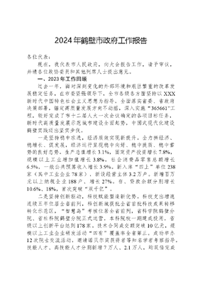 2024年鹤壁市政府工作报告各位代表:现在,我代表市人民政府,向大会报告工作,请予审议,并请各位政协委员和其他列席人士提出意见。一、2023年工作回顾过去一年,面对深刻变化的外部环境和艰巨繁重的改革发展稳定任务,在市委坚强领导下,全市各级各方面坚持以XXX新时代中国特色社会主义思想为指导,全面落实省委、省政府决策部署,锚定高质量发展方向不动摇,深入实施365661工程,较好完成了市十二届人大一次会议确定的各项目标任务,新时代高质量发展示范城市建设全面起势,中国式现代化建设鹤壁实践迈出坚实步伐。一是坚持稳中求进,经济质效实现新提升。全力拼经济、稳增长、促发展,经济运行呈现稳中向好、稳中提质、稳中蓄势的良好态势。生产总值增长3.1%,固定资产投资增长7.8%,规模以上工业增加值增长3.8%,社会消费品零售总额增长6.5%,一般公共预算收入增长3.9%。新入库四上单位238家(其中工业企业78家),新设经营主体3.2万户。新增百万元以上纳税企业188户、增长27%。存、贷款余额分别增长10.6%、18%,首次突破双千亿。二是坚持创新驱动,科技赋能塑造新优势。科技支出增速连续五年位居全省前列,科创新城获批全省首批科技成果转移转化示范区,智慧岛考核位居全省前列,省科学院鹤壁分院、省社科院鹤壁分院正式运营,本科院校一期建成投用,省级以上创新平台达到178家。技术合同成交额突破10亿元,规模以上工业企业研发活动四有覆盖率全省第三。成功举办12次院士交流活动,邀请诺贝尔奖获得者等知名学者考察指导,技能人才、高技能人才分别新增7万人、2.1万人,均双倍完成省定目标。科创中国试点建设综合排名保持全国第一方阵,入选全国首批创新驱动示范市。三是坚持动能转换,产业转型迈出新步伐。高新技术产业增加值占规模以上工业比重达到53.3%,数字经济核心产业占比连续三年全省第二,全国产业转型升级示范区获优秀等次。电子核心产业集群入选省首批战略性新兴产业集群,现代化工及功能性新材料产业链获评全省最具发展潜力产业链金星奖,预制菜产业列入省研发生产重点基地,中铝镁基新材料工业试验项目签约落地。龙芯中科芯片封装基地投产运营,华为(鹤壁)物联感知体系示范城市启动建设,河南生物产业集团揭牌成立,新拓洋项目一期建成投产,现代物流开发区考核评价全省第二,煤炭物流园区获评全国优秀物流园区。女娲星座首发4颗卫星成功发射,天章卫星项目投产运营,商业航天及卫星产业纳入全省卫星产业发展战略重点。四是坚持项目为王,三个一批积蓄新动能。全面推行双长制,扎实开展五比五拼行动,新签约项目322个,新落地项目211个,引进省外资金完成进度和增速分别位居全省第一、第三,货物贸易进出口增速位居全省前列。省重点项目投资进度全省第二。编制完成全国首个五位一体企业服务地方标准,万人助万企考核全省第一,城市信用状况监测排名稳居全国前列,创成全国社会信用体系建设示范区、全省两个健康实践创新示范市,企业满意度连续四年全省第一,营商环境连年保持全省优秀。三个一批第八期活动主会场设在我市,全年综合评价保持全省第一方阵。五是坚持扩容提质,城乡建设焕发新活力。市县国土空间总体规划率先实现成果应用。30个老旧小区改造和16条背街小巷整治提升全面完成,小区专业物业入驻率提升至92%。全国文明城市国检成绩全省第一、全国前列,成功蝉联国家卫生城市,创成国家儿童友好城市,入选中国—丹麦低碳供热试点城市、国家公交都市建设示范工程创建城市。国道107改线、安文可居文库——海量学习资料,手机电脑下载www.wenkeju.com新高速、安罗高速等项目加快推进,干线公路路况全省第三。有效应对多年不遇的烂场雨,玉米新品种亩产达1171.4公斤,粮食产量实现单产创新高、总产保目标。农村人居环境考核、乡村振兴战略考核、乡村建设综合评价分别位居全省第二、第三、第四,巩固拓展脱贫攻坚成果后评估考核获得好的等次。六是坚持生态环保,绿色发展取得新突破。空气质量综合指数改善率全省第三,细颗粒物(PM2.5)、可吸入颗粒物(PM10)、优良天数目标完成情况分别位居全省第二、第一、第三,大气污染防治目标全部完成、全省唯一,国控、省控断面水质均值优于省定目标,土壤环境质量保持总体稳定。历史遗留废弃矿山生态修复示范工程项目入选国家示范工程名单,黑山头玄武岩矿矿山环境生态治理项目入选全国优秀典型案例。可再生能源发电装机占比36.2%,工业固体废物综合利用率96%。林业责任目标考核位居全省前列,城市绿地率、绿化覆盖率分别达到42.9%、44.8%,人均公园绿地面积21.9平方米、全省第一。七是坚持共同富裕,民生福祉再上新台阶。财政用于民生支出比重近八成,省市重点民生实事全面完成。一刻钟生活圈