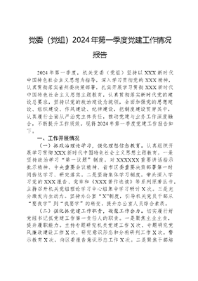 党委(党组)2024年第一季度党建工作情况报告2024年第一季度,机关党委(党组)坚持以XXX新时代中国特色社会主义思想为指导,深入学习贯彻党的XXX精神,认真贯彻落实省州委决策部署,扎实开展学习贯彻XXX新时代中国特色社会主义思想主题教育,认真贯彻落实新时代党的建设总要求,坚持以党的政治建设为统领,全面加强党的思想建设、组织建设、作风建设、纪律建设,把制度建设贯穿其中,认真履行全面从严治党主体责任,推动党建与业务工作深度融合,不断提升工作质效。现将2024年第一季度党建工作报告如下。一、工作开展情况(一)抓政治理论学习,强化理想信念教育。认真组织开展学习贯彻XXX新时代中国特色社会主义思想主题教育。一是坚持政治学习第一议题制度。对XXXXXX重要讲话指示批示精神、中央重要会议精神、省市区委重要决策部署第一时间传达学习、研究落实。二是坚持集体学习制度。带头深入学习党的XXX报告、党章和《XXX著作选读》等系列原著丛书,主持召开机关党组理论学习中心组集中学习研讨X次。三是充分激发内生动力。坚持办公室X制度,引导机关党员干部从要我学到我要学的转变,提升办公室人员综合素质。(二)强化抓党建工作职责,凝聚工作合力。切实履行好党组书记抓党建工作第一责任人的职责。一是聚焦主业主责,提升履职能力。主持专题研究机关党建工作X次、专题研究党风廉政建设工作X次,研究意识形态和分析研判工作X次,警示教育X次,向区委报告意识形态工作X次。二是聚焦干部培养,促进干部成长,聚焦配强支部班子,打造坚强战斗堡垒。补选机关总支委X名,机关第一支部X名,机关第一支部荣获先进基层党组织表彰、离退休干部党支部荣获市级X党支部。(三)坚持党建与业务同步抓,全面提升服务质量。坚持以X为总载体的机关党建工作,落实X,促进工作落实。一是抓好各项服务保障工作。完成重要会议保障X次,开展协调服务X余次,主持召开党组会议等X次。二是抓好乡村振兴工作任务。选派X名同志驻村担任第一书记和工作队员,组织机关干部进村入户开展X,落实帮扶资金X万元助力X。(四)发挥党员先锋模范作用,提高机关党建质效。认真落实党员到社区报到制度。一是以满意在X活动为契机,积极组织机关党员干部到社区开展环境卫生整治。二是组织机关党员干部开展文明斑马线志愿服务,抽调X名代表参与督查,合力推进文明行动。二、存在的问题和原因一是理论联系实际还有差距。对XXX新时代中国特色社会主义思想、党的XXX精神学深悟透上还有差距,理论水平和工作能力与当前新形势和新任务还有差距。二是机关第一支部、离退支部开展三会一课虽经常,但存在开展三会一课、主题党日活动等组织生活的时间不能相对X,存在见缝插针开展的情况。三是对总支、支部建设亲自指导不全面到位,推进不够均衡。党建工作创新不多,支部主题党日活动形式单一,党建创新工作亮点不突出。究其原因主要有:一是内在动力不够足。一定程度存在重业务轻党建情况,抓党建投入足够的精力和时间去研究谋划部署有待加强。二是工作标准不够高。对支部的工作要求上不够严格,开展工作办法不多,调动机关党员干部的积极性还有待加强。三是党建工作创新不够强。对新形势下落实好党建工作文可居文库——海量学习资料,手机电脑均可下载www.wenkeju.com责任制观念不新,以创新的思路、有效的措施抓深抓实基层党建工作有待加强。三、下一步工作打算(一)持续强化理论武装。巩固主题教育成果,切实增强学习的自觉性坚定性,坚持学原文读原著、悟原理知原义,不断拓宽干部职工的知识广度和知识深度,确保机关全体党员在理论素养上有提升。(二)严格组织生活制度。不断增强党内政治生活的严肃性,严格落实三会一课等党内组织生活制度。在认真落实规定动作的基础上,探索创新自选动作,不断增强机关党员活力。(三)发挥党建示范引领。结合四个机关建设要求,抓实作风建设改善年工作,推动机关党建与业务工作融合互促,着力强基础、转作风、树形象,用党建引领机关工作高质量发展。文可居文库——海量学习资料,手机电脑均可下载www.wenkeju.com