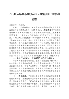 在2024年全市党校系统专题培训班上的辅导报告各位老师,同志们:党的XX大明确指出,新时代新征程要以中国式现代化全面推进中华民族伟大复兴。2023年3月,XXXXXX在中央党校建校90周年庆祝大会暨2023年春季学期开学典礼上发表重要讲话强调:党校始终不变的初心就是为党育才、为党献策。XXXXXX对党校初心的创造性总结和阐释,首次明确了党校事业的初心所在。其中,既有马克思主义中国化时代化的理论高度,也闪烁着深远的历史意义和时代光辉。党校初心不仅是对九十年来党校事业的高度重视和评价,更体现了党和人民对新时代党校事业蓬勃发展的殷切希冀。在全面建成社会主义现代化强国的第二个百年奋斗目标的关键时期,要发挥好党校(行政学院)干部教育培训主渠道主阵地作用,各级党校必须坚守这个初心,并将之作为全体党校人终身奋斗的重大使命一、党校为党育才、为党献策初心的生成缘由中国共产党的党校教育史,就是一部鲜活的初心史。初心是将一个政党组织性质、执政理念和根本宗旨进行理论化表达的内在形态。党校为党育才、为党献策初心是在培养党的干部、推动思想理论建设、服务党和人民事业中,基于马克思主义无产阶级政党建设思想和中国共产党党校事业建设实践相结合的产物。(一)理论溯源:党校初心是马克思主义经典作家党建理论的思想传承。虽然党校事业与干部教育培训工作没有在马克思、恩格斯等马克思主义经典作家著作中形成独立完整的篇章,但大量关于无产阶级政党干部教育、理论阐释宣传等内容在政党建设、共产主义教育等论述中出现,是党校为党育才、为党献策初心的思想萌芽和智慧之光。其一,马克思、恩格斯等论述了先进指导思想对政党建设的重要作用。先进的指导思想是认识世界、改造世界以及推动革命和建设的方向指引和科学武器。马克思指出:批判的武器当然不能代替武器的批判。物质力量只能用物质力量来摧毁;理论只要说服人,就能掌握群众。恩格斯提出了理论思维这一概念,并认为理论思维无非是才能方面的一种生来就有的素质,这种才能需要发展和培养。同时也强调无产阶级干部需要专业能力。恩格斯晚年在领导第二国际斗争中提出:过去的资产阶级革命,向大学要求的仅仅是律师,作为培养他们的政治活动家的最好的原料;而工人阶级的解放,除此之外,还需要医生,工程师,化学家,农业师及其他专门人才。因为问题在于,不仅要掌握政治机器,而且要掌管全部社会生产。这些思想和论述为无产阶级政党有组织成体系开展干部教育指明了方向。其二,马克思、恩格斯和列宁等强调党性问题是马克思主义政党建设理论的核心问题,而党性教育是党校工作的重中之重。恩格斯在1845年批判德国绝对的社会主义时指出这种社会主义由于自己的理论没有党性、思想绝对平静而丧失了最后一滴血、最后一点精神和力量。在编辑《新莱茵报》时期,马克思、恩格斯等人在一系列经典著作中反复强调理论教育的党性问题,并通过诸如协会组织、公开演讲、书信交流等方式开展了丰富且深刻的马克思主义理论教育,时刻向广大人民尤其是工人阶级宣传和普及无产阶级政党理论,可以说已具备成为一家面向全体无产阶级的共产主义党校的基本雏形。列宁在此基础上强调了具有组织形态意义的党性是捍卫党的纯洁性的关键所在,并在俄共(布)代表大会上多次研究了设立党校的相关工作,在党校层级设置、培训内容要求、师资队伍建设等方面的部署和论述对之后政党党校建设产生了深远影响。(二)历史使命:党校初心是中国共产党百年奋斗下党校事业的高度遵循。XXXXXX指出:党校在不同历史时期的重文可居文库——海量学习资料,手机电脑均可下载www.wenkeju.com大成就、光辉业绩都是在服从服务于党的中心工作中取得的。在新民主主义革命时期,锤炼一支坚毅忠诚的革命队伍是争取民族独立的关键所在。毛泽东同志强调掌握思想教育,是团结全党进行伟大政治斗争的中心环节。中国共产党成立初期,党内没有成立严格意义上的党校系统,各地党组织主要以小组(支部)内会议展开党员教育工作。直到1924年5月在中央扩大执行委员会会议上正式提出设置党校的议题,认为要急于设立党校养成指导人才,以解决党内同志关系不密切和干部队伍紧缺等问题。1924年12月,在安源工人补习学校的基础上组织成立了第一所以党校命名的地方党校——中共安源地委党校;1933年3月在瑞金创办的马克思共产主义学校,标志着中央党校的正式成立。在延安整风运动中中央党校成为重要的大本营,是唯一一家由毛泽东亲自领导的整风单位。在艰苦的革命年代,党校以先进的马克思主义强化了一批又一批党员干部的意志信仰。在社会主义革命和建设时期,为新中国建设培训储备理论干部成为党校工作的中心所在。随着《关于轮训全党高、中级干部和调整党校的计划》等一系列文件出台,党校系统迅速发展,精准的发展定位和完