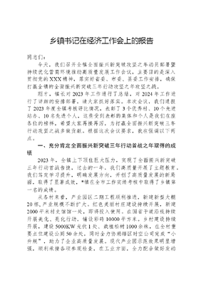 乡镇书记在经济工作会上的报告同志们:今天,我们召开全镇全面振兴新突破攻坚之年动员部署暨持续优化营商环境推动高质量发展工作会议,主要目的是深入贯彻党的XXX精神,落实好省委、市委、县委工作安排,确保打赢全镇的全面振兴新突破三年行动攻坚之年攻坚之战。刚才,镇长对2023年工作进行了总结,对2024年工作进行了详细的安排部署,请大家抓好落实。本次会议,我们通报了2023年度全镇考核评比情况,表彰了3个优秀村、10个先进站办、10名先进个人,这些受到表彰的集体和个人是我们在座各位的榜样,希望大家再接再厉,为打赢全面振兴新突破三年行动攻坚之战多做贡献。根据这次会议要求,我在强调以下两点。一、充分肯定全面振兴新突破三年行动首战之年取得的成绩2023年,全镇上下顶住巨大压力,实现了全面振兴新突破三年行动首战告捷,过去的一年,我们高质量开展了主题教育,我们笃定学习提升,明确发展方向,开创了高质量发展的新局面,取得了显著成效,*镇在全市工作实绩考核中取得了乡镇第一名的成绩。从各村来看,产业园区二期工程顺利推进,新建新型大棚20栋, 产业规模不断扩大。红色美丽村庄建设持续开展,新建2000平米村史馆馆一处,即将投入使用。在国省干道沿线持续开展美化、亮化行动,铺设彩砖10000平方米。乡村建设持续开展,建设5000KW光伏1处、栽植松树1000余株,在全村重要点位建设公厕50余处,同时全力协助辖区时空公司完成小升规,助力了企业高质量发展。现代产业园示范效果明显增强,顺利承接各项参观检查,在工业方面,全力配合做好发动厂区扩建工作,确保了市委重点项目顺利开展。党组织领办合作社再创佳绩,打造了效益好、带动能力强的党支部领办合作社的典范,得到了上级部门的充分肯定。充分发挥临近市区、土地肥沃等优势,带领村民总结学习大葱、辣椒等经济作物种植经验,喜获丰收。从镇级层面来看,党的建设不断加强,党建统领作用持续深化;从严治党向纵深推进,政治生态得到有效净化;精神文明建设成果不断提升,*镇被评为文明村镇标兵;政法四所一庭作用发挥明显,基层信访矛盾得到有效化解,重要节点时期未出现越级访集体访事件;招商引资取得突破,成功引进企业2家;乡村振兴资产收益不断增强,累计上缴收益200余万元;农业粮食安全保障到位,顺利完成全国农产品安全县创建工作;林业积极贯彻落实工作安排,超任务高质量完成村屯绿化工作;水利助推产业园区高质量发展,圆满解决产业园供水问题;畜牧顺利完成春秋两季免疫,全年未发生重大动物疾病;环境卫生做到常态化保持,顺利完成各项检查工作;燃气排查、危房改造稳步推进,住房安全不断提高;退役军人管理不断健全,各项保障更加全面;交通路长制不断完善,群众安全出行得到保障;安全生产常抓不懈,生产环境持续稳定;文化事业更加繁荣,精神文明建设持续加强;税收工作平稳运行,实现税收2000万元,完成任务数的120%;民生事业不断发展,低保、五保保障效果显著加强;全民参保不断推进,养老保险、医疗保险覆盖面持续扩大;卫计两个责任得到有效落实,未发生食品安全事故;营商环境不断优化,建设高标准便民服务中心1处,全面提高了为民服务能力。此外,武装、统战、工会、共青团、妇联、科协、统计等各个部门在一年的工作均发挥了积极作用。这些成绩的取得,得益于市委、市政府的坚强领导,得益于镇党委、镇政府、镇人大通力合作、同向发力,更主要的是,离不开在座各村、各部门的辛苦付出和努力工作,在此,我代文可居文库——海量学习资料,手机电脑均可下载www.wenkeju.com表镇党委,向大家表示衷心的感谢,并致以崇高的敬意!二、以笃定高质量发展的战略定力和务实的举措奋力实现连战连胜2024年是省全面振兴新突破三年行动攻坚之年,是承前启后的关键之年,全镇上下要坚持全面贯彻党的XXX精神,进一步落实省市县三级全面振兴新突破暨优化营商环境大会会议精神,紧盯重点抓落实、紧盯任务抓攻坚、紧盯问题抓突破,以新气象新担当新作为推动*镇全面振兴。一是加强党的建设,凝聚振兴合力。全面落实新时代党的建设总要求,坚持党要管党、从严治党,各村党组织书记要带头做到不折不扣执行上级决策部署,确保党中央、省委、市委及县委部署要求不折不扣落到实处、见到实效。建立巩固深化主题教育成果长效机制,切实把学习成果转化为筑牢理想信念、锤炼坚强党性的政治自觉。推进全面从严治党向纵深开展,锲而不舍落实中央八项规定及其实施细则精神,加强反腐倡廉警示教育,保障权利规范透明运行。各村要做好村党组织书记后备人选培养工作,2025年末,各村即将换届,要做好后备人选的选拔及传帮带培养工作,确保换届后村级各项工作接续发展。二是强化招商引资,推进项目建设。把招商引资作为主责主业,各村、各部门都要树立起主动招商的理念,始终把招商引资作为推动高质量发展的强引擎