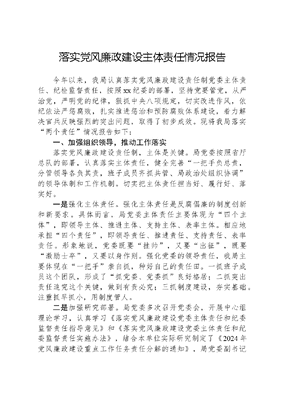 落实党风廉政建设主体责任情况报告今年以来,我局认真落实党风廉政建设责任制党委主体责任、纪检监督责任,按照xx纪委的部署,坚持党要管党,从严治党,严明党的纪律,狠抓中央八项规定,切实改进作风,依纪依法严惩腐败,扎实推进惩治和预防腐败体系建设,着力解决官兵反映强烈的突出问题,取得了初步成效。现将我局落实两个责任情况报告如下:一、加强组织领导,推动工作落实落实党风廉政建设责任制,主体是关键。局党委按照省厅总队的部署,认真落实主体责任,健全完善一把手负总责,分管领导各负其责,班子成员齐抓共管、局政治处组织协调的领导体制和工作机制。切实把主体责任担当好、履行好、落实好。一是强化主体责任。强化主体责任是反腐倡廉的制度创新和新要求。具体而言,局党委主体责任主要体现为四个主体,即领导主体、推进主体、支持主体、表率主体。相应地承担四个责任,即领导责任、推进责任、支持责任、表率责任。形象地说,党委既要挂帅,又要出征,既要激励士卒,又要以身作则。强化党委的领导责任,我局主要体现在一把手亲自抓,种好自己的责任田。一抓班子成员这个团队,形成了抓党委、党委抓良好格居;二抓突出责任追究这个关键,做到有责必究;三抓制度建设,夯实基础。注重抓早抓小,用制度管人。二是加强研究部署。局党委多次召开党委会,开展中心组理论学习,认真学习《落实党风廉政建设党委主体责任和纪委监督责任指导意见》和《落实党风廉政建设党委主体责任和纪委监督责任实施办法》,结合本单位实际研究制定了《2024年党风廉政建设重点工作任务责任分解的通知》,局党委副书记xx代表党委与基层主官签订了《2024年党风廉政建设责任书》对重点任务和工作责任分解细化、责任到人,形成横向到边、纵向到底、覆盖完整、责任落实的责任体系。三是强化各级党组织意识。局党委始终坚持把党风廉政建设纳入全年工作考核重点项目,与业务工作一起部署,统一实施。局党委常委按照责任区分工,定期听取各单位党风廉政建设和反腐败工作情况汇报,定期对基层单位党风廉政建设和反腐败工作进行调研,定期带队对各单位党风廉政建设责任制落实情况督导检查。四是选好用好干部。组织开展对责任制落实情况的监督检查和考评,并将检查、考核的结果作为干部考核使用、评先选优的重要依据,切实维护党风廉政建设责任制的严肃性,确保党风廉政建设和作风建设各项任务有效落实。二、严肃党的纪律,确保政令畅通局党委坚持把严肃党的纪律作为党风廉政建设的第一项任务,自觉担负起执行和维护党的纪律的责任。结合当前的专题教育和突出问题教育、预防与专项整治工作,组织开展党风廉政建设宣传教育月活动,努力提升党员干部拒腐防变能力和严格执行党的各项纪律意识。一是开展党员干部严明党的纪律集中教育活动。以专题教育活动为契机,通过书记上党课和集中学习,邀请市党校老师和市纪委领导作专题报告,在班子成员中开展群众满意政绩观大讨论和两个责任落实专题研讨,在全体党员干部中开展假如我是服务对象微信群大讨论。同时组织机关党员深入学习党章,开展严守党的政治纪律、组织纪律集中教育活动。引导党员干部以身作则、率先垂范,主动维护党的纪律,坚持原则、敢抓敢管,切实增强纪律执行力,坚决维护纪律的严肃性和权威性。二是开展好干部标准大讨论,赴武乡红色教育基地和平顺廉政教育基地开展实地教育,充分利用身边的典型引导全体机文可居文库——海量学习资料,手机电脑均可下载www.wenkeju.com关干部弘扬公仆情怀、求实作风、奋斗精神和道德情操。三是深入开展宣传教育活动。全体党员干部对照三严三实的要求,深入查摆自己在思想境界,素质能力、作风形象等方面存在的问题与不足,边查边改、立行立改。结合全局党员干部思想、工作、作风的实际,组织全体机关干部学习党章,中央、公安部有关勤政廉政等方面的知识,增强他们的政治纪律、组织纪律观点,提升廉洁自律意识,强化务实、高效的作风。三、强化作风建设,促进环境优化一是完善制度,着力健全长效机制。在作风建设工作中,先后修订完善了机关廉政、考勤、理论学习、值班、保密等制度,同时,将机关各项制度与问责追究相结合,用制度切实保障作风建设效果,努力达到治庸提能、治懒提效、治散提神、治软提劲的目标。二是狠刹大操大办,借机剑财之风。多次组织全体机关干部学习《关于严禁党员干部大操大办婚丧喜庆事宜借机剑财的若干规定的通知》,领导班子成员对照若干准则签订严禁大操大办婚丧喜庆事宜借机剑财承诺书,到目前为止,没有发现违规违纪现象。三是加强督办,始终保持高压态势。大力支持纪检监察工作,定期开展检查督查,抓好各部门、单位及个人的本职工作完成情况的检查督查,重点督查全市消防部队中心工作。对工作措施不力、影响全局工作开展的,要求迅速整改并跟踪督办,促进工作落实。我局党风廉政建设虽