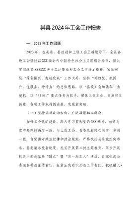 某县2024年工会工作报告一、2023年工作回顾2023年,在县委、县政府和上级工会正确领导下,全县各级工会坚持以XXX新时代中国特色社会主义思想为指导,深入贯彻落实XXXXXX关于工运事业和工会工作指示精神,紧紧围绕绿色振兴、赶超发展工作大局,坚持补短板、抓提升、优服务、增活力的总体思路,以县级工会加强年为契机,以42101重点任务为抓手,聚焦主责主业,突出抓主抓重,各项工作取得新进展、实现新突破。(一)坚持正确政治方向,广泛凝聚职工群众。加强工会党的建设。深入学习贯彻党的XXX精神,始终与党中央保持高度一致,与上级工会、县委政府同心同向、步调一致。自觉遵守政治纪律和政治规矩,严格执行县总党组向市总、县委请示报告制度。扎实开展第二批主题教育,同步开展机关干部赴基层蹲点暨当一周工人活动。自觉担起县委巡察整改主体责任,压紧压实意识形态工作责任。积极融入*发展,与*市*区总工会签署对口合作协议书,开展对口合作地区工会干部双向培训,先后接待市及徐汇区、区职工疗休养活动4批次。强化职工思想引领。常态开展中国梦·劳动美主题宣教活动,举办工会干部大宣讲、微视频征集、主题演讲、好网民活动等30多场次,带动基层开展诵读、摄影、读书交流会等主题宣教活动。编纂印制《*劳模》画册、在城区打造劳模广场、依托媒体平台宣传劳模先进事迹。开展劳模工匠六进活动10余场,覆盖职工群众近万人次。维护劳动领域政治安全。扎实开展劳动关系风险监测预警、分析研判和矛盾隐患排查,认真落实五个坚决要求,切实做到五个不发生。健全协调劳动关系三方协调机制,依托县职工维权法律顾问团、法院+工会+人社+司法劳动争议诉调对接工作室等载体,聚焦货车司机、快递员、外卖员、农民工等重点群体,加强工会法律援助、劳动法律监督、劳动争议调解工作,着力构建和谐劳动关系。2023年以来接受文可居文库——海量学习资料,手机电脑均可下载www.wenkeju.com咨询150余人次,排查化解风险隐患8个,调解劳动争议纠纷28起。推进企事业单位民主管理。召开领导小组和办公室会议,将民主管理工作纳入民营企业工会年度考核,推动县内重点企业普遍建立职代会制度。以贯彻《省职工代表大会操作规程》为抓手,举办企业民主管理、职工代表专题培训班。开展公开解难题、民主促发展主题活动,激发职工代表参与企业民主管理的内生动力。全年征集职工代表提案14个,其中:X胜利精密制造科技有限公司职工X提出的《关于塑胶成形的人机分离的提案》获评全省优秀职工代表提案。(二)着力加强组织建设,持续夯实基层基础。县级工会加强年成果显著。在省总权益保障部对口联系指导下,出台工作方案,成立工作专班,组织实施四大行动。定期向县委请示汇报工作,政府与工会联席会议、产改、推行厂务公开、协调劳动关系等制度机制全面落实。扎实推进就业援助、技能培训、劳动竞赛、跟着劳模去创新等工作。做好困难帮扶、互助保障、四季送、五一学文可居文库——海量学习资料,手机电脑均可下载www.wenkeju.com堂公益培训、新就业形态劳动者暖心行动、工会驿站建设等民生实事。实施民营企业工会赛马行动、乡村工会领航计划、打造新业态工会公益联盟,新业态、民营企业及小三级工会工作活力持续释放。建会入会任务超额完成。通过重点建、行业建、兜底建相结合的方式,强力推进建会入会,全年新增工会组织31个,新增工会会员3533名,其中农民工、新业态劳动者会员新增数均位居全市第一。截止2023年底,全县工会组织1175个,工会会员70844人。干部队伍建设持续发力。结合工会干部本领锤炼工程,采取线上+线下走出去、请进来等方式开展各类业务培训8场次,参训人数近千余人次。举办全县工会干部能力提升专题培训班,邀请省总干校专家领导授课,增强各级工会干部的群众工作本领和服务职工能力。(三)发挥工会职能作用,助力服务发展大局。多措并举推动产业工人素质提升。开展建功十四五奋进新征程劳动和技能竞赛,在快递物流、供电服务等行业开展文可居文库——海量学习资料,手机电脑均可下载www.wenkeju.com竞赛,联合教育、卫健、金融、公安等开展业务性技能竞赛,带动电子信息、智能制造、食品加工、纺织服装等领域企业开展岗位练兵、技术比武、五小活动等,累计参赛职工近万人次。组织动员65家非公企业1.3万余名职工参与市安康杯竞赛活动。面向农民工、困难职工、女职工等群体开展免费技能培训21场次。设立X工匠学院,按照1+2+N建设模式,培养适应高质量发展的技能型人才。提质扩面推进工会驿站建设。按照八有标准,全县全年共商共建户外劳动者驿站150处,超额完成年度目标任务。设立奖补资金