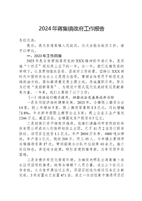 2024年蒋集镇政府工作报告各位代表:现在,我代表蒋集镇人民政府,向大会报告政府工作,请予以审议。一、2023年工作回顾2023年是全面贯彻落实党的XXX精神的开局之年,是实施十四五规划承上启下的一年。这一年,我们在镇党委的带领下,认真贯彻落实县委、县政府工作部署,坚持以XXX新时代中国特色社会主义思想为指导,带领全体党员干部坚定正确政治方向。紧扣高质量发展主题主线,忠诚履职尽责,努力为打造美丽新蒋集、为建设中国式现代化美好定远贡献蒋集力量。一年来,我们主要做了以下工作:(一)经济运行稳步提升,助推社会发展再迈新台阶一是各项经济指标健康发展。2023年,全镇限上商贸企业14家,较上年增加5家,限上商贸零售额1.3亿元,同比增幅71.8%,年末新申报限上商贸企业3家;规上企业工业产值达2246万元。截至目前,全镇固定资产投资0.3亿元。二是招商引资平稳有序推进。我镇引进滁州市宏然纺织科技有限公司成功入住张桥轻纺工业园,已于11月2日签订投资协议。该项目总投资1.1亿元,年产2000万米布、4000吨加弹丝,年产值1亿元、税收200万,用工45人。今年镇主要领导在镇接待客商17次,带领招商小分队外出招商40余天,推介定远特色,讲述地方政策,吸引客商到镇考察,力争项目早日落地。三是多措并举优化营商环境。为确保光明乳业蒋集镇卜店社区项目顺利推进,统筹全镇精干人员力量,成立三个征迁工作专班,大力度开展征迁工作,项目区红线内拆迁任务已全部完成。3处安置点已安置471套。成立一办四组集中推进项目区土地流转工作,已流转3村47村民组,共计约18000亩。常态化开展辖区汇丰包装制品、创佳苗木、龙德猪场等企业走访活动,了解生产运行情况,宣传惠企政策,帮助企业纾困,协助解决实际难题。(二)大力实施乡村振兴,推进农业农村现代化发展一是农业生产喜获丰收。午季小麦收获6万亩,总产2.3万吨;油菜收获0.65万亩,总产720吨;水稻种植6.1万亩,总产3万吨;玉米1.5万亩,总产0.6万吨;大豆0.62万亩,总产950吨;花生0.41万亩,总产800吨。根据省两强一增工作精神,宣传发动种粮大户购置大型先进农机具,提高农业生产全程机械化水平,示范带动周边农户,午秋二季,本镇176台收割机和引入外来收割机120多台参加抢收工作,有力保障农业收成。二是人居环境不断提升。继续实行党委书记、镇长双组长制,分管负责人具体抓,共拆除无功能用房9处15间,乱搭乱建5处,清理污水沟1800多米,清理养殖粪便及农业生产废弃物620多吨。每月开展3次人居环境检查,督促问题整改。建成蒋集西庄、井岗吕巷、韩庄等人居环境整治示范点,引领广大群众开展农户庭院四净两规范,做到四勤两参与,扎实做好五清一改。月处理生活垃圾140余吨,农村垃圾治理工作取得了较好效果。三是街道治理成效明显。已重点整治街道乱拉乱挂1260余处、乱堆乱放800余处、车辆乱停乱放1800余处、出店经营520余处、清理牛皮癣及废旧小广告1600多处、加固路灯9处、维修疏通下水道窨井盖15处、清理破碎花坛20处、种植木质花箱式花卉200处、维护浇水4次。四是农村改厕有序推进。全力开展2013年以来农村改厕排查整改工作,针对2017至2022年2401个改造厕所,逐户核实,排查出266个立行立改问题,已全部整改。今年我镇改厕任务240个,所有厕屋均完成建设,等待县厕具供应。文可居文库——海量学习资料,手机电脑均可下载www.wenkeju.com五是生态环境实现优化。实行环保党政同责和一岗双责,对2021年中央第三生态环境保护督察组交办信访件及黑臭水体问题开展整改回头看,无反弹现象;对镇内6座农村污水处理站开展巡查48次,发现异常均限期整改到位;对辖区企业的环保设备开展排查,对发现问题限期整改。针对秸秆禁烧,引进5个铁塔监控全镇,已推送600余条火情信息,均及时处理;重点时段开展巡逻督查110天660余次,并制作宣传单4500余份,宣传标语85幅,全面加强政策宣传和网格化管理。六是筑巢引凤聚才引智。开展在外优秀人才摸排统计工作目前已登记党政机关、企事业单位等各类在册优秀人才27名。开展紧缺人才引进工作,共引进3名本科学历人员进入村两委,4名大专及以上学历人员担任村专干职务,2名本科毕业生后备干部。七是乡风文明大步改善。持续完善1+7+N新时代文明实践阵地建设,开展志愿服务、公益宣传等实践活动,利用元宵、端午等传统节日,开展我们的节日系列主题活动,对空巢老人、留守儿童等开展关爱行动。广泛宣传社会主义核心价值观、文明公约等内容,坚持开展五类好人等推选活动,用身边人身边事教育引导广大群众崇尚文明。完善村规民约,挖掘优秀典型人物事迹,养成新俗新风。八是脱贫成果持续巩固。现