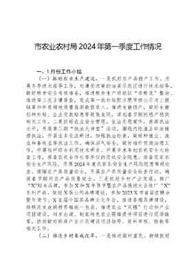 市农业农村局2024年第一季度工作情况一、1月份工作小结(一)抓好农业生产建设。一是抓好农产品稳产工作。开展冬季技术指导工作,对遭受冻害的油菜示范区进行技术指导,做好粮食安全考核准备,推进粮食生产功能区非粮化整治。推进第三次土壤普查,完成第一批补贴配方肥审核公示与上报结算和年度耕地质量监测数据录入。推进生猪稳产,做好生猪引种补贴、企业贷款贴息等政策兑现,谋划春节期间稳产稳供相关工作。二是抓好农业安全管理。依法办理案件,提高执法水平,开展第三期执法大讲堂活动,围绕内陆渔业非法捕捞执法,开展业务交流研讨。加强执法检查,做好种植业、渔业和畜牧业等执法工作。确保沼气安全,做好秸秆焚烧治理工作,开展秸秆综合利用技术研发。开展岁末年初农机安全大检查工作,排查农机合作社等单位的农机安全隐患。排查农家乐安全生产风险,开展2024年度农家乐安全生产风险隐患常规检查。保障农产品质量安全,开展农产品质量安全检查行动,确保春节期间农产品质量安全。三是抓好乡村产业发展。推广X稻米品牌,参加X和X年货节暨农产品展销大会推广X系列产品。做好X茶公用品牌建设,参加2023 X市首届农博会暨年货节、X首届中国茶品牌文化年会。推进香榧品牌建设,按规范发放枫桥香榧统一包装。推进农业双强行动和产业项目建设,对东白湖、赵家特色农业强镇提升项目进行现场踏看,协助做好珍珠产业示范建设项目指导、资料审核、验收等相关工作。(二)推进乡村集成改革。一是推进强村富民。持续抓好村集体经济发展,2023年度村集体经济总收入和经营性收入增幅均超农民人均可支配收入增幅,完成省市考核任务。深化低收入农户帮促,做好X农帮扶系统数据审核,完成X、X、X三镇相关低收入农户产业帮促基地验收。二是推进土地改革。做好农民建房一件事审批管理,做好试点镇街复垦项目立项工作,做好农业标准地建设。推进二轮延包试点工作,出台相关政策,调研X镇、X镇延包试点情况,收集工作难题,并提出意见建议。稳步推进土地流转工作,与X、X等乡镇对接土地流转工作,与X集团、X镇探索已流转土地的经营方式;开展农事服务中心的全过程咨询服务项目招投标项目,其中项目设施用地已确定,平面布置图已定稿。(三)推进美丽乡村迭代。一是推进县城承载能力提升和深化千村示范、万村整治工程。摸排报送城乡提升工程2024年重大项目。二是历史文化(传统)村落保护利用工作。指导应店街镇紫阆村准备迎接历史文化村落保护利用验收。三是推进农村人居环境长效管理。开展农村人居环境总结排名工作,汇总多方情况评估年终加减分,下发第四季度及全年排名通报,配合组织部开展第四季度约谈。做好农村生活垃圾分类工作,进行2023年度农村生活垃圾分类处理相关数据汇总和工作总结。开展易腐垃圾站点改造升级2024-2027改造升级摸排,完善农村生活垃圾大数据监管平台一期运维项目资料,加快推进运维落地。推动农村人居环境物业整治模式试点工作,起草方案,摸排各镇街试点意向。开展2023年健康X对镇乡(街道)考核和总结自评工作,迎接健康X第二次检查。开展全市农村管线序化摸排调研工作,撰写调研报告。二、2月份工作小结(一)抓好农业生产建设。一是抓好农产品稳产工作。做好春耕备耕服务工作,开展小麦、油菜技术指导,落实2024高产攻关田,召开春耕备耕座谈会。推进粮食生产功能区非粮化整治,推进第三次土壤普查,全面开展剖面土壤调查采样。文可居文库——海量学习资料,手机电脑均可下载www.wenkeju.com推进生猪稳产,上门指导保留场、新建场的生猪生产。二是抓好农业安全管理。加强执法检查,做好种植业、渔业和畜牧业等执法工作,开展浦阳江清网行动。确保沼气安全,完成2024年度沼气后续服务招投标,做好节前沼气安全巡查。开展春节春运期间农机安全隐患大排查工作,进一步加强农机安全宣传教育工作。排查农家乐安全生产风险,开展2024年度农家乐安全生产风险隐患常规检查,确保春节期间农家乐生产安全。保障农产品质量安全,检查农产品生产基地和绿色食品企业,确保相关标记、承诺达标合格证的规范使用。三是抓好乡村产业发展。推广X稻米品牌,参加X市农博会X展销,参与爱心食堂·共享五福活动。做好X茶公用品牌建设,初拟第三届三茶统筹大会方案,起草2024年品牌建设相关文件材料。推进香榧品牌建设,确保春节期间博物馆有序运营,接待游客访问量1000人次以上。推进农业双强行动,完善项目实施方案并报送省厅。推进产业项目建设,做好珍珠数字化深加工示范园建设等完工项目的验收、资料归档工作,做好同山烧非遗技艺传承基地等项目的验收指导工作。做好2024年度农业政策性保险相关政策拟定及地方性保险品种鳞选工作。(二)推进乡村集成改革。一是推进强村富民。持续抓好村集体经济发展,完成2023年第四季度