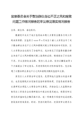 监察委员会关于整治群众身边不正之风和腐败问题工作情况报告的审议意见落实情况报告主任、副主任,各位委员:根据党中央关于地方监委向本级人大常委会报告专项工作的决策部署,区监委于xxxx年x月向区十届人大常委会作了关于整治群众身边不正之风和腐败问题工作情况的专项报告。区人大常委会会议进行了分组审议,充分肯定了区监委在整治群众身边不正之风和腐败问题上取得的成绩,精准指出了存在的不足,并从坚持依法治腐、坚持人民立场、坚持以廉促政等x个方面提出了审议意见,具有很强的针对性和指导性,充分体现了对整治群众身边不正之风和腐败问题的监督和支持。落实区人大常委会审议意见,是贯彻执行监察法的基本要求,也是监察机关自觉接受监督的重要体现。区监委高度重视、认真研究办理区人大常委会审议意见,并结合区人大监察和法制司法工作委员会在调研报告中提出的意见建议,将落实审议意见的举措细化分解具体任务,逐一明确责任科室和完成时限,督促抓好有效落实。同时,坚持问题导向,把落实审议意见与改进提升整治群众身边不正之风和腐败问题工作紧密结合起来,与奋力打造新时代清廉建设高地区域样板紧密结合起来,积极探索创新,对短期内可以整改到位的,立行立改、及时销号;对需要相关部门支持配合的,主动对接、严格落实;对需要纳入久久为功的长期任务,统筹谋划、分步落实。现将区监委落实区人大常委会审议意见,加强和改进整治群众身边不正之风和腐败问题工作有关情况报告如下。一、坚持党的领导,筑牢对党忠诚政治根基。坚持和加强党对反腐败工作的集中统一领导,自觉在以A同志为核心的党中央领导下开展工作,进一步深化落实双重领导体制,坚决落实重大事项、重要工作向同级党委请示报告制度,始终同区委保持高度一致,服从发展大局。聚焦AXXX重要指示批示精神贯彻落实情况,紧紧围绕三个一号工程,不断深化四统一政治监督机制,督促全区各级党组织自觉把党的领导落实到各领域各方面各环节。深刻理解六个如何始终重大命题,结合党的XXX精神和中央、省、市纪委全会精神,谋划xxxx年纪检监察工作,将整治群众身边的不正之风和腐败问题作为全文可居文库——海量学习资料,手机电脑均可下载www.wenkeju.com会报告年度重点,逐条逐项明确目标,确保任务有效落实。扎实开展纪检监察干部队伍教育整顿活动,确保全体纪检监察干部始终忠诚干净担当、敢于善于斗争。二、坚持依法监督,始终严守纪法权力边界。着力建强基层监察体系,强化派驻机构开展监察监督等方面领导,以点带面深化街镇监察办运转,定期组织听取派驻机构、街镇监察办述职汇报,有力实现监察监督全覆盖。强化法治监督思维,结合党纪党章党规和国家法律法规,率全市之先编制派驻机构和街镇纪(工)委履职三手册两规定一期刊,结合每月定期检查+随机检查常态化自查自纠,推动各纪检监察组织依规依纪依法履职。深化基层监察机构规范建设,将政治学习、法治建设、监察业务等内容纳入全员培训体系,开展街镇纪(工)委双十佳和村社监察工作联络站双优比选xxxx年,我区街镇纪(工)委实现自办案件全破零,村级监察工作联络站报送问题xxx条,有力提升区镇村三级监察组织依法履职水平。三、坚持系统集成,全面提升监察监督质效。探索人大监文可居文库——海量学习资料,手机电脑均可下载www.wenkeju.com督与监察监督深度融合路径,有序向同级人大常委会报告专项工作,进一步完善区监委与区人大常委会在信息沟通、情况通报和线索移送等方面协作配合。充分发挥党委反腐败协调小组作用,持续畅通监察机关与公检法、审计等机关协作配合,深化问题线索会商、案件移送处置等方面协作,构建各负其责、统一协调的反腐败工作格局。主动接受外部监督,聘任xx名区监委第一届特约监察员,确保权力行使始终有约束。四、坚持人民立场,专项整治群众急难愁盼。深化x+X协同监督机制和x+x+xx工作模式,严肃整治享乐主义、奢靡之风尤其是指尖上的形式主义问题,严查酒驾醉驾等背后四风问题,着力推进作风建设走深走实。点题整治反映强烈问题,围绕拆迁安置、渣土运输乱象、教育乱收费等xx个群众急难愁盼深化治理,共督促解决问题xx个,查处问题x起xx人,治理工作获评区书记办实事十佳项目。聚焦营商环境优化提升一号改革工程,大力优化构建亲清政商关系,持续深化一平台两应答三模拟四清单监督机制,突出解决小鬼难缠、吃拿卡要微腐败问题,区纪委主文可居文库——海量学习资料,手机电脑均可下载www.wenkeju.com要领导亲自召开纪企连心亲清共情沙龙活动,共立案查处亲清不分典型案件xx件,破解企业急难愁盼问题xxx件,推动全区xx项重大工程项目顺利进行。五、坚持源头施策,有力整肃基层小微权力。以保障增进民生福祉、