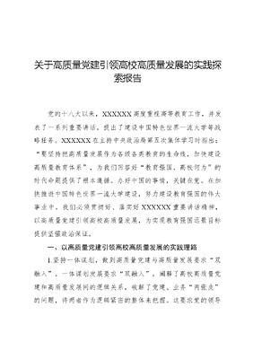 关于高质量党建引领高校高质量发展的实践探索报告党的十八大以来,XXXXXX高度重视高等教育工作,并发表了一系列重要讲话,提出了建设中国特色世界一流大学等战略任务。XXXXXX在主持中央政治局第五次集体学习时指出:要坚持把高质量发展作为各级各类教育的生命线,加快建设高质量教育体系,为我们回答好教育强国,高校何为的时代命题提供了根本遵循。办好中国的事情,关键在党。在加快推进中国特色世界一流大学建设,努力建设教育强国的伟大事业中,我们必须贯彻好、落实好XXXXXX重要讲话精神,以高质量党建引领高校高质量发展,为实现教育强国远景目标提供坚强政治保证。一、以高质量党建引领高校高质量发展的实践理路1.坚持一体谋划,做到高质量党建与高质量发展要求双融入。一体谋划发展要求双融入,阐释了高校高质量党建和高质量发展间的逻辑关系,破解了党建、业务两张皮的问题,将两者作为逻辑紧密的整体来把握。这要求党的领导方式更加科学、领导作用更加有效。高校要以为党育人、为国育才为使命,以党的建设理论和现代系统管理理论、嵌入式管理理论等科学理论为指导,把立德树人和教育教学改革中的难点和重点作为党建工作的出发点和落脚点,将党建和高质量发展各自的标准、要求、任务、措施等相互融入、协同联动,整体设计党建与高质量发展的目标,形成硬指标、硬任务、硬要求,不断提升基层党建质量,促使政治底色和发展亮色交相呼应,进而在学校教育事业发展中交出高质量发展的亮丽成绩单。2.坚持一体部署,做到高质量党建与高质量发展任务双认领。一体部署发展任务双认领,即按照党政同责、一岗双责、齐抓共管、失职追责的要求,抓住高水平大学这个牛鼻子,在克服形式主义、官僚主义上精准发力。高校要同步分解细化党建和高质量发展各项任务,明确牵头部门、协办部门,确保任务到部门、责任到个人、落实到节点,要求党政分工负责与齐抓共管相结合,各司其职、密切配合,推动双认领理念内化于心,外化于行。高校要以加强一流学科、一流专业建设为抓手,把高质量党建工作落实到学校各项业务中,不断优化关键资源要素配置;积极发挥基层党组织的动员力和组织力,打造党建标杆院系,把党支部建在教研团队、科文可居文库——海量学习资料,手机电脑均可下载www.wenkeju.com创团队上,充分展现党员干部的先锋形象,鼓励广大师生党员在双认领中作表率、立标杆、当头雁。3.坚持一体发力,做到高质量党建与高质量发展落实双推动。一体发力发展落实双推动,即要求在党建各项工作中狠抓落实,在制度执行上精准发力。在推进党的建设过程中,增强狠抓落实本领,坚持说实话、谋实事、出实招、求实效,把雷厉风行和久久为功有机结合起来,勇于攻坚克难,以钉钉子精神做实做细做好各项工作。高校提升党建质量关键要把党的政治优势转化为高校高质量发展的机制优势,充分发挥高质量党建的引领保障作用、高质量发展的指挥棒作用,着力破解不会抓、抓不好、谁来抓、怎么抓等系列难题。高校要坚持围绕中心抓党建、抓好党建促发展的指导思想,分类实施党建工作质量提升工程,平稳有序推动体制机制改革,既要重结果,更要重过程,透过现象看本质、透过数据找规律,以更高标准、更实举措推动高质量党建与高质量发展双融双促。4.坚持一体考核,做到高质量党建与高质量发展结果双印证。一体考核发展结果双引证,即要求凸显党建成果与高质量发展成果之间的内在逻辑关系。党建发挥龙头作用,高校事业高质量发展是目标。一方面,要围绕高质量发展目标文可居文库——海量学习资料,手机电脑均可下载www.wenkeju.com任务,拟定高校年度党建工作重点任务清单,把党的领导和党的要求贯穿到党要管党、办学治校的全过程,推动党建与高质量发展深度融合;另一方面,要抓紧为什么考的牛鼻子、聚焦考什么的关键点、把牢如何考的方向盘,同步考核党建成果和高质量发展成果,构建全过程、全方位的质量考核与评价体系。在考核手段上要强化数据赋能,运用考核大数据绘制高质量发展知识图;在考核结果上要发挥复盘作用,以高质量党建成果作为解释高质量发展成果的重要原因,以高质量发展成果作为检验高质量党建成果的重要标准。二、以高质量党建引领高校高质量发展的实施路径1.强化政治统领,坚持社会主义办学方向,进一步提高高质量发展站位。党的政治建设是党的根本性建设,决定党的建设方向和效果。新时代高校党的建设要以党的政治建设为统领,做到高点站位、高位谋划、高效推进,努力把高校党的政治领导转化为推进高校治理体系和治理能力现代化的实际效能。着力抓好五个第一,即第一时间学习贯彻XXXXXX最新重要讲话精神,及时传达落实上级决策部署;坚决贯彻第一议题制度,将学习领会XXXXXX相关重要论述精神作为重大