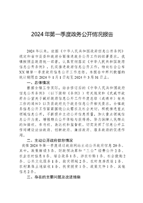 2024年第一季度政务公开情况报告 2024年以来,依据《中华人民共和国政府信息公开条例》规定和省市县委和政府全面推进政务公开工作的部署要求,我镇按照县政府统一部署,认真贯彻落实《中华人民共和国政府信息公开条例》,扎实推进政府信息公开工作,特向社会公布XX镇第一季度政府信息公开工作总结。本报告中所列数据的统计期限自2024年1月1日起至2024年3月31日止。一、总体情况根据全镇工作实际,结合修订后的《中华人民共和国政府信息公开条例》(以下简称《条例》)有关规定和《武威市政府办公室关于做好政府信息公开工作年度总结(成绩单)有关工作的通知》以及县政府关于政务信息公开相关要求,全镇政务信息公开工作紧紧围绕公众需求及社会关切,积极推进重点领域信息公开,不断提升主动公开信息质量,加大重点领域信息公开力度,增强群众公开体验与获得感,努力保障人民群众的知情权、参与权、表达权和监督权。切实发挥了信息公开工作对建设法治政府、创新政府、廉洁政府、服务政府的促进作用。二、主动公开政府信息情况我镇2024年第一季度通过政府网站主动公开政府信息20条。其中,政策解读3条、财政预决算和三公经费公开2条、农业农村信息1条、综合政务1条、涉农补贴1条、社会救助2条、公共文化服务1条、救灾领域2条、农村危房改造1条、农村集体土地征收1条、扶贫脱贫1条、政策文件1条、其他信息2条。三、存在的主要问题及改进措施目前,我镇的政府信息公开工作还存在如下问题:一是政府公开信息的质量有待提高;二是政府信息公开不够及时;三是工作创新能力仍需进一步增强。在改进措施上,我镇将严格按照《中华人民共和国政府信息公开条例》和市、县政府相关文件精神,积极借鉴其它乡镇先进经验,获得指导和帮助。一是牢固树立以公开促工作的理念,及时进行信息公开。充分认识做好政府信息公开工作的重大意义,切实转变思想观念,增强工作主动性和自觉性,以政府信息公开服务领导决策、服务中心工作开展、服务人民群众信息需求,着力维护法治政府、透明政府的良好形象。二是深入开展政府信息公开方法举措创新。进一步整合优化政府信息公开平台,围绕公众关切梳理、整合各类信息,建设相关专题,使群众获取信息更加便捷。 XX镇人民政府 2024年4月19日文可居文库——海量学习资料,手机电脑均可下载www.wenkeju.com