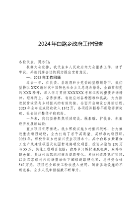 2024年白路乡政府工作报告各位代表、同志们:根据大会安排,我代表乡人民政府向大会报告工作,请予审议,并请列席会议的同志提出宝贵意见。一、2023年工作回顾过去一年,在县委、县政府和乡党委的坚强领导下,我们坚持以XXX新时代中国特色社会主义思想为指导,全面贯彻党的XXX精神,深入学习贯彻XXXXXX考察江西的重要讲话精神,迎难而上、奋勇拼搏,有效应对各种困难和挑战,大力推进脱贫攻坚与乡村振兴的有效衔接,全面开启建设白路新征程。2023年全年完成财政收入1372万,各项经济指标不断取得新突破,社会运行整体平稳向好。一年来,我们坚持聚焦项目建设,强基础、扩投资,积蓄经济发展新动能;重点项目有序推进。我乡积极实施乡村振兴战略,全力推进重点项目建设,全力打造了若干高质量、高标准的项目群。2023年,积极争取乡村振兴资金项目8个,其中白路乡紫薯加工生产线建设项目及花园村道路硬化项目,投资分别达150万与55万。其他工程项目包括:白路乡汀桥村灌溉机井、麻鸡冷链仓储、吴坊村吕家组沟塘及道路硬化、吴坊村道路宽扩项目,以及邓家组村内沟塘整治和下邹组道路硬化等,总投资合计547万元,项目已全部竣工验收投入使用。随着基础设施的不断完善,全乡人民幸福指数不断攀升。招商引资成果丰硕。持续推进乡贤回家,以情招商成效显著。2023年1月,我乡吸引江西鑫广和农业发展有限公司和抚州君和新能源有限公司落户,不断推动全乡产业改革升级;2023年9月,白路乡与中央企业国能江西新能源产业有限公司合作,共同建设了150MW光伏发电产业,该项目的一期工程已开始运行,将大幅提升全乡经济效益与社会效益;2023年底,成功引进江西道善源生物科技有限公司年产50吨花青素、姜黄素等食品添加剂项目,该项目计划2024年上半年入园投产,当年预计即可实现税收30万元以上。集体经济发展壮大。在发展村级集体经济的这个问题上,只有掌握精准施策、量体裁衣、靶向发力的原则,才能做好村级集体经济这块大蛋糕。我乡及时布局,结合本地资源优势,积极引入各类农产品深加工企业,积极探索稳定高效的投入产出机制。2023年全年,全乡村集体经济取得飞跃式发展,其中花园村全年经济收入达到31.5万,获得2023年度市级红旗党支部-经济强村称号,全乡8个村均实现村集体经济收入15万元以上。一年来,我们坚持聚焦农业发展,抓产业、美环境,绘就绿色发展新图景。农业生产稳步发展。始终胸怀国之大者,确保农业稳产增产。全乡高质量完成早稻种植面积11629亩,中稻种植面积1838亩,二季晚稻种植面积11616亩,其中机插秧1300余亩,二季晚稻300余亩;在汀桥崔家与港口村建立了3个双季稻农业样方点,并加强农技员与生产者合作联系,推进现代化农田管理;2023年全年,全乡共计发放耕地补贴171.61万元与农民一次性种粮补贴19.42万元。产业发展提质增效。2023年,我们总结经验,成立产业发展专班,完善产业发展机制,取得了可喜的成绩:一是创立了文可居文库——海量学习资料,手机电脑均可下载www.wenkeju.com久久红颜古法纯手工红糖品牌,2023年加大投资宣传力度,促成久久红颜古法红糖与抚州中心血站、博雅生物等公司的合同续签,通过与抚州牡丹亭传媒这很抚州栏目组持续开展深入合作,不断提升久久红颜古法红糖的知名度与市场占有率;二是花园村租赁流转山地200余亩种植金丝楠木,打造江西省省级苗木示范基地;三是打造乐家洲、汀桥、吴坊千亩紫薯种植连片基地,努力将紫薯种植产业打造成我乡支柱产业,带动周边百余群众家门口就业,人均年收入增加近万元;四是白路村与上付村的恒康益生油茶项目,当年实现收益16.8万元。五是汀桥、吴坊百亩果蔬基地哈密瓜、西瓜、香瓜硕果累累,崇仁首批哈密瓜在此产出、销往全国。严守耕地保护红线。出台制定了《白路乡耕地保护工作实施细则》和农村建房审批管理制度等一系列长牙齿的耕地保护具体措施,压实乡村干部及综合行政执法工作人员耕地保护(含农民建房)巡管职责,确保耕地保护工作落到实处。2023年共处理违法违规问题14起,其中,依法实施强制拆除违建6处,清理乱占耕地种植油茶、果树3处,整改违法占用耕地图斑5处。生态环境持续改善。我乡深入贯彻XXXXXX关于生态文明思想重要论述,真抓实干,紧紧围绕年度重点工作任务,深入打好生态优先,污染防治攻坚战。乡综合行政执法队履职尽责,对非法捕鱼、秸秆焚烧开展高频次巡查,始终保持高压严打态势,源头制止并查处秸秆焚烧案件40余起、收缴非法钓竿60余根、渔网12张,锂电池电鱼装置3台,生态环境明显改善;大力开展防溺水巡查活动,重点水域均设有网格员,参与防溺水每日三巡查共计4000余人次,保障了白路乡近年来溺亡事件0发生;成立畜禽养殖污染整