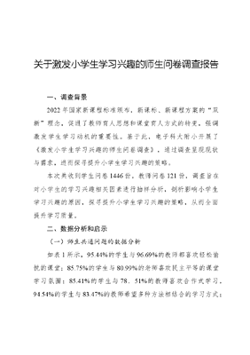 关于激发小学生学习兴趣的师生问卷调查报告一、调查背景2022年国家新课程标准颁布,新课标、新课程方案的双新理念,促进了教师育人思想和课堂育人方式的转变,强调激发学生学习动机的重要性。基于此,电子科大附小开展了《激发小学生学习兴趣的师生问卷调查》,通过调查呈现现状与需求,进而探寻提升小学生学习兴趣的策略。本次共收到学生问卷1446份,教师问卷121份,调查旨在对小学生的学习兴趣相关因素进行抽样分析,剖析影响小学生学习兴趣的原因,探寻提升小学生学习兴趣的策略,从而全面提升学习质量。二、数据分析和启示(一)师生共通问题的数据分析如表1所示,95.44%的学生与96.69%的教师都喜欢轻松愉悦的课堂;85.75%的学生与80.99%的老师喜欢民主平等的课堂学习氛围;85.41%的学生与78.51%的教师喜欢合作式学习,94.54%的学生与83.47%的教师希望多种方法相结合的学习方式;在提出问题或回答问题后82.85%的学生和81.82%的教师都认为教师会积极纠错并鼓励;当学生的作品或作业完成的质量不高时,88.52%的学生和95.87%的教师都能认为获得或给予指导帮助及鼓励;67.77%的学生与77.69%的教师喜欢多种评价方式相结合;当遇到困难时,69.99%的学生和86.78%的老师认为父母会和他们一起想办法解决。数据显示,在学习需求、行为表现和学习评价等方面师生具有趋同愿景。学生的学习动机主要来源于三大心理诉求:安全感、自主感和胜任感。因此,在教育教学中教师要调整好学生的学习心态,鼓励学生大胆思考和实践,帮助学生养成良好的学习习惯,提升学习能力。对于问题3,有15.21%的学生和15.70%的教师认为纠错后学生没有得到及时鼓励,这不利于激发学生进一步提问或回答问题的积极性,老师要及时转变教学方式,呵护学生的兴趣。对于问题5,师生均认为多元的评价方式将有利于个体更好地发展,且能针对不同学生作出不同判断,针对性强且有效的评价方式也是学生产生兴趣动力的源泉。对于问题6,学生遇到困难时愿意寻求父母的帮助,这是对父母的信任,也是学生解决问题的一种有效途径,因此,家长合理适时的引导是学生对学习产生兴趣的重要基础。(二)学生单独问题的数据分析文可居文库——海量学习资料,手机电脑均可下载www.wenkeju.com如表2所示,多数学生对学习是有兴趣的,具有向师性,尤其喜欢温柔耐心、风趣幽默的教师,亲和力强的老师更容易拉近学生与老师之间的距离,能营造愉悦的氛围,促进学习进步,可谓是亲其师,信其道。对于问题7,17.08%的学生选择说不清楚,3.18%的学生选择不喜欢,可见老师对激发学生的学习兴趣具有较大的可作为空间。对于问题10,80.08%的学生选择对学习内容不懂的时候,这为老师应如何激发学生学习兴趣指明了方向:应特别关注学生对学习内容的理解和明晰,因为如果不懂又没释疑,就会造成学习障碍,因为障碍太多就会产生畏难情绪,兴趣就无从谈起了。对于问题11,67.50%的学生选择举手问老师,可见老师对激发学生的学习兴趣具有极大的影响。对于问题12,16.67%的学生选择偶尔会,7.05%的学生选择从不,在家庭教育中,父母对学生学习习惯和学习兴趣的影响也是深刻的、深远的,家长的言行举止及有效陪伴能影响学生的习惯和思维,这也需要老师及时和家长沟通,家校携手,共同促进学生的健康成长。(三)教师单独问题的数据分析如表3所示,87.60%的教师认同激发学习兴趣的重要性和文可居文库——海量学习资料,手机电脑均可下载www.wenkeju.com必要性;50.41%的教师在面对学生上课参与度不高的情况时能及时评价激励,调动其积极性;当学生遇到困难或情绪低落时,95.78%的教师会单独沟通、与生共情,89.26%的教师会积极关注、帮助解决,85.95%的教师会采取家校联系、合力育人的方式。对于问题8,仅有45.45%的教师经常思考如何激发学生的学习兴趣。可见有教师的理念和行为之间还有脱节的现象,也有教师有关于如何激发学生学习兴趣的教学机智,但还没有系统的深度思考。如何把理念转化为实实在在的教学行为,如何激发学生学习兴趣,这是教师需要深度系统思考和践行的。若教师缺位,将会使学生无味。兴趣是引起和维持人的注意力的一个重要因素,对事物感兴趣就会促使人们积极愉快地去探究和完成。尤其是小学阶段,兴趣的形成来源于教师的诱导和引发。如何唤起学生的主观能动性,是教师提升教学素养的重要目标。三、培养学生学习兴趣的策略兴趣是最好的老师。我们要通过激发学生兴趣、培养良好习惯、锻炼学习毅力,并结合方法指导,落实立德树人根本任务。(一)用情感人,建构生命共生的关系文可居文库——海量学习资料,手机电脑均可下载www.