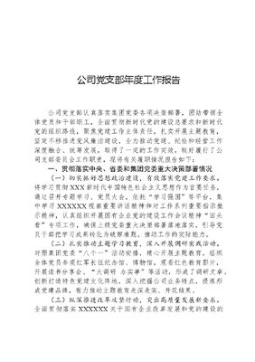 公司党支部年度工作报告公司党支部认真落实集团党委各项决策部署,团结带领全体党员和干部职工,全面贯彻新时代党的建设总要求和新时代党的组织路线,聚焦党建工作主体责任,扎实开展主题教育,坚定不移推进党风廉洁建设,全力推动党建、纪检和经营工作深度融合、统筹发展,取得了一定的工作实效,较好履行了公司支部委员会工作职责,现将有关履职情况报告如下:一、贯彻落实中央、省委和集团党委重大决策部署情况(一)切实抓好思想政治建设,有效落实党建工作要求。将学习贯彻XXX新时代中国特色社会主义思想作为首要任务,通过召开专题学习、党员大会,依托学习强国等平台,集中学习XXXXXX视察重要讲话精神和对工作系列重要指示批示精神,认真组织开展国有企业党的建设工作会议精神回头看专项工作,确保上级党委重大决策部署落地落实,引导党员干部把学习成果转化为破解难题、推动工作的实际能力。(二)扎实推动主题学习教育,深入开展调研实践活动。对照集团党委八个一活动安排,精心开展主题教育,组织全体党员参观红军长征纪念馆、博物馆,观看红色教育影片,开展读书分享会、大调研 办实事等活动,形成了调研文章。创新打造特色党建文化阵地,深入挖掘公司业务特点,提炼形成党建品牌,有力推动主题教育走深走实、开花结果。(三)纵深推进改革攻坚行动,突出高质量发展新要求。全面贯彻落实XXXXXX关于国有企业改革发展和党的建设的重要论述精神,扎实部署国企改革三年行动,高效完成改革《实施方案》及《工作台账》编制,围绕企业治理、业务布局、内控体系、机制创新等方面内容,拟定改革目标、具体事项,通过定期会议研究,切实加强日常督办,公司于月底率先完成各项改革任务。二、推动基层党建工作取得的实效(一)着力发挥党建引领作用,全面推动党建工作和经营管理相融互促。践行强党建就是强发展理念,坚持突出党对各项工作的全面领导。通过建立双向进入、交叉任职领导体制,研究制定支委会议事清单,出台第一议题学习制度,完成党建入章程等系列举措,有效发挥党组织在把方向、管大局、促落实方面的作用。一年来,公司自营销售率,完成设计,率先落地应用;积极承接设计项目,连续荣获重要资质;加快推进资源整合,主动对接公司,大力开展业务,与公司等达成合作意向。成功试点业务精细化管理,业务效益持续提高。(二)切实强化基础党建,不断加强队伍建设。严格落实三会一课制度,提高党内组织生活质量,组织集中学习,开展专题党课。实行党员积分管理,做好党员发展工作,发展正式党员、预备党员。完成支委增补、换届选举,选优配齐支委班子。完善市场化用工管理机制,推动经理层契约化和任期制管理落地,提拔任用业绩突出的领导班子成员、中层管理人员,为公司管理层注入新鲜血液。发挥先进模范作用,设置党员示范岗,评选优秀团员,创新建立号、岗、队优秀评选表彰机制;积极开展公益扶贫活动,有力彰显国有企业社会责任感。三、推动党风廉政建设工作情况(一)扎实推进反腐倡廉教育,切实履行监督职能职责。落实领导班子主体责任,层层组织签订《党风廉政建设责任书》《党风廉政建设主体责任清单》,印发《2023年纪检工作要点》,及时传达落实上级有关党风廉政建设和反腐败工作的文可居文库——海量学习资料,手机电脑均可下载www.wenkeju.com部署要求,强化党员领导干部一岗双责意识。开展党组织书记讲廉洁党课,对关键岗位重点人员定期提醒谈话,集中观看警示教育片,深入学习优秀事迹和反面典型,引导全体党员强化法纪意识,牢固树立底线思维。(二)持续巩固廉洁作风建设,深入开展问题自查自纠。严格落实中央八项规定精神,加强重要节假日和四风问题突出时期的廉洁提示,严防吃喝歪风、收送礼金、私车公养等问题产生。扎实开展形式主义、官僚主义、三公经费、吃公函、职工福利等专项整治。班子成员主动向党组织定期汇报个人情况,从未利用职务便利,为自己和家人谋取不正当利益。(三)着力强化业务监督,不断完善惩防体系建设。紧盯重点项目、选人用人、采购、销售等方面,梳理出廉洁风险点,并逐项评定风险等级,对应制定防控措施。完成《内控管理手册》编制,拟定关键业务流程图,出台或修订招标、费用支付、账款管理、业务营销等管理办法,切实扎牢制度笼子,形成较为完备的风险预防机制。四、存在问题及产生的原因一年来,支部委员会在抓党建工作方面取得了一定成效,但也存在一些不足:一是学习实效和深度还不够。虽然党支部开展活动的形式较以往更加丰富多样,除组织政策学习、参观教育基地、观看教育影片外,还引入手机APP的方式开展线上学习,但学习内容的吸引力、针对性还不够强。党员干部在日常交流心得体会的时间不多,缺乏深层次的沟通、探讨与总结,未能完全把学习内容转化为提高能力、改进工作方法的成果。二是队伍建设质量还不够高。党员教