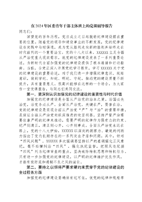 在2024年区委青年干部主体班上的党课辅导报告同志们:回望党的百年历程,党自成立之日起就将纪律建设摆在重要的位置。随着党的领导和建设事业的不断发展,党的纪律建设在实践中与时俱进,成为党从胜利走向新的胜利并始终走在时代前列的一个重要法宝。党的十八大以来,XXXXXX立足全面从严治党重大现实需求,就党的纪律建设发表了一系列重要论述,为新时代全面加强党的纪律建设提供了根本遵循和行动指南。当前,全党正深入开展党纪学习教育,学习XXXXXX关于党的纪律建设的重要论述,对于我们进一步增强纪律意识、规矩意识,做到学纪、知纪、明纪、守纪,推动党的建设质量不断提升,具有重要意义。很高兴能够在这样的一个场合,为大家作一堂党课报告,与同志们共同交流。第一,要深刻认识加强党的纪律建设的重要性与时代价值加强党的纪律建设是全面从严治党的治本之策。治国必先治党,治党务必从严。全面从严治党,关键在严,要害在治。党的纪律建设是实现全面从严治党严与治的重要举措,是保证全面从严治党向纵深推进的攻坚利器。坚持严管严治需要依靠严明的纪律来推动,需要严明的纪律作为强有力的约束。纪严则清正,清正则心齐,心齐则事成。全面从严治党永远在路上,党的十八大伊始,XXXXXX以深刻的洞察力、敏锐的判断力指出了党内长期存在的一系列突出矛盾和问题。其中,针对四风问题,XXXXXX多次强调要坚持以严的基调强化正风肃纪,毫不松懈纠治