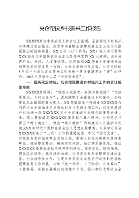 央企帮扶乡村振兴工作报告XXXXXX在中央农村工作会议上强调,全面推进乡村振兴、加快建设农业强国,是党中央着眼全面建成社会主义现代化强国作出的战略部署。XX公司(以下简称:XX)深入学习贯彻XXX新时代中国特色社会主义思想和党的XX大精神,充分发挥产业、科技、人才等优势,扎实推动XX等6个受援地巩固拓展脱贫攻坚成果上台阶、乡村全面振兴见实效。公司已连续5年在中央单位定点帮扶工作考核中获得最高等次好的评价,2023年获第十二届中华慈善奖。一、提高政治站位,切实增强推进乡村振兴工作的责任感使命感XXXXXX强调,强国必先强农,农强方能国强民族要复兴,乡村必振兴,深刻阐明了全面推进乡村振兴、加快建设农业强国的重大意义。XX党组坚定不移沿着XXXXXX指引的方向全面推进定点帮扶和对口支援各项工作,切实把思想和行动统一到XXXXXX关于全面推进乡村振兴的重要论述上来。深入贯彻落实XXXXXX重要指示批示精神。公司党组从捍卫两个确立,做到两个维护的高度深入开展学习贯彻XXX新时代中国特色社会主义思想主题教育,认真学习领会XXXXXX关于三农工作的重要论述,牢记国之大者,自觉服务党和国家事业发展大局,聚焦乡村振兴积极开展调查研究、推进整改整治、解决实际问题、助力高质量发展,推动XXXXXX重要指示批示精神学到深处、落到实处、抓到细处。强化组织领导,确保稳中求进。公司党组每年专题研究援扶工作,出台指导性文件,主要负责同志及其他班子成员赴受援地现场督导工作进展,打造统一领导、上下联动、立体帮扶工作格局。保持主要帮扶政策稳中有进,投入和引进帮扶资金等主要指标逐年增长,向X个国家乡村振兴重点帮扶县选派X名科技特派员,着力建设一支政治过硬、本领过硬、作风过硬的乡村振兴干部队伍。提振精神动力,营造浓厚氛围。公司着力塑造新时代XX精气神,认真开展乡村振兴领域不正之风和腐败问题专项整治,加强对帮扶资金和项目的检查监督,严守纪律规矩,强化底线意识。总结宣传创新做法和先进典型,数十次获国家主流媒体报道,多次入选联合国全球减贫案例征集活动、《中央企业助力乡村振兴蓝皮书》,持续营造扶弱济困的浓厚氛围,扩大社会影响力。二、突出产业帮扶,着力促进农业增产增效、农民增收致富XXXXXX强调,产业振兴是乡村振兴的重中之重。XX坚持把抓产业促增收作为干好乡村振兴工作的出发点和落脚点,在长期实践中逐步形成了以现代农业产业为引领、多产业齐头并进的产业帮扶格局。创新打造MAP模式。XX现代农业技术服务平台(MAP)聚焦做好土特产文章。公司在受援地全面布局、建设MAP现代农业技术服务中心、示范农场和农牧业现代产业园,以良种+良法带领农民获得好收成,以品控溯源+溢价订单帮助农民卖出好价钱,以发展数字农业为农业产业集成大数据,形成了规模经营+多方合作的阿旗模式、良品优技+示范带动的林西模式、盘活资本+一二产融合的古浪模式、精品种植+一村一品的平山模式。探索种养循环模式。在林西县,公司依托自有技术设备,创建从养殖粪污收集利用,到有机废弃物深加工还田提升土壤地力,再到以健康土壤服务农业种植的全链条模式,建设1年2季大白菜种植基地,并配套现代育苗工厂、水肥一体化和智慧农业系统全流程服务,同步建设大型碳中和污水处理站和配套管网。此外,公司在XX市开展盐碱地综合治理与利用系统示范工程,并形成盐碱地水田综合治理技术体系,得到《人民日报》《新闻联播》关注和报道。深耕农业普惠金融。公司结合业务场景开发农资贷、农产贷、农机贷、种植贷等多个业务品种,为农户提供耕种管收全流程金融支持,覆盖X个种植大省。同时,公司充分发挥信托模式跨市场、多金融工具集成的优势,基于农户和市场需求,灵活设计符合三农特点的乡村振兴综合服务方案,同步打造线上系统平台,简化贷款办理流程,切实解决农民贷款难烦贵的问题。。三、稳固脱贫根基,不断激发脱贫地区和脱贫群众内生发展动力XXXXXX强调,巩固拓展脱贫攻坚成果是全面推进乡村振兴的底线任务,要继续压紧压实责任,坚决防止出现整村整乡返贫现象。XX严格落实四个不摘要求,加大对国家乡村振兴重点帮扶县和易地扶贫搬迁集中安置区的倾斜支持力度,帮助受援地坚守住不发生规模性返贫的底线。持续巩固提升三保障和饮水、生活保障水平。公司重点帮助解决受援地义务教育、基本医疗、住房安全以及饮水安全、生活保障等领域突出问题,捐赠X辆医疗救护车、X台医疗设备、X万册图书。连续11年组织员工开展圆梦助学行动,创新引入慈善信托模式提升项目运营质效,2023年员工自愿捐助X余万元,帮扶学生X余人,并在受援地开展奖教金奖学金自强班等项目。全方位赋能稳就业促发展。公司采取走出去+请进来线上+线下政策解读+