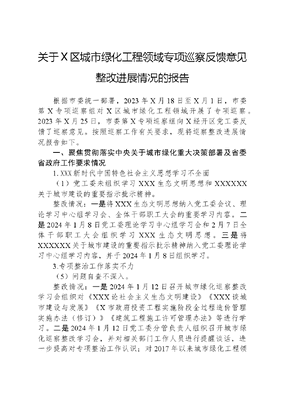 关于X区城市绿化工程领域专项巡察反馈意见整改进展情况的报告根据市委统一部署,2023年X月18日至X月1日,市委第X专项巡察组对X区城市绿化工程领域开展了专项巡察。2023年X月25日,市委第X专项巡察组向X经开区党工委反馈了巡察意见。按照巡察工作有关要求,现将巡察整改进展情况报告如下。一、聚焦贯彻落实中央关于城市绿化重大决策部署及省委省政府工作要求情况1.XXX新时代中国特色社会主义思想学习不全面(1)党工委未组织学习XXX生态文明思想和XXXXXX关于城市建设的重要指示批示精神。整改情况:一是将XXX生态文明思想纳入党工委会议、理论学习中心组学习会、全体干部职工大会的重要学习内容。二是2024年1月8日党工委理论学习中心组学习会和2月7日全体干部职工大会组织学习XXX生态文明思想。三是将XXXXXX关于城市建设的重要指示批示精神纳入党工委理论学习中心组学习内容,并于2024年1月8日组织学习。3.专项整治工作落实不力(5)问题自查不深入。整改情况:一是2024年1月12日召开城市绿化巡察整改学习会组织对《XXX论社会主义生态文明建设》《XXX谈城市建设与发展》《X市政府投资工程实施阶段全过程造价管理实施办法(修订)》《建筑工程施工许可管理办法》等进行学习。二是2024年1月12日党工委分管负责人组织召开城市绿化巡察整改学习会,并对相关部门工作人员进行提醒谈话,进一步提高对专项整治工作认识;对2017年以来城市绿化工程领域合同、决策程序资料进行全面自查,在项目实施过程中严格按规定程序执行。三是出台合同管理、建设工程现场签证管理、工程决算审计等制度。2023年10月以来标准地地块土方、路面零星维修工程等项目一律按该制度规定执行。二、聚焦城市绿化工程重点环节廉洁风险和作风情况4.管党治党责任落实不够严实(7)党员干部教育监督管理不够严格。整改情况:一是党工委理论学习中心组学习会学习XXXXXX关于全面从严治党的重要论述;党工委巡视巡察整改工作推进会组织学习《党委(党组)落实全面从严治党主体责任规定》,党工委会议集中学习《党组(党委)领导班子成员履行一岗双责落实全面从严治党责任清单》,深化对抓好一岗双责的思想认识。二是对近年来发生的各类违纪案件进行梳理、汇总,形成警示案例,并在党工委会议上进行集中学习。巡察整改以来,组织开展革命传统教育1次、廉政警示教育4次,面向经开区广大党员编发廉政短信771条。三是邀请区纪委监委干部在2023年度党员教育轮训班上授课并开展赌博、酒驾等警示教育,受众人数120余人;第一党建联盟组织联盟内企业开展警示教育学习。巡察整改以来,5个企业党支部利用三会一课累计开展党风廉政知识学习5次,2个党支部通过区级清廉非公企业验收。四是出台《党风廉政建设一岗双责制度》,印发《中共XXX经济开发区工作委员会2023年度落实全面从严治党主体责任清单》,明确任务分工。2024年1月4日党工委会议听取领导班子成员履行管党治党责任情况报告。党工委主要负责人与领导班子成员开展提醒谈话,领导班子成员对分管领域开展一岗双责谈话。7.标后监管不力(12)签订合同不合规。整改情况:一是2024年1月12日召开城市绿化巡察整改学习会组织对《X市政府投资工程实施阶段全过程造价管理实文可居文库——海量学习资料,手机电脑均可下载www.wenkeju.com施办法(修订)》《建筑工程施工许可管理办法》进行学习。二是出台合同管理、建设工程现场签证管理、工程决算审计等制度。2023年10月以来标准地地块土方、路面零星维修工程等项目一律按该制度规定执行。三是对2017年以来城市绿化工程领域合同资料进行自查。巡察整改以来,新签的合同均有签订时间。四是2024年1月12日党工委分管负责人对相关部门全体工作人员进行提醒谈话,2月29日党工委主要负责人对分管负责人进行提醒谈话。10.财务管理有弱项(20)财务支出不合规。整改情况:一是加强财务知识的学习,2023年12月1日组织财务人员全面学习《XX经开区管委会财务管理制度(修订)》。二是建立健全财务管理制度,2023年12月对原《XX经开区管委会财务管理制度》进行修改完善,主要是对有关财务报账资料审核把关和票据管理方面重新进行规定。三是对2017年以来城市绿化工程财务台账进行认真梳理,做到举一反三。经过仔细梳理查看,未发现发票多项目混开等现象,票据合规、审批程序合规。四是重新修订财务管理制度,重点在财务审核环节和票据管理方面进行修改完善。五是2024年1月12日党工委分管负责人对相关部门工作人员进行提醒谈话,2月29日党工委主要负责人对分管负责人进行提醒谈话。三、聚焦城市绿化工程领域基层组织建设情况13.三重一大集体决策制度执行不严格(25)有关工程未经党工委会议研