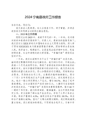 2024宁南县政府工作报告各位代表,同志们:我代表县人民政府,向大会报告工作,请予审查,并请县政协委员和列席会议的同志提出意见。一、2023年工作回顾刚刚过去的2023年,是极不平凡的一年。一年来,在州委州政府和县委的坚强领导下,在县人大、县政协的监督支持下,我们坚定以XXX新时代中国特色社会主义思想为指导,深入学习贯彻XXXXXX来川视察重要指示精神,团结带领全县各族人民,艰苦奋斗、砥砺前行,全县呈现出经济稳中向好、民生持续改善、社会和谐稳定的大好局面,幸福宁南建设迈出坚实步伐。一年来,我们以超常作为干出了幸福宁南攻坚力度。面对艰巨繁重的移民诉讼化解任务,我们闻令而动、尽锐出战,提前一个月完成清零任务,得到了省委省政府和州委州政府的高度肯定。面对多重超预期因素对经济的冲击,我们坚决扛起稳增长的重大政治责任,用心加强经济运行调度,用情做好企业服务,用劲推动各项工作,主要经济指标持续增长,预计(下同)全年实现地区生产总值100.3亿元、首次突破百亿大关,地方一般公共预算收入7亿元、增长16.1%、跑出了近年最高增速,全社会固定资产投资110亿元,入围四川省县域经济发展先进县,幸福宁南发展迎来重要里程碑。面对60年一遇的干旱灾害,我们科学调度、精准施策,全力开展抗旱救灾工作,有力保障了群众生产生活用水,夺取了大旱之年农业丰收,粮食产量增长4.1%,畜牧业综合产值增长18.1%,林业综合产值增长8.5%。面对广大群众的殷切期盼,我们靶向施策、重点突破,沿江高速加快建设,宁西高速全线开工,宁南中学北校区建成投用,高考本科上线人数首次突破千人大关、达到1088人,上线率达88.8%、连续10年领跑全州、连续9年超全省平均水平,成功创建四川省健康促进县和四川省慢性病综合防控示范区。面对严峻的防汛形势,我们闻汛而动、向水而行,累计转移安置群众5600余人次,连续三年实现防汛减灾零伤亡,并在全省地质灾害防治工作现场会上作交流发言。面对日益严峻的风险挑战,我们始终贯彻总体国家安全观,坚持底线思维,发扬斗争精神,把安全发展贯穿各领域全过程,实现生产安全事故零伤亡,森林草原零火情,食品药品安全零事故,圆满完成四川省2023年大震巨灾综合实战分会场演练,破获的特大跨省团伙贩婴案获得公安部肯定性批示,平安建设群众满意度持续走在全州前列。各位代表,一年的攻坚克难,我们深切感受到,千难万难,只要众志成城、团结一心就不难,只要迎着困难上、顶着风浪行,就一定能战胜前进道路上的风险挑战。一年来,我们以超常拼搏跑出了幸福宁南产业速度。农业产业稳步发展。全面推行田长制,新建高标准农田1万亩,牢牢守住了耕地保护红线。产茧增加3000担,蚕农综合收入增加5468万元;收购烟叶13.5万担,烟农收入2.2亿元、同比增加5000万元;种植蔬菜11.6万亩、水果2万亩,推广桑枝食用菌30万棒,四畜出栏50万头。培育州级现代农业园区6个,建成县级园区3个。幸福核桃产业项目被列为四川省首批天府森林粮库示范建设项目,并在全省现场会议上作交流发言。南丝路集团公司被农业农村部认定为农业国际贸易高质量发展基地和2023年度农业农村信息化示范基地,是四川省唯一获得认定的企业。工业经济企稳前行。一企一策助企纾困,重组了白鹤滩水泥厂,推动东升碳化硅、三鑫矿业等5户企业复工复产,完成工业投资19亿元,新增清洁能源装机11.3万千瓦,新增规上工业企业3户。茧丝绸工业园区成功入选四川省高端人才产业园和四川省农业科技示范园。培育资质以内文可居文库——海量学习资料,手机电脑均可下载www.wenkeju.com建筑企业2户,实现建筑业总产值3.5亿元。服务业强势复苏。发放促消费活动券548万元,拉动消费3000余万元,培育规(限)上商贸单位12户,电商交易额达1.2亿元。文旅产业加快发展。出台《宁南县支持文化事业文化产业繁荣发展扶持和奖励办法》,宁远镇成功创建天府旅游名镇,凯地里拉景区入选四川最受网民喜爱的网红打卡地百强榜单,累计接待游客98.6万人次、增长60.6%,实现旅游综合收入5.4亿元、增长50.5%。各位代表,一年的苦干实干,我们深切感受到,产业兴则经济兴、产业强则经济强,只要鼓足干劲、真抓实干,就一定能在宁南大地上谱写产业发展新篇章。一年来,我们以超常努力拓展了幸福宁南发展维度。美丽城乡加速蝶变。编制完成全县国土空间总体规划和5个镇级片区规划,其他专项规划有序推进,县域空间布局更加优化。宁府大道、宁远巷、城市广场大气亮相,新增建筑面积12万平方米,西城新区拔地而起,城市更靓、人气更旺。顺应群众期盼,实施江西街、老街、平街和8个老旧小区改造,启动老城区雨污分流和第二污水处理厂工程,完成公租房和北校区安置区建设项目,下足绣花功夫