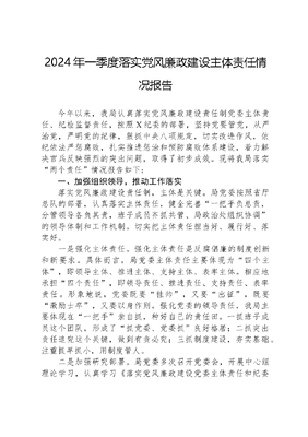 2024年一季度落实党风廉政建设主体责任情况报告今年以来,我局认真落实党风廉政建设责任制党委主体责任、纪检监督责任,按照X纪委的部署,坚持党要管党,从严治党,严明党的纪律,狠抓中央八项规定,切实改进作风,依纪依法严惩腐败,扎实推进惩治和预防腐败体系建设,着力解决官兵反映强烈的突出问题,取得了初步成效。现将我局落实两个责任情况报告如下:一、加强组织领导,推动工作落实落实党风廉政建设责任制,主体是关键。局党委按照省厅总队的部署,认真落实主体责任,健全完善一把手负总责,分管领导各负其责,班子成员齐抓共管、局政治处组织协调的领导体制和工作机制。切实把主体责任担当好、履行好、落实好。一是强化主体责任。强化主体责任是反腐倡廉的制度创新和新要求。具体而言,局党委主体责任主要体现为四个主体,即领导主体、推进主体、支持主体、表率主体。相应地承担四个责任,即领导责任、推进责任、支持责任、表率责任。形象地说,党委既要挂帅,又要出征,既要激励士卒,又要以身作则。强化党委的领导责任,我局主要体现在一把手亲自抓,种好自己的责任田。一抓班子成员这个团队,形成了抓党委、党委抓良好格居;二抓突出责任追究这个关键,做到有责必究;三抓制度建设,夯实基础。注重抓早抓小,用制度管人。二是加强研究部署。局党委多次召开党委会,开展中心组理论学习,认真学习《落实党风廉政建设党委主体责任和纪委监督责任指导意见》和《落实党风廉政建设党委主体责任和纪委监督责任实施办法》,结合本单位实际研究制定了《2024年党风廉政建设重点工作任务责任分解的通知》,局党委X代表党委与基层主官签订了《2024年党风廉政建设责任书》,对重点任务和工作责任分解细化、责任到人,形成横向到边、纵向到底、覆盖完整、责任落实的责任体系。三是强化各级党组织意识。局党委始终坚持把党风廉政建设纳入全年工作考核重点项目,与业务工作一起部署,统一实施。局党委常委按照责任区分工,定期听取各单位党风廉政建设和反腐败工作情况汇报,定期对基层单位党风廉政建设和反腐败工作进行调研,定期带队对各单位党风廉政建设责任制落实情况督导检查。四是选好用好干部。组织开展对责任制落实情况的监督检查和考评,并将检查、考核的结果作为干部考核使用、评先选优的重要依据,切实维护党风廉政建设责任制的严肃性,确保党风廉政建设和作风建设各项任务有效落实。二、严肃党的纪律,确保政令畅通局党委坚持把严肃党的纪律作为党风廉政建设的第一项任务,自觉担负起执行和维护党的纪律的责任。结合当前的专题教育和突出问题教育、预防与专项整治工作,组织开展党风廉政建设宣传教育月活动,努力提升党员干部拒腐防变能力和严格执行党的各项纪律意识。一是开展党员干部严明党的纪律集中教育活动。以专题教育活动为契机,通过书记上党课和集中学习,邀请市党校老师和市纪委领导作专题报告,在班子成员中开展群众满意政绩观大讨论和两个责任落实专题研讨,在全体党员干部中开展假如我是服务对象微信群大讨论。同时组织机关党员深入学习党章,开展严守党的政治纪律、组织纪律集中教育活动。引导党员干部以身作则、率先垂范,主动维护党的纪律,坚持原则、敢抓敢管,切实增强纪律执行力,坚决维护纪律的文可居文库——海量学习资料,手机电脑均可下载www.wenkeju.com严肃性和权威性。二是开展好干部标准大讨论,赴武乡红色教育基地和平顺廉政教育基地开展实地教育,充分利用身边的典型引导全体机关干部弘扬公仆情怀、求实作风、奋斗精神和道德情操。三是深入开展宣传教育活动。全体党员干部深入查摆自己在思想境界,素质能力、作风形象等方面存在的问题与不足,边查边改、立行立改。结合全局党员干部思想、工作、作风的实际,组织全体机关干部学习党章,中央、公安部有关勤政廉政等方面的知识,增强他们的政治纪律、组织纪律观点,提升廉洁自律意识,强化务实、高效的作风。三、强化作风建设,促进环境优化一是完善制度,着力健全长效机制。在作风建设工作中,先后修订完善了机关廉政、考勤、理论学习、值班、保密等制度,同时,将机关各项制度与问责追究相结合,用制度切实保障作风建设效果,努力达到治庸提能、治懒提效、治散提神、治软提劲的目标。二是狠刹大操大办,借机剑财之风。多次组织全体机关干部学习《关于严禁党员干部大操大办婚丧喜庆事宜借机剑财的若干规定的通知》,领导班子成员对照若干准则签订严禁大操大办婚丧喜庆事宜借机剑财承诺书,到目前为止,没有发现违规违纪现象。三是加强督办,始终保持高压态势。大力支持纪检监察工作,定期开展检查督查,抓好各部门、单位及个人的本职工作完成情况的检查督查,重点督查全市消防部队中心工作。对工作措施不力、影响全局工作开展的,要求迅速整改并跟踪督办,促进工作落实。我局党风廉政建设虽然取得了一定的成