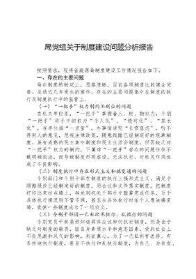 局党组关于制度建设问题分析报告按照要求,现将省能源局制度建设工作情况报告如下。一、存在的主要问题局在制度的制定上,思路清晰,目前各项制度比较健全完善。总结近几年发生的案件,存在的主要问题集中在制度的执行及制度执行中的监管上。(一)一把手权力制约不到位的问题在机关单位里,一把手掌握着人、财、物权力,个别一把手将手中的权力个人化、绝对化、家长化,在单位搞一言堂,办事情讲究长官意志,听不得别人的意见,忽视法律政策,随意践踏已经制定好的规章制度。虽有成熟的民主集中制度和民主生活会制度,但因缺乏对一把手权力的制约,下属对一把手存在的问题往往不敢明确指出,而导致制度形同虚设,无法执行,对机关作风造成了不良影响。(二)制度执行中存在形式主义和搞变通的问题个别部门和个别干部在制度的执行上搞形式主义,满足于照搬照抄已经制定好的制度,用会议和文件落实制度,把制度打印出来挂在墙上,转发到机关干部手中就算完成任务,至于具体执行情况则不管不顾,甚至在具体执行时依个人想法搞变通,致使一些制度成为了一纸空文。(三)个别干部因一己私欲不执行、乱执行的问题个别党员干部虽然知道具体应该如何执行制度,但是由于缺乏对制度的敬畏,因自身素质水平和意志因素,受到社会上不良思潮和风气的影响,利欲熏心,为了一己私利有选择、有条件地执行制度,甚至不执行和乱执行制度,为自己、为亲友、为他人谋取不当利益。(四)制度执行中监管不到位的问题近几年出现的私车公养、外出滞留等违纪问题,反映出没有对制度的落实进行及时监督,没有在第一时间发现和处理,导致小问题变成大问题。(五)业务制度建立不及时的问题能源局现行的管理制度已经对全局的共性工作做了比较明确的规定,但在能源指标、补贴资金、引导资金等分配中,没有形成先建制后落实的工作模式。二、原因分析(一)一把手权力制约不到位的问题原因分析一是受传统封建专制政治文化影响,大多数人心理上已经习惯依附于权威,家长制和首长制对机关干部的影响一时难以消除。二是个别领导干部政治思想建设不到位,综合素质偏低,法律意识淡薄,缺乏对制度的敬畏,官僚主义作风严重,唯我独尊,工作想咋干就咋干。三是对一把手权力的约束监督存在短板,需要强化外部的制约与监督。(二)制度执行中存在形式主义和搞变通的问题原因分析一是机关干部思想认识不到位,没有认识到制度的严肃性与重要性,认为制度是可有可无的,有应付思想,认真遵守制度会增加负担,不遵守制度或者搞形式、搞变通反而是走捷径。二是对制度执行情况督导检查不到位,制度执行的违规成本低,缺少必要的责任追究,制度执行责任制没有细化落实到具体部门、具体个人。三是制度制定后解读解释不到位,导致个别干部对制度的理解不充分、不深入,在具体执行时不知道如何去执行,完全根据个人想法、个人意愿执行。(三)个别干部因一己私欲不执行、乱执行的问题原因分析文可居文库——海量学习资料,手机电脑均可下载www.wenkeju.com一是个别党员干部思想不端正,宗旨意识、公仆意识不强官本位思想浓厚,忽略了个人作风建设和党风廉政建设,没能抵制住个人主义、拜金主义和享乐主义的侵蚀。二是制度执行的宣传教育力度不够,没有使机关工作人员牢固树立制度意识,熟知制度内容、领会制度精神,在内心对制度有所敬畏,因缺乏制度意识而肆无忌惮、无所顾忌。(四)制度执行中监管不到位的问题原因分析一是在制度执行过程中,有的党员干部有怕得罪人的心理觉得都是一个单位的同事,如果指出了别的部门、别的同事的问题,以后会不好相处。二是在制度执行的过程中,不能做到平等对待和一视同仁对和自己关系好的区别对待,对领导存在的问题又顾虑太多而不敢指出,制度没有公平、公正执行,部分工作人员产生抵触心理,执行的难度加大。三是没有建立制度执行的奖惩机制和考核机制。(五)业务制度建立不及时的问题原因分析业务处室的行业制度不完善的原因主要是由于,制定行业制度专业性强,需要根据新形势、新趋势、新特征而不断修订,且行业制度纷繁复杂,制度之间难免冲突,制定行业管理制度难度大。三、对策与解决办法(一)发挥领导带头执行制度的表率作用能源局各级领导,特别是一把手要充分发挥表率作用带头执行制度。牢固树立制度意识,把执行制度看做是自己的本职,不执行制度就是失职,以身作则、率先垂范,模范遵守制度,自觉接受制度制约,让全局机关干部看到在制度面前人人平等,没有人可以凌驾于制度之上,体现制度的公正与公平。发挥好头雁作用,带领全局广大机关干部落实执行制度,在全局营造浓厚的敬畏、遵守制度的氛围,推动各项制度落地生根。在自律律人的基础上,自觉接受党和人民群众的批评、监督。文可居文库——海量学习资料,手机电脑均可下载www.wenkeju.com(二)做好制度执行的宣传教