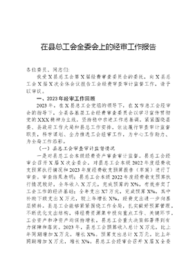 在县总工会全委会上的经审工作报告各位委员、同志们:我受X县总工会第X届经费审查委员会的委托,向X县总工会X届X次全体会议报告工会经费审查审计监督工作,请予以审议。一、2023年经审工作回顾2023年,在X县总工会党组的领导下,在X市总工会经审会的指导下,全县各基层工会经费审查委员会以学习宣传贯彻党的XXX精神为主线,坚持稳中求进工作总基调,紧紧围绕县委、县政府工作大局和县总工作安排,依法履行审查审计监督职责,科学谋划、全力推进工会经审工作,为中心工作助力、为全局工作添彩。(一)县总工会审查审计监督情况一是对县总工会本级经费资产审查审计监督。县总工会经审会召开X届X次全委会,对县总工会本级2022年度经费收支预算执行情况和2023年度经费收支预算报告(草案)进行了审查。审查结果表明:县总工会本级2022年度经费收支预算执行情况较好,全年收入X万元,完成预算的X%,有效夯实了工会工作的经济基础;全年支出X7万元,完成预算X%,其中补助下级支出X万元,较上年增长X%,经费支出进一步向基层倾斜。县总工会能够紧紧围绕工作全局,扎实做好预算管理,不断优化支出结构,将经费资源集中投向重点工作、关键环节,工会资产和净资产均保持增长,县总工会重大决策部署得到有力保障和落实。2023年,县总工会预算收入总计X万元,比上年同期增加X万元,增长X%。预算支出总计X万元,比上年同期增加X万元,增长X%。县总工会经审会召开X届X全委会对县总工会2023年本级经费收支预算执行调整情况汇报进行审查。审查结果表明:县总工会本级2023年度经费收支预算执行情况总体较好,预算调整方案能够根据年度重点工作作出相应调整,合理确定收入,经费支出控制在县总工会核定预算范围内。县总工会经审会对县总工会本级2022年度预算执行情况进行了审计,审计发现问题X个,提出意见建议X条,均已整改落实。二是对下一级工会审计监督。积极推进常态化经审监督体系建设,扎实推进审查审计全覆盖,拓展审计监督范围内容。2023年共开展审计项目X个,审计发现问题X个,提出意见建议X条。审计围绕政策规定贯彻落实、防范化解风险隐患、完善内部控制和提高资金使用效益等方面,聚焦财务收支真实、合法、效益,重点关注中央八项规定精神及其实施细则落实情况、三公经费、专项资金存在风险隐患、建立预算绩效管理体系情况。审计结果表明:县总工会党组高度重视全市工会经费收支管理,认真贯彻执行财经纪律、《工会会计制度》和工会财务管理规定,认真贯彻执行中央八项规定及工会经费收支管理的规定,各基层工会严格按照工会经费开支范围及标准使用经费,基本真实地反映了财务收支情况,内控制度日趋完善。会计基础不断夯实,财务管理水平显著提高,促进了工会经济活动的规范运行。2023年审计发现的主要问题是:预算编制不够科学、精准;有的未按规定及时收取会员会费;有的慰问对象与规定不符;有的超范围、超标准使用工会经费。审计提出的建议充分发挥了工会审计监督的作用,提升了被审计单位财务管理水平,实现了以审促收、以审促管、以审促用、以审促廉的良好效果。(二)全县工会审查审计监督情况一年来,全县各基层工会经费审查委员会围绕中心、服务大局,聚焦审查审计主责主业,扎实推进经审监督全覆盖,发挥审、帮、促作用,取得了较好的工作成效。文可居文库——海量学习资料,手机电脑均可下载www.wenkeju.com一是强化政治引领,做实审查审计监督工作。坚持把党的统一领导作为根本,牢牢把握经审工作正确政治方向。把党的领导贯穿到经审工作全过程、各方面,坚决拥护两个确立,始终做到两个维护,按照依法审计、服务大局、突出重点、注重实效的工作方针,把维护职工合法权益,竭诚服务职工群众作为出发点和落脚点,确保工会工作重点在哪里,经审监督就聚焦到哪里,为工运事业和工会工作健康发展保驾护航。坚持把强化理论武装作为龙头,依法履行经审监督职责。以XXX新时代中国特色社会主义思想为指导,深入学习贯彻XXXXXX关于工人阶级和工会工作的重要论述以及关于审计工作的重要讲话和指示批示精神,树牢以职工为中心的理念,找准工会经审工作的切入点和落脚点,把经审工作纳入工会工作全局同安排、同部署、同落实、同考核,持续加大对重大政策落实、重点资金保障等领域的审计力度。坚持把落实规章制度作为关键,扎实开展审查审计监督工作。学习宣传贯彻新修订的《中国工会审计条例》,贯彻落实各项经审工作制度,以制度的严格执行规范经审监督工作。各基层工会领导班子定期听取经审工作汇报,深入推进常态化制度化经审监督体系建设,形成经审监督促进工会工作高质量发展的良性循环。二是提升质量效能,树立审查审计监督标杆。坚持把拓展审计广度深度作为主线,发挥经审工作监督保障作用。采取自审、委托审计等方式,推动审计项目紧扣全总、省总