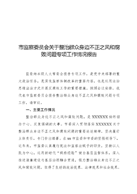 市监察委员会关于整治群众身边不正之风和腐败问题专项工作情况报告监委向本级人大常委会报告专项工作,是党中央部署的重大政治任务,是深化监察体制改革的重要内容,也是运用法治思维法治方式开展反腐败工作的重要措施。按照会议安排,我代表市监察委员会报告整治群众身边不正之风和腐败问题专项工作,请审议。一、主要工作情况整治群众身边不正之风和腐败问题,是XXXXXX始终惦念于心、反复强调的大事。市委深入贯彻落实XXXXXX关于整治群众身边不正之风和腐败问题的重要论述精神,坚决履行主体责任,专门作出部署。在xx市监委和市委的坚强领导下,近年来,市监委认真履行宪法和监察法赋予的职责,坚持以人民为中心,运用新时代枫桥经验健全基层监督体系,深入推进清廉建设与基层治理融合贯通,强力整治群众身边不正之风和腐败问题,取得了良好的政治效果、法律效果和社会效果。(一)保持高压态势,以小切口整治提升群众获得感聚焦政策落地系统开展专项监督。监察工作是政治工作,也是民心工作。紧扣贯彻新发展理念、实现高质量发展等重大决策,紧盯打赢三大攻坚战、减税降费、最多跑一次改革等重大部署,强化日常监督,坚决查纠中梗阻问题,严肃查处啃食群众利益行为。围绕疫情防控、六稳六保等重点工作,加强市镇村三级联动监督,有力保障惠民富民政策在最后一公里落地见效。聚焦群众反映联动实施专项治理。民有所呼,必有所应。积极拓宽信访举报渠道,遵循发现得了,调查得清,处置得好原则,推行就地受理、分流、办理、化解、分析五就地工作法,坚持初信初访和重信重访并重,以办案标准办信、以审理标准把关,实行首办责任制、分级审核制,开展监委班子包案和专项治理。纪检监察信访举报总量、检举控告量、重复举报量、农村信访举报量连年下降,相关做法得到省监委主要领导批示肯定。聚焦重点问题精准推进专项整治。群众期盼处,就是正风反腐的发力点。针对影响群众生产生活最急最忧最盼的具体事具体问题,牵头开展漠视侵害群众利益问题专项整治,紧盯xx个部门xx项重点工作,实行一专项一方案、清单式项目化推进。文可居文库——海量学习资料,手机电脑均可下载www.wenkeju.com紧盯群众身边涉黑涉恶案件背后的腐败、责任和作风问题,督促推进扫黑除恶专项斗争,扎实开展伞网清除行动,获评全省扫黑除恶先进集体。突出失地农民养老保险、宅基地分配、征地拆迁、村级工程等重点事项,健全联席会议、线索移送、重点问题直查直办、案件复查复核等工作机制。民意调测结果显示,群众满意度连续三年位居xx前列。(二)运用新时代枫桥经验,以一体化监督规范基层公权力全面推进监察工作规范化建设。坚持公权力运行到哪里监察监督就跟进到哪里。按照监察体制改革要求,以全覆盖向镇乡(街道)派出监察办、在村社建立监察工作联络站为契机,开展基层监察工作规范化建设,推动有形覆盖向有效覆盖蝶变。全市镇乡(街道)监察办因地制宜建立统一挂牌有标识、独立办公有条件、群众来访有场所、谈话安全有保障、清廉宣传有阵地的五有功能区;健全日常监督、办信办案等系列制度、规程,推动依法运用监察权,全要素使用监察措施;明确村社监察工作联络站主要职责和监督重点,与村(居)务监督委员会一体运作,推动当好前哨和探头。去年xx月,中共中央政治局常委、中央纪委书记赵乐际同志到枫桥调研,对我市基层监察工作规范化建设给予高度评价。文可居文库——海量学习资料,手机电脑均可下载www.wenkeju.com整合基层监察监督力量。坚持共建共治、协同协作,统筹监委机关、派驻机构、镇乡(街道)监察办力量,成立x大协作片区,实行疑难信访会商研判、正风肃纪交叉检查、复杂案件集中攻坚,有效破解基层熟人社会监督难问题。出台加强村社干部监督意见和强化村级监督相关制度,健全镇乡(街道)党(工)委全面监督、包村领导驻村干部日常监督、镇乡(街道)监察办专责监督、市级职能部门业务监督、巡察审计专项监督、村级监察工作联络站贴身监督的六位一体基层监督体系,使监督沉下去,把问题揪出来。强化基层权力数字监督。把信息化手段与传统治理要素结合起来,在全省率先建立基层公权力监督平台。纵向采集基层监察对象基本信息及四种形态处置、出国(境)证照使用等重要数据,实现全市x.x万名监察对象基础数据全归集;横向打破数据壁垒,链接农村三资管理、公共资源交易等x个系统数据,实现重要信息一键查询、核心业务一网通办、数据分析一图成像,相关做法荣获全省基层清廉建设首届创新经验评选第一名。开设小微权力掌上监督平台,村级监察工作联络站利用平台报送有价值信息。围绕村级工程、村级劳务用工等重点,打造基层公权力监督平台x.x版,即将推行监督清白码,着力推动基层监督向整体智治迭代文可居文库——海量学习