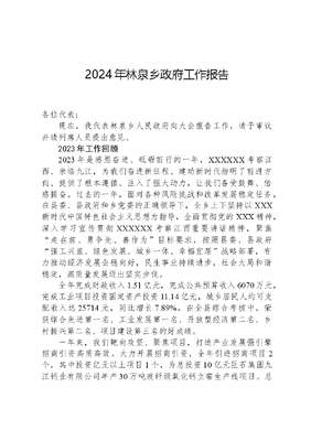 2024年林泉乡政府工作报告各位代表:现在,我代表林泉乡人民政府向大会报告工作,请予审议并请列席人员提出意见。2023年工作回顾2023年是感恩奋进、砥砺前行的一年,XXXXXX考察江西、亲临九江,为我们奋进新征程、建功新时代指明了前进方向、提供了根本遵循、注入了强大动力,让我们备受鼓舞、倍感振奋。过去的一年,面对各种风险挑战和改革发展稳定任务,在县委、县政府和乡党委的正确领导下,全乡上下坚持以XXX新时代中国特色社会主义思想为指导,全面贯彻党的XXX精神,深入学习宣传贯彻XXXXXX考察江西重要讲话精神,聚焦走在前、勇争先、善作为目标要求,按照县委、县政府强工兴旅、绿色发展、城乡一体、幸福宜居战略部署,有力推动经济发展企稳向好,民生事业持续进步,社会大局和谐稳定,高质量发展迈出坚实步伐。全年完成财政收入1.51亿元,完成公共预算收入6070万元,完成工业项目投资固定资产投资11.14亿元,城乡居民人均可支配收入达25714元,同比增长7.89%。在全县综合考核中,荣获综合先进第一名、工业发展第一名、开放型经济第二名、乡村振兴第二名、项目建设第三名的好成绩。一年来,我们靶向攻坚、聚焦项目,打造产业发展强引擎招商引资高质高效。大力开展招商引资,全年引进招商项目2个,其中投资亿元以上项目1个,为总投资10亿元巨石集团九江钙业有限公司年产30万吨玻纤级氧化钙立窑生产线项目。总投资0.2亿元的德安县网络货运数字产业园项目,助力我县网络货运平台和多式联运行业实现零的突破。全年完成批零住餐企业入库2家,个体入库2家,新入库工业项目4.5个,新增规上工业企业3户,新认定战略性新兴产业项目2.5户。项目建设提质增速。全力推动我乡纳入项目大会战的9个项目尽快落地,目前溢明纺织针织布匹项目、星宝新材料织物项目已竣工投产,山深有杏乡村旅游项目已完工。大力支持乡服务企业派美瑞铝业项目代表德安县迎接全市县域经济高质量发展现场推进活动。营商环境持续优化。围绕选择德安、就是心安品牌建设,不断加大对企服务力度,对32家规上企业和限上个体户开展一对一上门帮扶,全年共开展帮扶300余次,收集意见建议10条,解决问题3个,助力企业降本增效、健康发展。一年来,我们统筹兼顾、常抓不懈,绘就乡村振兴新画卷脱贫成果有力巩固。严格落实四个不摘要求,健全完善动态监测帮扶机制,对脱贫不稳定户、边缘易致贫户、突发严重困难户等进行动态监测、动态帮扶,及时消除返贫风险,坚决防止规模性返贫,新增监测对象4户13人,消除风险6户18人。为121户脱贫户发放产业直补资金20.51万元,为90户脱贫户及监测户发放外出务工交通补贴3.52万元,为36户脱贫户申请发放小额信贷177万元,为156人发放困难学生春季教育补助8.29万元,为全乡所有脱贫户共计513人缴纳惠浔保。中央、省、市、县级衔接资金项目共计15个268万元,已全部完工验收并拨付。农业产业稳步发展。完成早稻播种面积549.3亩,中稻面积10400.2亩,晚稻面积521亩,实行稻油轮作5006.9亩。在一乡一园的基础上,坚持以点带面、多点开花,初步形成以食用菌、红薯、生姜种植及加工为主的现代农业产业。全面推进产业配套项目落地。投入100余万元改造清塘村绿色农产品加工基地,投入48万元建设大溪畈村食用菌养文可居文库——海量学习资料,手机电脑均可下载www.wenkeju.com菌房,投资29万元改造林泉村龙虾基地,均已完工并投入使用。乡村品质跨越提升。深挖本地特色文化,在林泉村高家垅投入300余万元高标准打造矿石园,在农业巡回观摩中获得第二,为全县新农村点打造提供林泉样板。协同推进林泉村2组、小溪山村10组、清塘村16组新农村点建设。保护性开发红色文化资源,以弘扬知青文化、传承奋斗精神为主线,建设林泉乡知青文化广场,并成功举办林泉知青建队五十周年专场音乐会。一年来,我们防微杜渐、齐抓共管,守牢除险保安稳定线安全生产平稳有序。牢固树立安全发展理念,全面落实安全生产责任制,加强风险隐患排查整治,坚决遏制安全生产事故发生。完成全乡963个点切坡建房复核,摸清地质灾害隐患。严堵安全生产漏洞,对辖区工矿企业、建筑工地、加油站、餐饮企业等开展安全生产检查60余次,组织暗查暗访12次,查出隐患8条,并全部督促整改到位。平安建设再创佳绩。坚持把平安建设作为一把手工程,常态化开展扫黑除恶工作。投入15万元改造乡村综治中心,让治理手段更加规范化、信息化,有效提升社会治理能力。持续开展普法宣传,全年累计发放各类普法、安全引导等宣传资料4500余份,纸杯、雨伞等宣传纪念品800余件,开展法律讲堂3次,有效提高群众知悉率和参与率。大力开展法治人才培养,全年开展法律明白人培训6次,累计培养法律明白人922人。加强乡