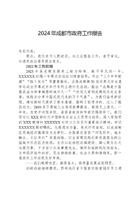 2024年成都市政府工作报告各位代表:现在,我代表市人民政府,向大会报告工作,请予审议,并请市政协委员提出意见。2023年工作回顾2023年是成都发展史上极为特殊、极不平凡的一年,XXXXXX时隔一年再次亲临四川视察指导,作出三个牢牢把握四个发力等重要指示,出席成都第31届世界大学生夏季运动会开幕式并举行系列主场外交活动,指出成都是中国最具活力和幸福感的城市之一欢迎大家到成都街头走走看看,体验并分享中国式现代化的万千气象,为我们奋进新征程、建功新时代提供了根本遵循、指明了前进方向、注入了强劲动力,2100多万蓉城儿女倍受鼓舞振奋、倍感无上荣光。一年来,在党中央国务院、省委省政府和市委坚强领导下,我们坚定以XXX新时代中国特色社会主义思想为指导,深入贯彻党的XXX精神和XXXXXX对四川工作系列重要指示精神,牢记XXXXXX殷切嘱托,化感恩为力量、承关怀而奋起,以成渝地区双城经济圈建设为总牵引,全面落实省委四化同步、城乡融合、五区共兴发展战略,以全面建设践行新发展理念的公园城市示范区为统领,全力以赴拼经济搞建设、凝心聚力办大运展形象、千方百计办实事惠民生、慎终如始防风险保安全,全市经济回升向好、民生持续改善、社会大局和谐稳定,新一届政府工作实现良好开局。——我们砥砺攻坚、接续奋斗,高质量发展成效明显。创新动能持续激发,西部地区首个国家实验室园区开工建设,国家企业技术中心增至62家、居全国城市第4位,全球创新指数排名提升5位至第24位。发展活力加速释放,成为第2个社会消费品零售总额突破1万亿元的省会城市,航空旅客吞吐量7492.4万人次、位居全国城市第3位,获评2023国际化营商环境建设标杆城市。产业建圈强链深入推进,成都发展史上投资体量最大的单体工业项目、总投资630亿元的京东方第8.6代AMOLED生产线项目开工建设,新增2个千亿级产业集群。综合实力持续增强,全国百强区(县)增至12个,一般公共预算收入居副省级城市第4位,地区生产总值超2.2万亿元、增长6%,城市发展位势能级全方位提升。——我们用心用情、民生为先,高品质生活增色添彩。市民健康更有保障,三级甲等医疗卫生机构增至61家、居全国城市第2位,开展全民健身活动超6500场次,生活体育指数排名全国城市第1位。宜居水平稳步提升,新建、改造各类公园113个,天府绿道超7000公里,成为全国第4个轨道交通运营里程突破600公里的城市。群众生活更加丰富,博物馆增至192家、居全国城市第2位,演出活动数量较2019年增长1.2倍、跻身全国音乐演艺第三城,中超比赛上座率居全国第1位、金牌球市在成都雄起的加油声中再次回归蓉城。雪山下的公园城市、烟火里的幸福成都特质更加鲜明,连续15年位居中国最具幸福感城市榜首。——我们主动变革、数字赋能,高效能治理提能增效。精细治理全面深化,微网实格社会治理平台一舱两端实现村(社区)全覆盖,应急管理、民生服务等实现多网合一,微网格员24小时响应率提升至90%以上。政务服务高效便捷,创新集成蓉易+系列服务品牌,12345热线平台快速响应社会诉求超720万件、解决率和满意率均超90%。智慧治理走深走实,市域社会治理现代化试点全面开展,报表文可居文库——海量学习资料,手机电脑均可下载www.wenkeju.com通等195个智慧应用场景上线运行,开展证照临期等主动提醒服务39万次。全国数字百强市排名提升至第5位,智慧蓉城正在成为城市发展最强大脑。——我们万众一心、精益求精,成都大运会圆满成功。全面落实简约、安全、精彩办赛要求,开闭幕式、火炬传递、世界学术大会等重大活动亮点纷呈,14个赛区和大运村高效运行,113个国家和地区的6500多名运动员挥洒激情、相互成就,向全球呈现了一届具有中国特色、时代气息、青春风采的国际体育盛会。人文交流丰富多彩,各国大学生在金沙遗址观展、在熊猫基地打卡、在宽窄巷子看非遗,沉浸式体验中华文明、巴蜀文化的独特魅力,为推动构建人类命运共同体凝聚起澎湃的青春力量。坚持办赛营城兴业惠民一体推进,东安湖、凤凰山等片区成为城市新地标,49个大运场馆服务市民超8万小时,吉祥物蓉宝、显眼包深受市民喜爱,爱成都·迎大运大运有我等活动营造了浓厚的办赛氛围。成都以赛事为媒、以城市为窗,向世界生动展现了中国式现代化的万千气象!一年来,主要开展了以下工作。(一)坚持科技引领、创新驱动,现代化产业体系加快构建科技创新动力强劲。西部(成都)科学城、成渝(兴隆湖)综合性科学中心加快建设,国家高端航空装备技术创新中心正式揭牌,跨尺度矢量光场等5个重大科技基础设施启动建设,全国首个民航科技创新示范区建成投运,首批4家天府实验室实体化运行,新增国家级科技创新平台7家、总
