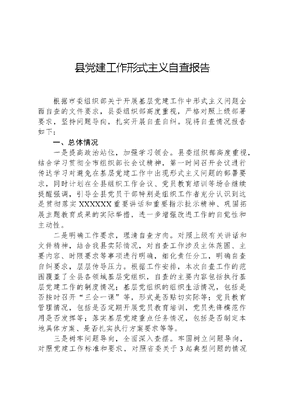 县党建工作形式主义自查报告根据市委组织部关于开展基层党建工作中形式主义问题全面自查的文件要求,县委组织部高度重视,严格对照上级部署要求,坚持问题导向,扎实开展自查自纠。现将自查情况报告如下:一、总体情况一是提高政治站位,加强学习领会。县委组织部高度重视,结合学习贯彻全市组织部长会议精神,第一时间召开会议进行传达学习对避免在基层党建工作中出现形式主义问题的部署要求,同时计划在全县组织工作会议、党员教育培训等场合继续提醒强调,引导全县党员干部特别是组织工作者充分认识到这是贯彻落实XXXXXX重要讲话和重要指示批示精神、巩固拓展主题教育成果的实际举措,进一步增强改进工作的自觉性和主动性。二是明确工作要求,理清自查方向。对照上级有关讲话和文件精神,结合我县实际情况,对自查工作涉及主体范围、主要内容、时限要求等事项进行明确,细化责任分工,明确自查自纠要求,层层传导压力。根据工作安排,本次自查工作的范围覆盖了全县各领域基层党组织,自查的主要内容包括执行基层党建工作的制度情况;基层党组织的组织生活情况,包括是否按时召开三会一课等,形式是否贴切实际等;党员教育管理情况,包括是否定期开展党员教育培训,党员先锋模范作用是否发挥等;落实基层党建重点任务情况,包括是否制定本地具体方案、是否扎实执行方案要求等等。三是树牢问题导向,全面深入查摆。牢固树立问题导向,对照党建工作标准和要求,对照省委关于3起典型问题的情况通报,紧紧围绕打造红旗(模范)党支部、党员队伍教育管理和各领域基层党建重点任务,通过自行排查、实地检查、党员群众代表访谈交流等方式,逐项检查基层党建工作的落实情况。对各地各单位排查出来的问题进行梳理汇总,按照上级关于四个方面问题(是否存在执行政策简单化、上下一般粗,是否存在部署工作层层加码、不考虑基层实际、增加基层干部负担,是否存在以党建为挡箭牌搞精致党务等形式主义问题,是否存在抓工作不深不实、浮于面上,对基层情况不熟悉不了解,平时强调不够、把关不严、督促不到位,导致出现偏差等问题)的标准进行分类甄别。二、自查发现的问题通过全面排查,并对查找出来的问题进行认真梳理分类,县在开展基层党建工作中不存在执行政策简单化、上下一般粗,部署工作层层加码、不考虑基层实际、增加基层干部负担,以及以党建为挡箭牌搞精致党务等形式主义问题。其他问题主要集中在抓工作不深不实、浮于面上,对基层情况不熟悉不了解,平时强调不够、把关不严、督促不到位,导致出现偏差等方面,具体表现如下:1.受党务工作者业务不熟悉、上级指导督导不够细致等因素影响,少数基层党组织在落实基本组织生活制度方面存在理论学习走过场、会议程序不规范等问题。2.由于对基层开展工作监督管理不到位,个别乡镇党委对于县委、县委组织部下发的关于基层党建工作的文件,未结合本地实际完善,制定方案上下一般粗,充当二传手直接转发至农村。3.由于相关领域主管部门党(工)委的指导不够,致使少数机关、乡镇中小学校、卫生院、非公企业等基层党组织,对打造模范机关等重点工作停留于喊口号,缺乏务实可行的工作谋划。4.因思想认识不高、工作责任心不强等原因,在摸排信息、文可居文库——海量学习资料,手机电脑均可下载www.wenkeju.com收集材料等工作中,个别基层党组织存在应付了事的心理,导致上报信息不准确,长期沿用一些旧有数据,影响上级党组织决策部署。三、下一步工作打算为提高基层党建工作的实效性,切实为基层减负赋能,结合自查工作中发现的问题,我县将进一步强化政治自觉,以整治形式主义为基层减负的新成效推动基层党建工作再上新台阶。一是坚持立行立改。坚持把改字贯穿始终,以整改的实际效果检验自查自纠工作成果。针对排查出来的问题,梳理制定问题清单,逐一制定整改措施、提出整改要求、明确整改时限,确保整改到位。坚持查促改,根据自查问题的实际,加强对基层党组织开展党建工作的指导督导,发挥县委基层党建工作指导站职能作用,围绕打造红旗(模范)党支部、开展书记领航行动、落实三会一课和主题党日等制度等重点任务,加大实地指导的力度。二是深化思想认识。深刻认识上级持之以恒抓作风建设、开展基层党建形式主义问题自查工作的重要意义,及时传达学习党中央、省委和市委关于为基层减负工作的决策部署和基层党建各项工作的部署要求,深化认识、统一思想,把整改工作同巩固拓展主题教育成果、开展党纪学习教育结合起来,以实的做法、实的举措推动基层党建工作和减负工作,营造担当实干、奋勇争先的浓厚氛围。三是健全长效机制。坚持标本兼治的理念,把落实整改和完善制度同步推进,既大力整改具体问题,又深挖问题根源,完善规章、堵塞漏洞,推动解决一件事到一类事延伸。写好减负文章,消除过度留痕心理,持之以恒抓好精简文件、压减会议、