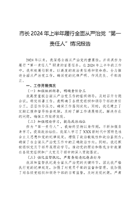 市长2024年上半年履行全面从严治党第一责任人情况报告2024年以来,我深感全面从严治党的重要性,并将其作为履行第一责任人职责的首要任务。在2024年上半年的工作中,我积极履行职责,以高度的政治责任感和使命感,全力推进全面从严治党工作,确保党的纪律严明、作风优良、干部清正。一、工作开展情况(一)加强组织领导,明确责任分工我高度重视全面从严治党工作的组织领导,及时召开专题会议,研究部署工作。我明确了各级党组织和领导干部的责任分工,层层传导压力,确保工作落到实处。同时,我还建立了定期汇报和督导检查机制,及时了解工作进展情况,解决存在的问题,确保工作取得实效。(二)加强理论学习,提高政治站位作为第一责任人,我始终坚持以身作则,不断加强自身学习,提高政治站位。我深入学习了XXX新时代中国特色社会主义思想和党的纪律规定,增强了政治敏锐性和政治鉴别力,确保了在全面从严治党工作中的正确政治方向。同时,我还积极组织党员干部开展理论学习,推动党的理论和路线方针政策在各级党组织和广大党员干部中的深入贯彻落实。(三)强化监督执纪,严肃查处违纪违法行为我深知监督执纪是全面从严治党的关键环节,因此我严格执行党的纪律规定,加强了对党员干部的监督和管理。我加强了对各级党组织和领导干部的日常监督,及时发现问题,严肃查处违纪违法行为。同时,我还注重发挥纪委的作用,加强对纪检干部的培训和管理,提高监督执纪的能力和水平。通过加强监督执纪,有效防止了党员干部违纪违法行为的发生,维护了党的纪律和形象。(四)深化作风建设,营造良好政治生态我深知作风建设是全面从严治党的重要内容,因此我注重从日常工作和生活中抓起,深化作风建设。我倡导勤俭节约、艰苦奋斗的优良传统,坚决反对铺张浪费、奢侈享乐等不良风气。同时,我还加强了对党员干部的日常管理和监督,及时发现和纠正不良行为,确保党员干部始终保持清正廉洁的作风。通过深化作风建设,营造了风清气正的良好政治生态,增强了党员干部的凝聚力和战斗力。(五)加强干部队伍建设,提升履职能力我深知干部队伍建设是全面从严治党的基石,因此我注重加强干部队伍建设,提升履职能力。我坚持正确的用人导向,注重选拔忠诚干净担当的干部,坚决防止带病提拔。同时,我还加强了对干部的培训和管理,通过组织开展各种培训活动,提高干部的专业素养和履职能力。此外,我还注重激发干部的工作热情和创造力,为干部提供良好的工作环境和成长空间,确保干部能够全身心地投入到工作中去,为党和人民的事业作出更大的贡献。(六)加强制度建设,构建长效机制我深知制度建设是全面从严治党的长远之计,因此我注重加强制度建设,构建长效机制。我组织对现有的党内法规进行全面梳理和评估,及时修订和完善不适应新形势新任务要求的法规制度。同时,我还积极推动制度创新,针对全面从严治党中出现的新问题新挑战,及时制定和完善相关法规制度,确保全面从严治党工作有章可循、有据可查。通过加强制度建设,构建了全面从严治党的长效机制,为党的长期执政提供了坚实的制度保障。文可居文库——海量学习资料,手机电脑均可下载www.wenkeju.com二、存在问题和不足在上半年的全面从严治党工作中,我深感还存在一些问题和不足。一是在责任传导上,虽然我已经明确了各级党组织和领导干部的责任分工,但在实际工作中,仍有个别领导干部对全面从严治党的重视程度不够,责任传导不够到位,导致工作进展缓慢。二是在理论学习上,虽然我已经加强了自身学习,并组织了党员干部开展理论学习,但仍有个别党员干部存在学习不够深入、理解不够透彻的问题,影响了全面从严治党工作的深入开展。三是在监督执纪上,虽然我已经加强了监督执纪工作,但仍有个别党员干部存在违纪违法行为,影响了党的形象和威信。这说明我们还需进一步加强监督执纪工作,提高监督执纪的精准性和有效性。四是在作风建设上,虽然我已经倡导了勤俭节约、艰苦奋斗的优良传统,并加强了对党员干部的日常管理和监督,但仍有个别党员干部存在不良行为,影响了党的形象和作风。这说明我们还需进一步深化作风建设,加强党员干部的思想教育和行为引导。五是在干部队伍建设上,虽然我已经注重选拔忠诚干净担当的干部,并加强了对干部的培训和管理,但仍有个别干部存在能力不足、担当精神不够的问题。这说明我们还需进一步加强干部队伍建设,提高干部的专业素养和履职能力。三、下步工作打算针对存在的问题和不足,我将进一步加强全面从严治党工作,确保党的纪律严明、作风优良、干部清正。一是加强责任传导,确保工作落实。我将继续加强组织领导,明确各级党组织和领导干部的责任分工,层层传导压力,确保工作落到实处。同时,我还将建立更加完善的督导检查机文可居文库——海量学习资料,手机电脑均可下载www.wenkeju.com制,加强对工作进展情况的监督和检查,确