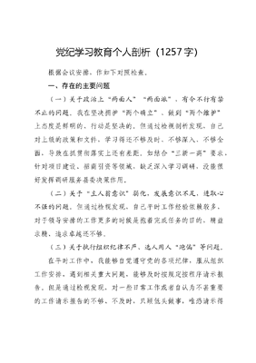 党纪学习教育个人剖析(1257字)根据会议安排,作如下对照检查。一、存在的主要问题(一)关于政治上两面人两面派,有令不行有禁不止的问题。我在坚决拥护两个确立、做到两个维护上态度是鲜明的、行动是坚决的。但通过检视剖析发现,自己对上级的政策和文件,学习得还不够及时、不够深入、不够全面,导致在抓贯彻落实上还有差距。如结合三新一高要求,针对项目建设、招商引资等领域,缺乏深入学习调研,没能很好发挥调研服务县委决策作用。(二)关于主人翁意识弱化,发展意识不足,进取心不强的问题。但通过检视发现,自己平时工作经验依赖较多,对于领导安排的工作更多的时候是抱着完成任务的目的,精益求精、追求卓越还不够。(三)关于执行组织纪律不严、选人用人跑偏等问题。在平时工作中,我能够自觉遵守党的各项纪律,服从组织工作安排,遇到相关重大问题,能够及时按规定按程序请示报告。但是通过检视发现,对一些日常工作或者自认为不甚重要的工作请示报告的不够、不及时,只顾低头做事,唯恐请示得多了,给上级领导造成自己执行力、处理问题能力不强的印象,思想和行动中还一定程度存在变通折中的现象。(四)关于各级党组织和党员干部中存在的四风问题一直以来,我始终以党规党纪为标尺,认真落实严细勤实工作作风,以高度的责任意识履行本职工作。但是通过检视发现,深入基层调研不足,导致起草的个别工作方案不接地气。(五)关于庸懒散浮效率低下等问题。虽然自己能够做到勤恳工作,但偶尔也会有等一等、拖一拖的想法,总觉得上有领导掌舵,下有同志划船,自己只要做好本职工作就行,对一些工作仅满足于安排了就干,没有发挥好自己作为老同志的示范带动作用。(六)关于推拖绕躲担当不足等问题。自己平时对文稿工作关注较多,对其他领域工作有时存在事不关己高高挂起的心态,譬如对于社区疫情防控以及其他志愿活动参与较少,这是自己大局意识缺乏、担当不足的表现。二、产生问题的原因分析(一)理论武装有所松懈。面对新形势、新任务和新要求,对理论学习的重要性缺乏足够认识,没有与时俱进地用党的先进理论来武装头脑、指导自己的言行,存在现用现学、即用即学、不用不学的现象。文可居文库——海量学习资料,手机电脑均可下载www.wenkeju.com(二)党性修养有待提高。自认为坚持原则办事,工作兢兢业业,能够吃苦耐劳,干好日常工作就好,不自觉放松了自我要求,有时以日常事务性工作代替了经常性的党性锻炼,没有做到持续自我净化、自我完善、自我革新和自我提高。(三)斗争精神有所弱化。长年累月从事文字工作,接受其他岗位的锻炼较少,追求四平八稳的心态有所上升,伴随着本领恐慌和能力不足,以前那种不服输、敢打敢拼的冲劲有所弱化。三、下步整改措施(一)加强思想政治建设。始终把两个确立作为最深刻的政治领悟、政治信念,坚决做到两个维护,持续在学懂弄通做实XXX新时代中国特色社会主义思想上下功夫,不断提升政治判断力、政治领悟力、政治执行力。(二)全面提升履职能力。向领导学、向优秀学,向基层学、向实践学,在总结、反思和体悟中,改进工作方法,提升工作能力。文可居文库——海量学习资料,手机电脑均可下载www.wenkeju.com