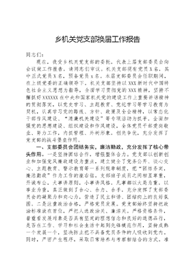 乡机关党支部换届工作报告同志们:现在,我受乡机关党支部的委托,代表上届支部委员会向会议做工作报告,请同志们审议。机关支部现有党员X名,其中正式党员X名,预备党员x名。本届支部委员会任职期间,在上级党委的正确领导下,机关支部坚持以XXX新时代中国特色社会主义思想为指导,全面学习贯彻党的XXX精神,坚持不懈抓好XXXXXX在中央和国家机关党的建设工作上重要讲话精神的贯彻落实,以党史学习、主题教育、党纪学习等学习教育为契机,认真学习党的路线、方针、政策及全会精神,以常态化干部作风建设、清廉机关建设等专项活动为抓手,全面加强党的思想建设、组织建设和作风建设,全体党员干部爱岗敬业、努力工作,内抓管理、外树形象,创先争优,充分发挥了党支部的战斗堡垒作用。一、支部委员会团结务实,廉洁勤政,充分发挥了核心带头作用。一是坚持团结合作,增强整体合力。党支部以创新创业和加强党风廉政建设为重点,建立健全了党务公开、谈心交心、主题教育、警示教育等一系列规章制度,把团结务实,廉洁勤政作为工作的座右铭。支部班子成员之间相互尊重,开诚布公,大事讲原则,小事讲风格,凡事都以大局为重,以事业为重,真正做到了合心、合力、合手,充分发挥了支部委员会的凝聚力和向心力,营造了民主和谐、团结向上的良好氛围。二是注重政治合格,严格党员发展。党支部始终坚持把政治标准放在首位,严把人选政治关、廉洁关。严格资格条件,着重看发展