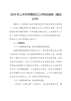 2024年上半年思想政治工作情况报告(集团公司)2024年,我集团公司在市委市政府和市国资委的正确领导下,坚持以XXX新时代中国特色社会主义思想为指导,深入贯彻落实党的XXX精神,牢牢把握正确的方向,全力服务中心大局,坚持以思想政治工作引领集团公司市场化转型改革发展。现将有关工作开展情况汇报如下:一、主要做法(一)坚持党管思想,抓牢思想政治领导权集团党委高度重视思想政治工作,始终将其摆在突出位置不断完善工作机制。成立集团思想政治工作领导小组,由党委书记、董事长负总责,分管党建工作的班子成员具体管、各党支部书记直接抓,形成了各级党组织齐抓共管的态势。加强对思想政治领域重大问题的分析研判,将思想政治工作与意识形态工作、党风廉政建设、企业改革深化提升、防范与化解重大风险等重要工作及日常业务工作紧密结合,上半年专题研究意识形态有关问题2次,进一步筑牢思想政治防线。(二)注重思想引领,强化理论武装一是突出关键少数引领学习。充分发挥党委成员、理论学习中心组成员关键少数的示范带动作用,制定年度理论中心组学习计划,坚持把读原著、学原文、悟原理贯穿学习始终,着力在学懂弄通坐实上下功夫。今年以来召开党委会xx次,组织开展第一议题内容学习xx项,学习有关会议和文件精神xx项,共组织开展中心组学习研讨x次,重点发言xx人次。二是抓好集中理论学习。严格落实好支部三会一课、主题党日活动,常