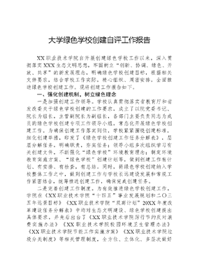大学绿色学校创建自评工作报告XX职业技术学院自开展创建绿色学校工作以来,深入贯彻落实XXX生态文明思想,牢固树立创新、协调、绿色、开放、共享的新发展理念,明确绿色学校创建目标,根据相关文件要求,结合学校工作实际,精心组织、周密安排,全面推进绿色学校创建工作。现将创建工作报告如下。一、强化创建机制,树立绿色理念一是加强创建工作领导。学校认真贯彻落实省教育厅和省发改委关于绿色学校创建的工作要求,成立了以院党委书记、院长为组长,主管副院长为副组长,各部门主要负责同志为成员的绿色学校创建专项工作领导小组,常态化开展绿色学校创建工作。为确保创建工作落实到位,学校紧紧围绕创建标准,细化创建举措,印发了《绿色学校创建工作任务分解表》,层层分解任务,明确职责,夯实任务;领导小组多次组织学习有关创建文件,不断强化绿色学校环境教育理念;制定环境教育实施方案、绿色学校创建计划等,做到创建工作有计划、有安排、有检查,有总结。同时,将绿色学校创建纳入学校整体工作之中,做到创建工作与学校长远建设发展和常规工作紧密结合,统筹推进创建工作,确保完成创建任务。二是完善创建工作制度。为有效推进绿色学校创建工作,学院在《XX职业技术学院十四五事业发展规划和二〇三五年远景目标》《XX职业技术学院双高计划20XX年度改革建设任务分解表》中均对生态文明建设、绿色学校创建提出具体要求,并先后出台了《XX职业技术学院厉行节约反对浪费实施办法》《XX职业技术学院校园环境卫生管理办法》《XX职业技术学院节能工作实施方案》《XX职业技术学院垃圾分类制度》等相关管理制度,全方位、立体化、多层次做好绿色、低碳校园建设发展规划,努力为提升师生生态文明素养及全社会生态文明建设做出贡献。三是强化督促检查力度。学校成立以来,高度重视绿色学校创建工作,经常性聚焦绿色学校创建重点领域和薄弱环节,以绿色理念课程建设、节能减排校园建设、绿色环保校园建设为主线,以创建工作推进情况和实施效果为标准,将绿色学校创建融入校园建设、规划、管理、运行、维护等各个环节,常态化开展自查自评,加强督查力度,发现问题立即整改,并及时总结有益经验,积极推广宣传,确保绿色学校创建工作统筹推进,出实招、见实效。20XX年XX月被国家机关事务管理局国家发改委、财政部联合授予为全国节约型公共机构示范单位。二、丰富创建载体,营造浓厚氛围一是大力开展生态文明教育宣传。学校将绿色学校创建融入校园文化建设,把生态文明教育融入学校育人全过程,组织召开创建绿色学校学生座谈会;开展节能宣传周保护地球一小时等宣传教育活动;定期举办绿化美化图片展、绿化技能竞赛等活动;要求各二级学院以主题团日活动、主题团课、班会、集体劳动等形式覆盖全体学生,将绿色学校建设与基层组织建设紧密结合,增强集体凝聚力,营造良好生态文明氛围。二是开展生态文明教育实践活动。充分发挥学生组织和志愿者作用,持续推动绿色学校建设的科学研究与社会实践活动相结合,结合专业特色引领学生以科技服务三农,助推乡村振兴,先后组织开展了以践行两山理论,建设美丽校园和我的校园我绿化为主题的春季植树活动,以守卫绿色家园,共建美丽陕西为主题的生态环境保护实践活动、参加以美丽中国,青春行动为主题的秦岭沿线省际区域联合行动——陕西省第三届秦岭生态环境保护青年论坛暨20XX年秦岭环保志愿行动示范活动;在全院经常性开展光盘行动、大学生进餐厅帮厨等活动;并邀请学院优秀校友、全国技文可居文库——海量学习资料,手机电脑均可下载www.wenkeju.com术能手XX来校传授飞防技能。通过一系列活动开展,培养了学生的绿色环保意识和吃苦耐劳精神,激发了学生亲自动手创建美好校园的热情。三是推动生态文明教育进课堂。围绕创建目标,根据学生的认知水平和成长规律等,将生态文明、绿色发展、资源节约、环境保护等相关知识纳入教学课堂,开设《生态文明》《劳动教育》等X门通识课程及《园林植物保护》《化工安全与环保》等XX门相关专业课程。同时,在选修课和部分专业课等课程设置中将环境教育、生态保护等绿色课程理念纳入其中,不断提升学生生态文明建设和环境保护意识。三、加大建设力度,实施育人环境一是加大资金投入。多年来,学校始终坚持践行生态文明理念,走绿色低碳发展道路,制定了科学的实施方案。近X年投入绿色低碳环保方面资金XXX余万元,用于购置节能节水设备、绿色科研活动、节水节能设施的修缮和改造、人员培训、绿色宣传等方面。二是强化资源管护。学校高度重视绿色成果管护,不断加强对校园用能设备及校园绿地的养护管理。建立健全节能运行管理制度和用能系统操作规程,加强用能系统和设备运行调节、维护保养、巡视检查,推行低成本节能措施,提高用能设备使用效率。积极开展校园绿植土肥水管理、花果管理