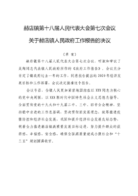 赫店镇第十八届人民代表大会第七次会议关于赫店镇人民政府工作报告的决议(草 案)赫店镇第十八届人民代表大会第七次会议,听取和审议了吴翔同志代表镇人民政府所作的《政府工作报告》。会议充分肯定了镇政府过去一年的工作,同意报告提出的2020年经济发展目标和工作部署,会议决定批准这个报告。会议号召,全镇人民更加紧密地团结在以XXX同志为核心的党中央周围,以XXX新时代中国特色社会主义思想为指导,全面贯彻党的十九大和十九届二中、三中、四中全会精神,坚持稳中求进的工作总基调,坚决贯彻新发展理念,统筹推进疫情防控和经济社会发展,巩固和提升经济社会发展良好态势,朝着全力推进赫店镇高质量发展目标迈进,努力提升群众的获得感、幸福感、安全感,确保全面高质量建成小康社会和十三五规划圆满收官。