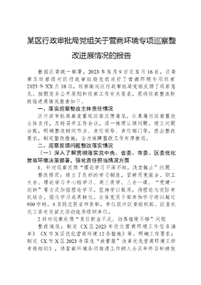 某区行政审批局党组关于营商环境专项巡察整改进展情况的报告根据区委统一部署,2023年X月9日至X月16日,区委第五巡察组对区行政审批局党组进行了营商环境专项巡察2023年XX月18日,巡察组向区行政审批局党组反馈了巡察意见。按照党务公开原则和巡察工作有关要求,现将巡察整改阶段性进展情况报告如下。一、落实巡察整改主体责任情况区行政审批局高度重视巡察反馈意见,认真履行巡察整改主体责任,及时召开工作会议,逐一梳理认领问题。建立问题台账,明确整改时间节点、责任领导、责任部门等,提出整改要求,制定整改措施,全力保障整改工作有序推进。二、巡察反馈问题整改落实情况(一)深入了解贯彻落实党中央、省委、市委、区委优化营商环境决策部署,强化责任担当情况方面1.针对巡察反馈理论学习不深不细,浅尝辄止问题整改情况:建立了良好的学习制度,坚持用党组会、职工大会、理论学习中心组学习、周三夜学、三会一课、党建一刻钟等方式加强理论学习。坚持学以致用,将理论与实际有机结合,强化学习成果转化。全体党员干部参加学习培训超过900学时,4名同志获省市表彰,单位获评区委组织部、区直机关工委有奖征文活动优秀组织单位。2.针对巡察反馈责任担当不足,动真碰硬不够问题整改情况:制定《X区2023年优化营商环境工作任务清单》《X市X区优化营商环境12条措施》等,明确工作要求;制定《X市X区2023年深化放管服改革优化营商环境工作考核细则》,将营商环境各项推进工作纳入全区年终目标绩效考核。2023年,召开相关工作部署会4次,配合联考联评机制向区委组织部报送营商环境工作正面典型(单位)19个,负面典型(单位)16个。(二)深入了解营造便捷的政务环境、公平的市场环境、稳定的法治环境、暖心的人文环境,不断提升企业和群众满意度、获得感情况方面3.针对巡察反馈履职尽责不到位,工作落实有差距问题整改情况:一是建立工程审批分阶段牵头负责的配合工作机制,进一步明确各审批阶段牵头单位、配合单位责任。如:工程立项用地规划阶段、工程建设许可阶段由区自然资源局牵头负责,其余部门配合;施工许可阶段由行政审批局负责,其余部门配合等。同时建立工程建设项目审批工作群,成立了X区项目审批工作专班,负责协调项目工程审批中存在的问题。进一步完善了工程审批专区建设,综合窗口受理的集中度大幅提高,规范了工程审批专区的运行,加大了项目建设并联水平力度,并联审批占比达100%;先后3次开展工程建设审批平台使用专项培训,相关部门的办件准确率较以前大幅提升。二是科学制定《X市X区2023年优化营商环境面对面专题座谈会实施方案》,由有关行业主管部门按期组织召开专题座谈会,建立诉求解决台账,每月跟踪处理进展情况,落实闭环管理。2023年,X区开展面对面专题座谈会11场,组织召开X市面对面X区政府专场座谈会1场,共召集140家企业,收集诉求171条,已解决完成138条。三是加大工作督促和考核,针对营商环境工作推进不力、配合度差的单位以月度问题清单形式报送区委组织部加以通报,及时将收集的企业诉求以文件或转办单的形式转办相关责任单位,对办理滞后的单位发函督办。发出督办函2次,发诉求转办单(函)11份。4.针对巡察反馈深化改革不彻底,政务服务不便捷问题文可居文库——海量学习资料,手机电脑均可下载www.wenkeju.com整改情况:扎实推进互联网+政务服务,实现服务事项提速94.11%,材料减免率47.11%,即办率77.12%,一次办100%,企业开办4小时内办结。全年净增市场主体11623家,累计达到49655家。区行政审批局被评为全省政务服务一网通办工作先进集体,区公共资源交易服务中心被评为全省公共资源交易服务标杆。(三)深入了解党员干部工作作风和廉洁从政情况,推动构建亲清政商关系方面5.针对巡察反馈人员管理不严,服务意识不强问题。整改情况:一是加强了干部职工理想信念教育,牢固树立了群众观念,服务意识增强。政务服务质效明显提升,群众满意度提高。二是加强了大厅作风建设,进一步规范了言行,严明了工作纪律。把微笑服务、热情服务贯穿到工作中,给予热情、耐心、细致、准确的服务,确保在为民服务过程中树立窗口人员的良好形象。全年咨询、投诉共计68件次,其中上半年42件次,占比62%,下半年26件次,占比38%,下降24%。三是加强了督查检查力度,利用监督一刻钟等机制对政务服务大厅各办事窗口工作人员在岗、履行工作职责、遵守工作纪律等方面进行了督查检查。对违反工作纪律的干部运用第一种形态谈话两次。6.针对巡察反馈体制机制不顺,权责配置不明问题。整改情况:与区政府办、区委编办协调,理顺工作关系,新增3名劳务派遣工作人员,充实人员力量,用于充实惠企政策集成服务改革工作。三、巩固和