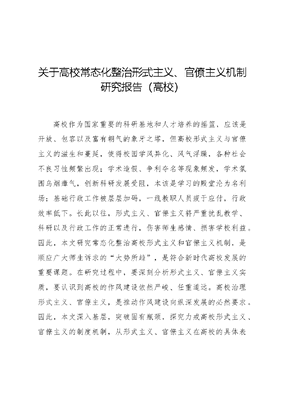 关于高校常态化整治形式主义、官僚主义机制研究报告(高校)高校作为国家重要的科研基地和人才培养的摇篮,应该是开放、包容以及富有朝气的象牙之塔,但高校形式主义与官僚主义的滋生和蔓延,使得校园学风异化、风气浮躁,各种社会不良习性频繁出现;学术造假、争利夺名等现象频发,学术氛围乌烟瘴气,创新科研发展受阻,本该是学习的殿堂沦为名利场;基础行政工作被层层加码,一线教职人员疲于应付,行政效率低下。长此以往,形式主义、官僚主义将严重扰乱教学、科研以及行政工作的正常进行,伤害师生感情、损害学校利益。因此,本文研究常态化整治高校形式主义和官僚主义机制,是顺应广大师生诉求的大势所趋,是符合新时代高校发展的重要课题。在研究过程中,要深刻分析形式主义、官僚主义实质,要认识到高校的作风建设依然严峻、任重道远。高校治理形式主义、官僚主义,是推动作风建设向纵深发展的必然要求。因此,本文深入基层,突破固有瓶颈,探究力戒高校形式主义、官僚主义的制度机制,从形式主义、官僚主义在高校的具体表现、整治高校形式主义与官僚主义的制度措施展开,风气养成重在日常教化,作风建设贵在常抓不懈。为常态化整治形式主义、官僚主义提供意见和建议。一、形式主义、官僚主义的根源实质和治理意义XXXXXX有关力戒形式主义、官僚主义的重大论断极具深刻性和指导性,一针见血、旗帜鲜明阐述了什么是形式主义、官僚主义。形式主义实质是主观主义、功利主义,根源是政绩观错位、责任心缺失。官僚主义实质是封建残余思想作祟,根源是官本位思想严重、权力观扭曲。政绩观错位、责任心缺失一针见血得指出了形式主义的起源在于知行不一,过分关注是否对自己的政绩有利、是否能够让上级满意这些表面形式,不讲究现实效应和是否真正让人民群众享有良好的管理服务;官本位思想严重、权力观扭曲直截了当控诉官僚主义者个人主义盛行、利己之心极重,做官是想当老爷,假公济私,损害人民利益,背离服务宗旨。实际上,形式主义与官僚主义互相有着密切的关联,二者相辅相成、狼狈为奸,往往同时出现,滋生壮大,并导致严重的后果。形式主义的出现,造成独断专行、不顾现实的官僚主义泛滥;官僚主义的出现,使得好逸恶劳、爱慕虚荣的形式主义繁殖。形式主义、官僚主义同我们党的性质宗旨和优良文可居文库——海量学习资料,手机电脑均可下载www.wenkeju.com作风水火不容,是理想信念动摇、作风建设不牢、政治站位偏差的具体表征,败坏社会风气、腐蚀党风政风。XXXXXX一再强调,要把力戒形式主义、官僚主义作为加强党的作风建设的重要任务。在十九届中央纪委三次全会上,又明确将整治形式主义、官僚主义纳入党的政治建设的重要任务。常态化整治形式主义、官僚主义关系党风政风,形式、官僚两风的突出表现,或口号喊得震天响、表面功夫做得人尽皆知,或谄媚献忠、溜须拍马、颐指气使的风气肆虐成灾。严重妨碍高校日常工作的开展、阻塞政令畅通,丧失师生对于高校管理的信任,侵害师生的根本利益。二、高校形式主义、官僚主义的具体表现通过深入调查研究,进一步认识形式主义、官僚主义在高校中的具体表现,探讨高校常态化整治形式主义、官僚主义的有效措施。课题组以高校纪检监察机关的名义发布《关于形式主义、官僚主义调查问卷》(其中分为教师卷和学生卷两个部分),通过问卷星平台创建线上问卷,通过聊天软件、线下填写等渠道发放调查问卷,共计发放形式主义、官僚主义问卷xxxx份。其中回收高校中层领导干部、党政机关和各院系教师、后勤部门及实验室职员填写教师问卷xxx份,回收在校学生填写学生问卷xxxx份。调查问卷教师卷调研内容包括教学管文可居文库——海量学习资料,手机电脑均可下载www.wenkeju.com理、人才培养、基层任务、后勤保障、党务工作等方面,涉及教务处、人事处、组织部、后勤管理处等高校管理服务部门。学生卷调研内容主要围绕学生日常活动和管理以及后勤服务保障。经过仔细梳理收集到的高校形式主义、官僚主义突出问题对汇集的各项调研数据进行频数分类和归纳总结,归总整理出亟需常态化重点整治的高校形式主义、官僚主义九个具体表现,对于研究高校形式主义、官僚主义现象有着重要借鉴意义。1.对中央和高校各项政策工作贯彻落实不到位。对中央重大决策部署传达不及时、措施不得力。对于发布的通知安排空喊口号、行动迟缓、研究不够、推进不力。在高校的日常工作开展中不顾实际情况、不经科学论证,不深入基层了解实际问题、了解师生真实需求。不作为、慢作为,做表面功夫,遇到难题却绕着走。2.理论学习不够扎实,对XXX新时代中国特色社会主义思想和十九届六中全会精神学习领悟不够。组织开展各项学习活动敷衍推脱,部门院系学习制度不健全、学习考核标准较缺乏。对于要求开展的党史学习教育、党风廉政学习执行不严格、落实不到位,学风不实,重形