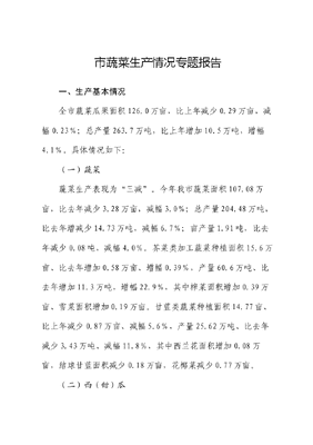 市蔬菜生产情况专题报告一、生产基本情况全市蔬菜瓜果面积126.0万亩,比上年减少0.29万亩,减幅0.23%;总产量263.7万吨,比上年增加10.5万吨,增幅4.1%。具体情况如下:(一)蔬菜蔬菜生产表现为三减。今年我市蔬菜面积107.08万亩,比去年减少3.28万亩,减幅3.0%;总产量204.48万吨,比去年增减少14.73万吨,减幅6.7%;亩产量1.91吨,比去年减少0.08吨,减幅4.0%。芥菜类加工蔬菜种植面积15.6万亩、比去年增加0.58万亩、增幅0.39%,产量60.6万吨、比去年增加11.3万吨,增幅22.9%,其中榨菜面积增加0.39万亩、雪菜面积增加0.19万亩。甘蓝类蔬菜种植面积14.77亩、比上年减少0.87万亩、减幅5.6%,产量25.62万吨、比去年减少3.43万吨、减幅11.8%,其中西兰花面积增加0.08万亩,结球甘蓝面积减少0.18万亩,花椰菜减少0.77万亩。(二)西(甜)瓜西(甜)瓜生产表现为一减两增。今年我市西(甜)瓜面积为17.92万亩,比去年减少0.62万亩,减幅3.3%;总产量为35.1万吨,比去年增加0.81万吨,增幅2.4%;单产1.96吨,比去年增加0.11吨,增幅5.9%。其中西瓜种植面积为13.81万亩、比去年减少0.37万亩、减少2.6%,总产为30.6万吨、比去年增加2.4万吨、增幅8.5%;甜瓜种植面积为4.11万亩、比去年增减少0.26万亩、减幅5.9%,总产量为5.04万吨、比去年减少1.04万吨、减幅17.1%。二、主要工作措施和成效(一)抓示范推广,加快蔬菜绿色生产技术应用。积极开展蔬菜集约化育苗、水肥一体化、设施蔬菜连作障碍防控、轻简化省力化、病虫害绿色防控等技术的示范推广,全市瓜菜绿色生产技术应用面积约88万亩次,全市集约化育苗中心18个,集约化育苗总量达4.2亿株。目前防虫网、遮阳网、黄板、杀虫灯以及喷滴灌等应用广泛,极大地提升了基地病虫害防御和生产的能力,保障了蔬果的稳产和品质安全;鲜食大豆全程机械化、榨菜直播、西甜瓜肥水一体化、瓜类攀爬网、蜜文可居文库——海量学习资料,手机电脑均可下载www.wenkeju.com蜂授粉、全生物降解膜应用等轻简化栽培技术示范推广进一步扩大,蔬菜瓜果轻简化程度显著增加。同时积极开展优良瓜菜新品种引进与示范推广,2022年引进瓜菜新新品100余个,多点开展试验与示范推广,进一步推进调优瓜菜种植结构和品种结构。(二)抓项目实施,加快技术创新与推广应用。制定全市蔬菜产业团队工作方案,围绕目标任务,为推动蔬菜瓜果产业高质量发展,开展水果番茄、高架草莓、鲜食大豆、瓜菜集约化育苗、南方哈密瓜、稻菜轮作等关键技术研究与示范推广,组织技术培训和观摩交流实现技术快速入户到田,切实提高蔬菜生产技术到位率,助推全市蔬菜产业高质量发展。项目实施以来,共建立8个示范点,核心示范面积约600亩,筛选出高品质品种20余个,累计现场观摩与培训约30次,培训1000余人次。通过项目实施和技术推广,我市水果型番茄面积约8000亩,平均亩产值高达3.7万元,其中精品水果番茄亩产值高达8万元,经济效益有效大提高。文可居文库——海量学习资料,手机电脑均可下载www.wenkeju.com(三)抓精品评选,加快新品种推广和品牌推介。为引导我市蔬菜瓜果生产向优质化、精品化方向发展,我市近两年举办7次精品草莓、精品番茄、精品西甜瓜、精品叶菜等推选活动和10余次精品产品及新品种展示活动,对推选出的金奖产品和银奖产品,在X日报、甬派等我市主流媒体上加大宣传,扩大新优品种和精品产品影响面,进一步推进新优新品推广,提高精品品牌效应和生产效益;同时积极组织参加省级精品评选活动,近两年3次参加全省精品评选,荣获金奖11个,约占全省金奖总数的25%。通过各种精品评选和产品展示的示范带动和宣传引导,扩大地产优质蔬菜知名度,激发农户种植优质产品积极性,推进我市蔬菜瓜果产业健康发展。三、存在主要问题(一)部分蔬菜基地基础设施薄弱,抗灾能力还不够强。近年来,极端天气频发,一些蔬菜基地抗洪涝灾害设施缺失或老旧,不能及时有效排除雨水,常常造成蔬菜生产效益损失。文可居文库——海量学习资料,手机电脑均可下载www.wenkeju.com(二)随着生产成本不断增加,增收压力较大。蔬菜产业是典型的劳动密集型产业,随着农村劳动力的不断转移,蔬菜生产劳动力越来越紧缺,劳动力老龄化严重,加之生产资料及劳动力成本逐年提高,菜农增收难度逐步加大。另外由于蔬菜流通环节多成本高,时常出现蔬菜产地价格偏低而市场零售价格较高的现象,致使菜贱伤农、菜贵伤民的现象并存。(三)土壤连作障碍突出,治理技术应用难。在土地资源紧张、追求利益最大化、土壤处
